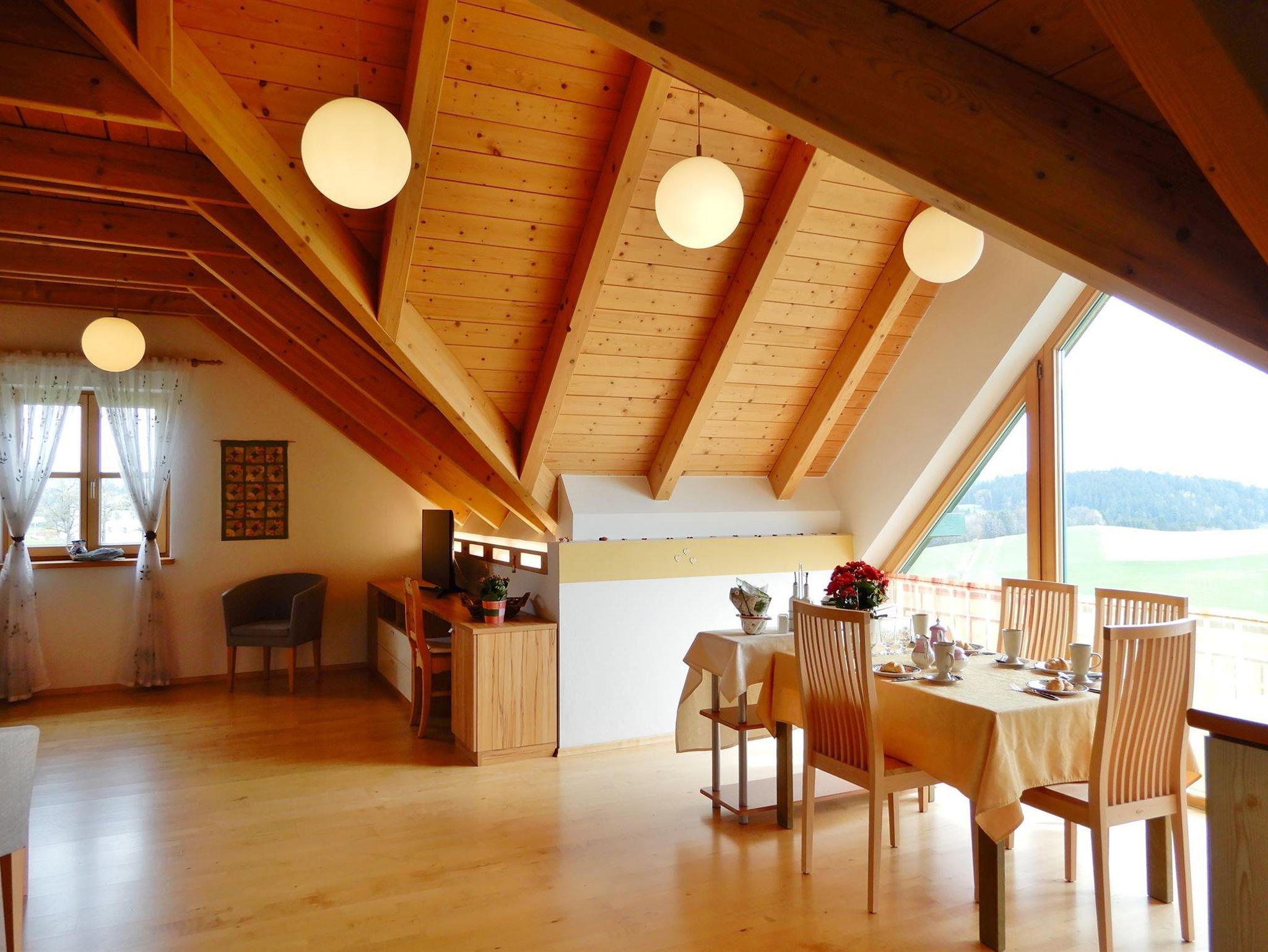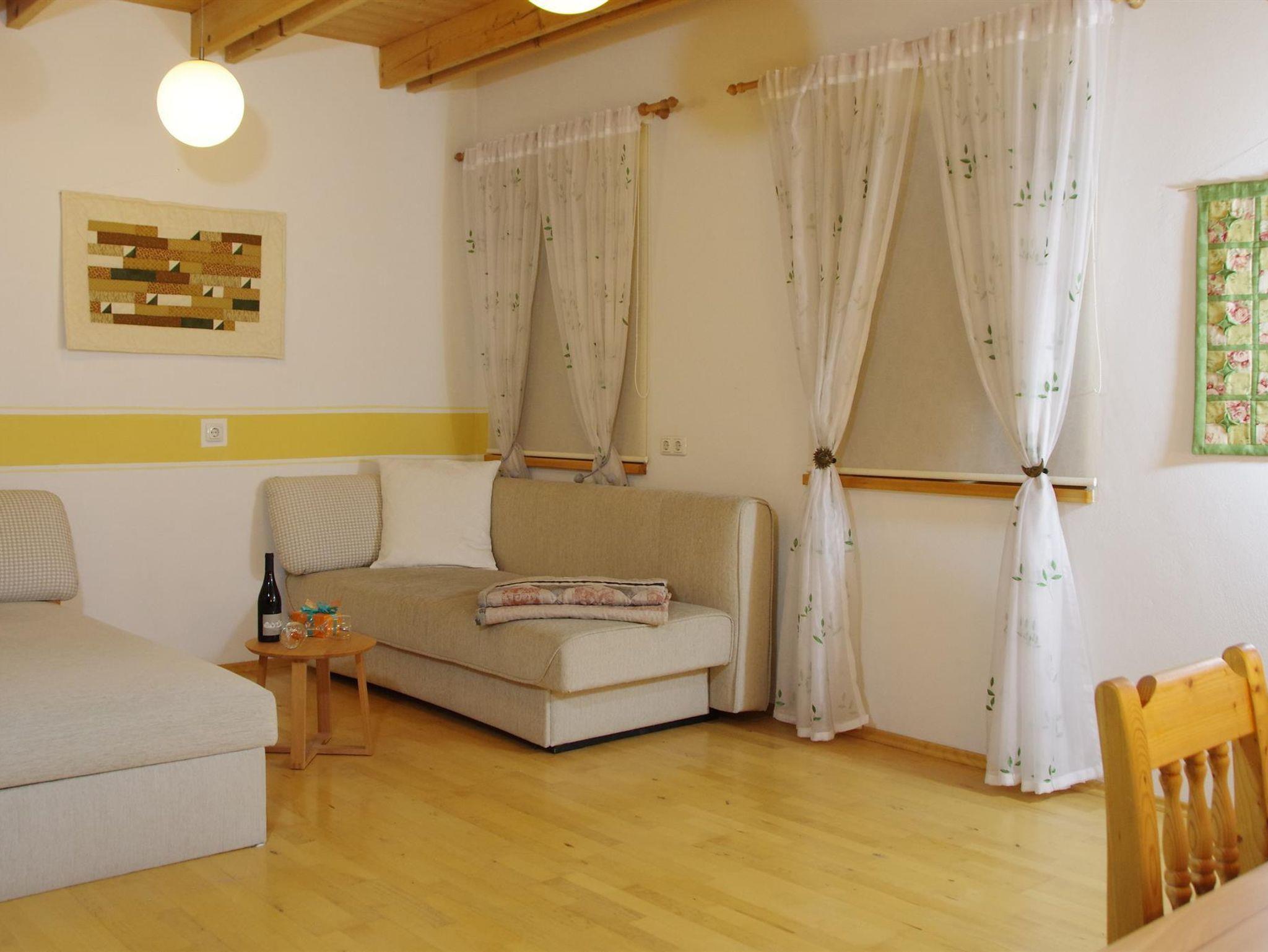 Unsere Ferienwohnung eignet sich bestens für Familien und Pärchen. Die gesamte Wohnung verfügt über einen eigenen Eingang. Sie wohnen im ersten Stock in einer ca. 70m² großen und lichtdurchflutenden Wohnung mit einem Schlafzimmer inkl. Doppelbett. Die Wohnung umfasst einen Wohnschlafraum mit Ausziehcouch für 2 Personen und Sitzgruppe sowie Bad/WC und Vorraum. Die Küche ist modern ausgestattet mit E-Herd und Holzherd, Kühlschrank und Kaffeemaschine sowie reichlich Geschirr und Tischwäsche. Für Ihre gemütlichen Stunden erwartet Sie ein lichtdurchflutetes, helles Wohnzimmer mit Sitzgruppe und großzügigem Essplatz.