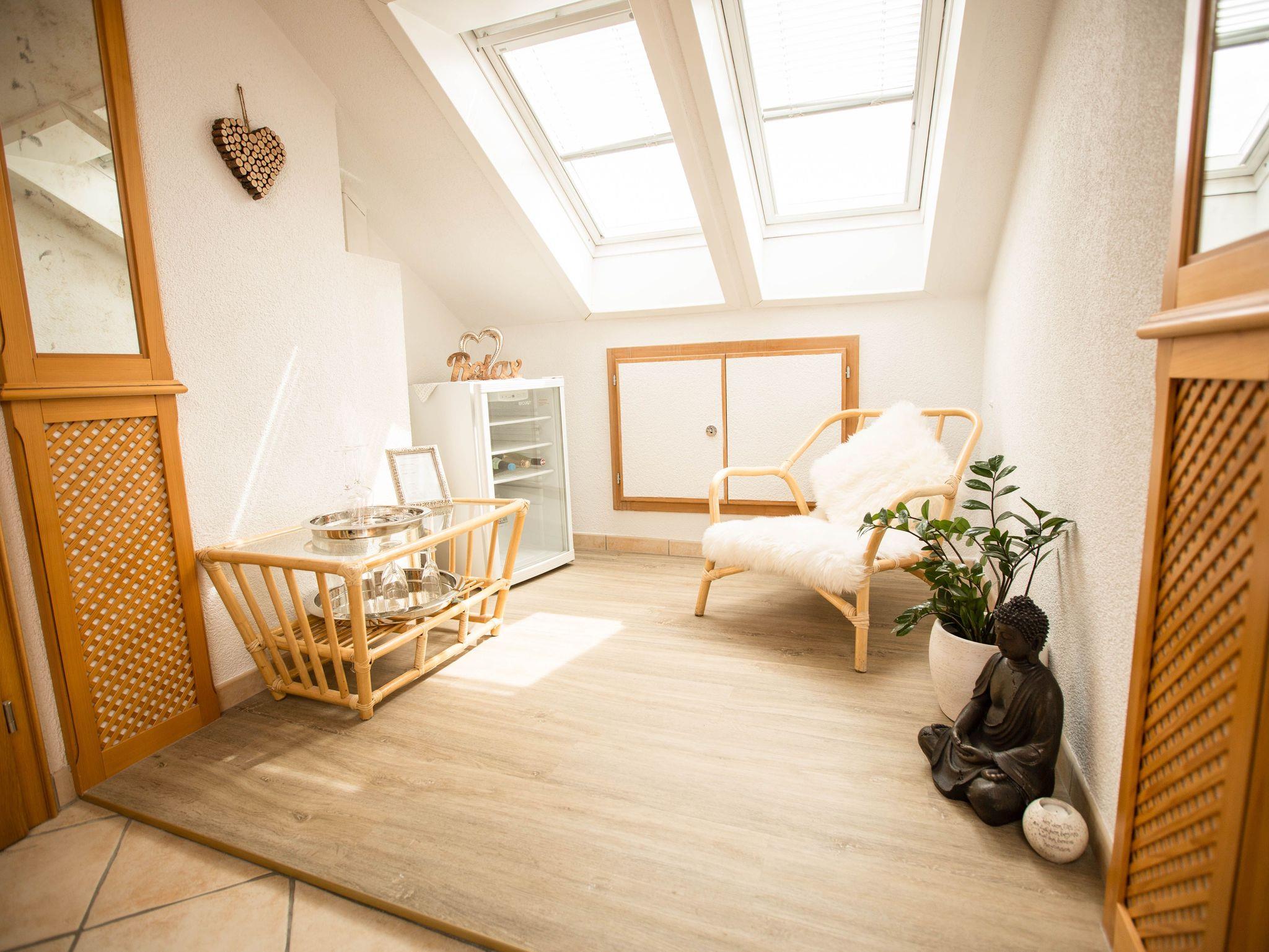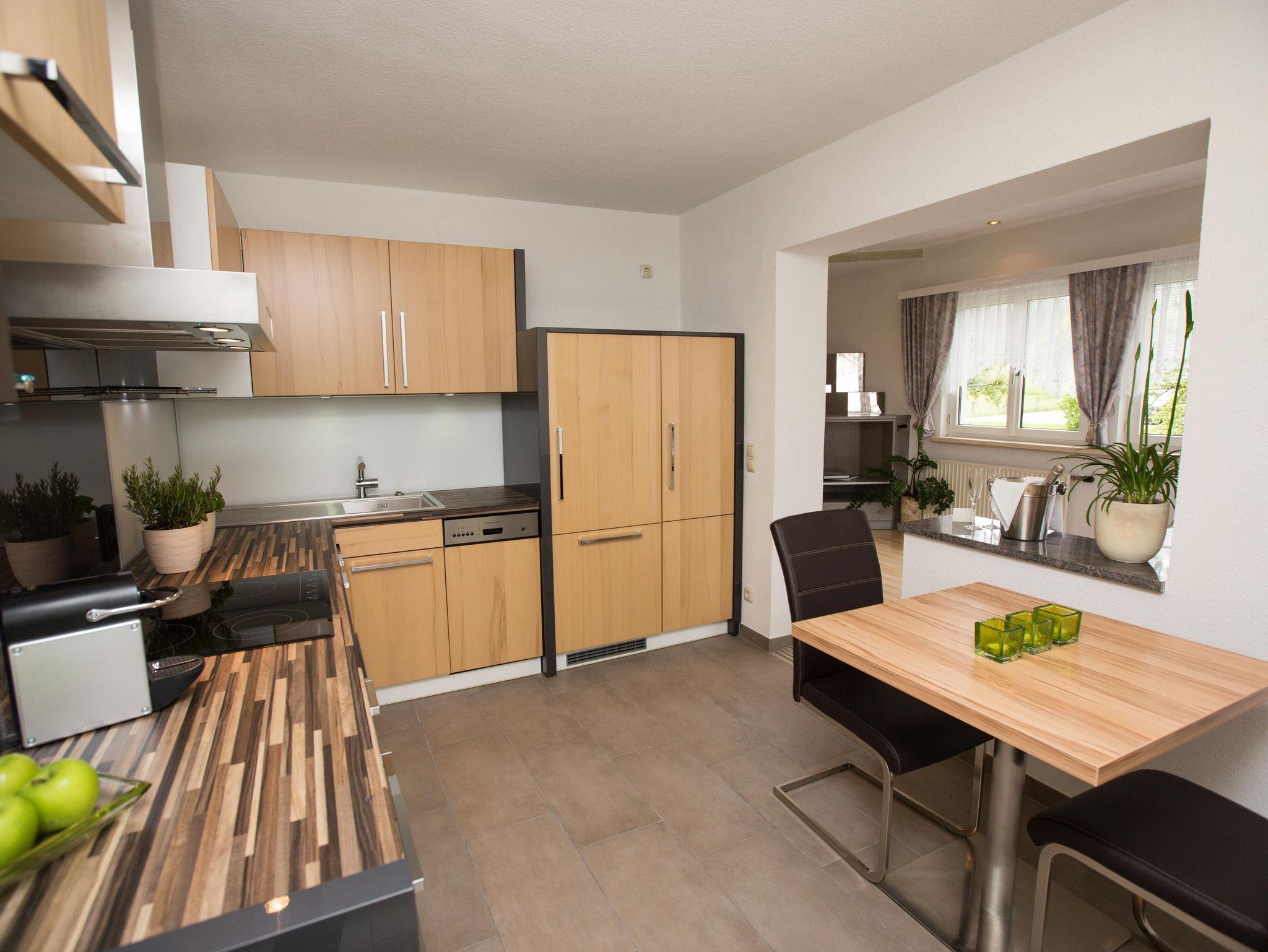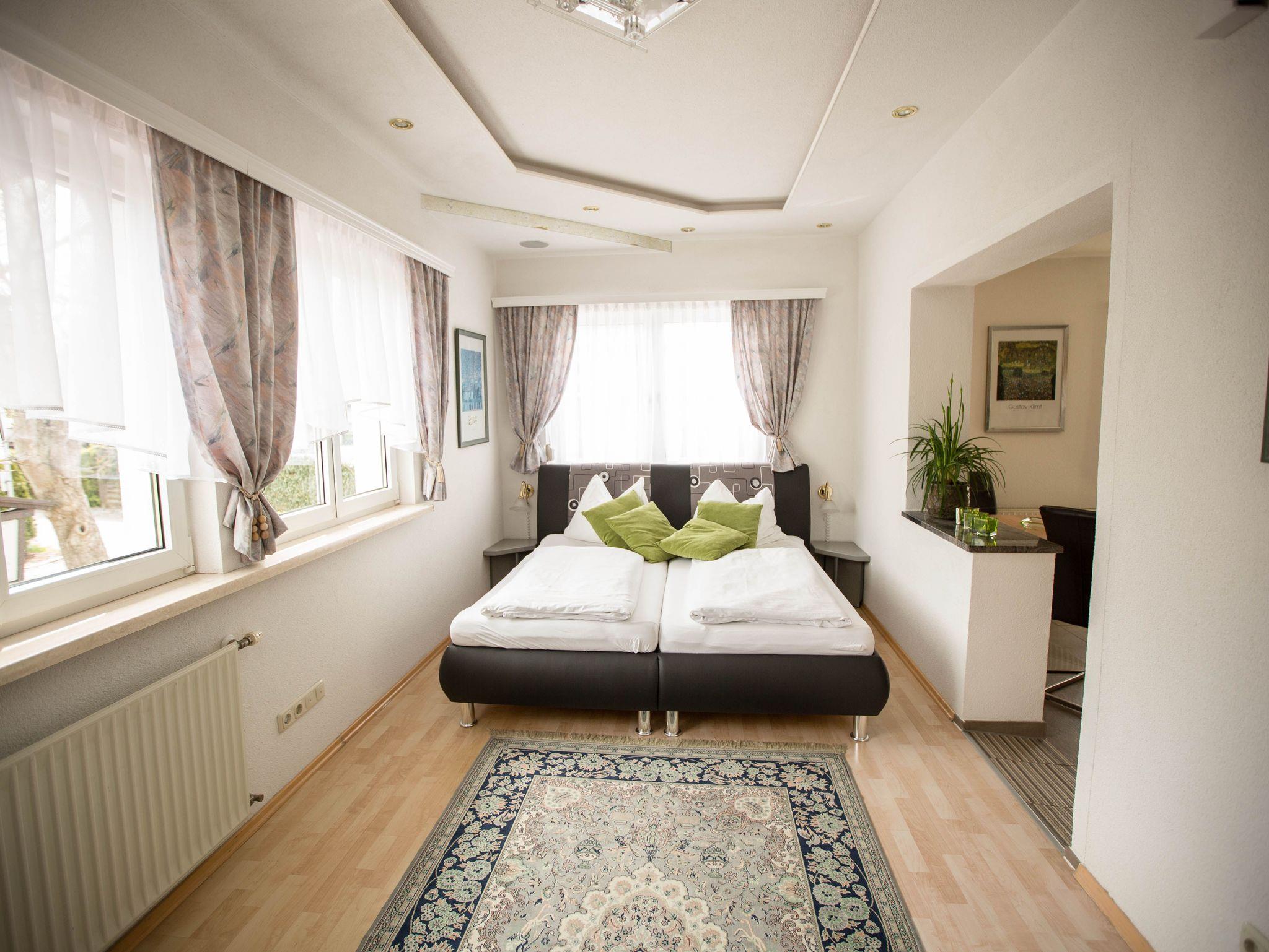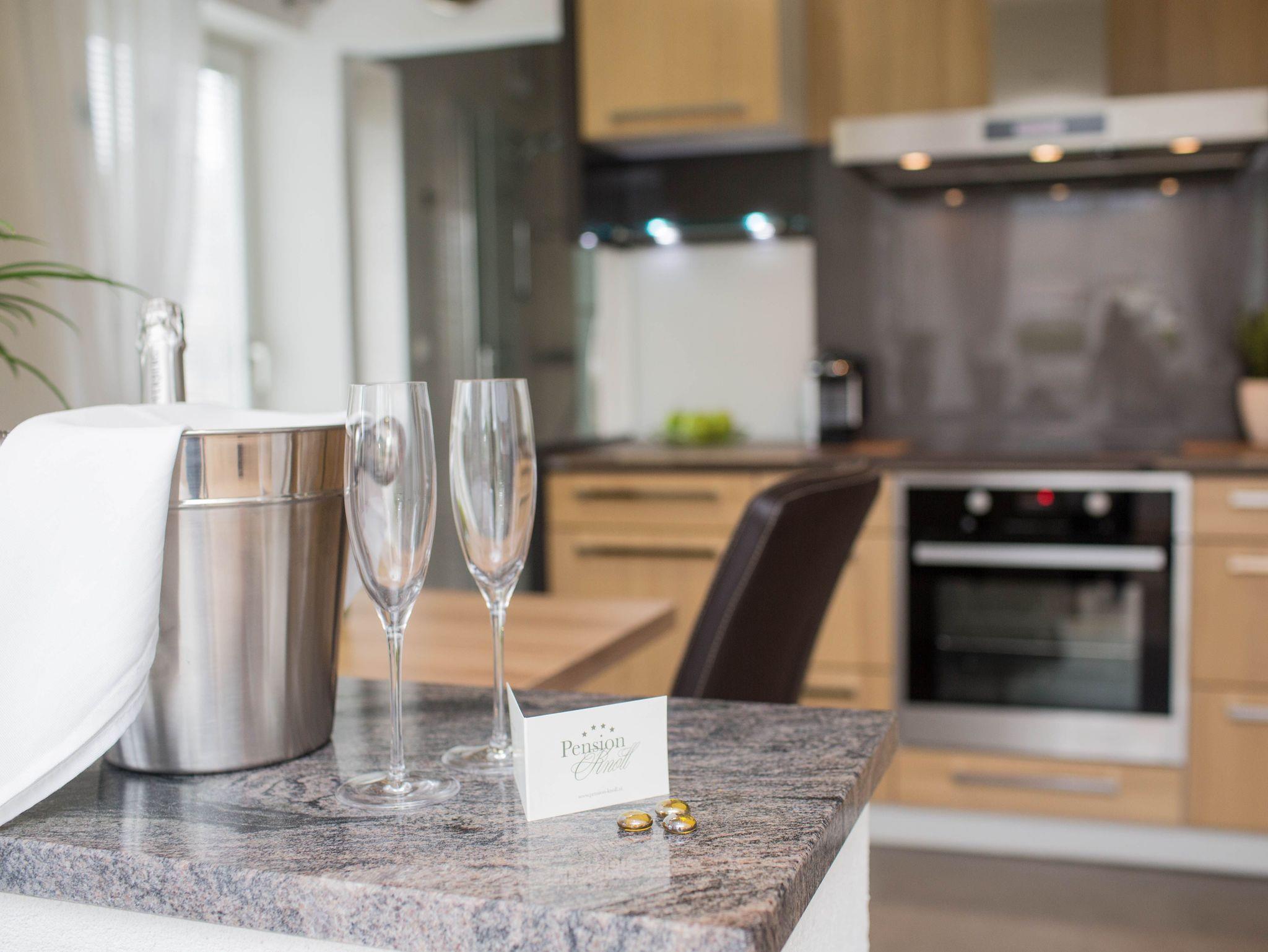 Dieses Apartment bietet Ihnen mit einem sehr hellen und freundlichen Ambiente Erholung auf 40 m². Vom großen Wohn- Schlafraum mit einem Doppelbett, großen Flat-Screen TV (40 Zoll), Schrankverbau mit Stereoanlage, Safe genießen Sie einen Blick Richtung Süden in den Garten. Der angeschlossene offene Küchenbereich mit neuer Designerküche und Top Ausstattung ist mit dem Balkon Richtung Westen (Abendsonne) gelegen. Hier finden Sie Ihre persönliche Erholung.