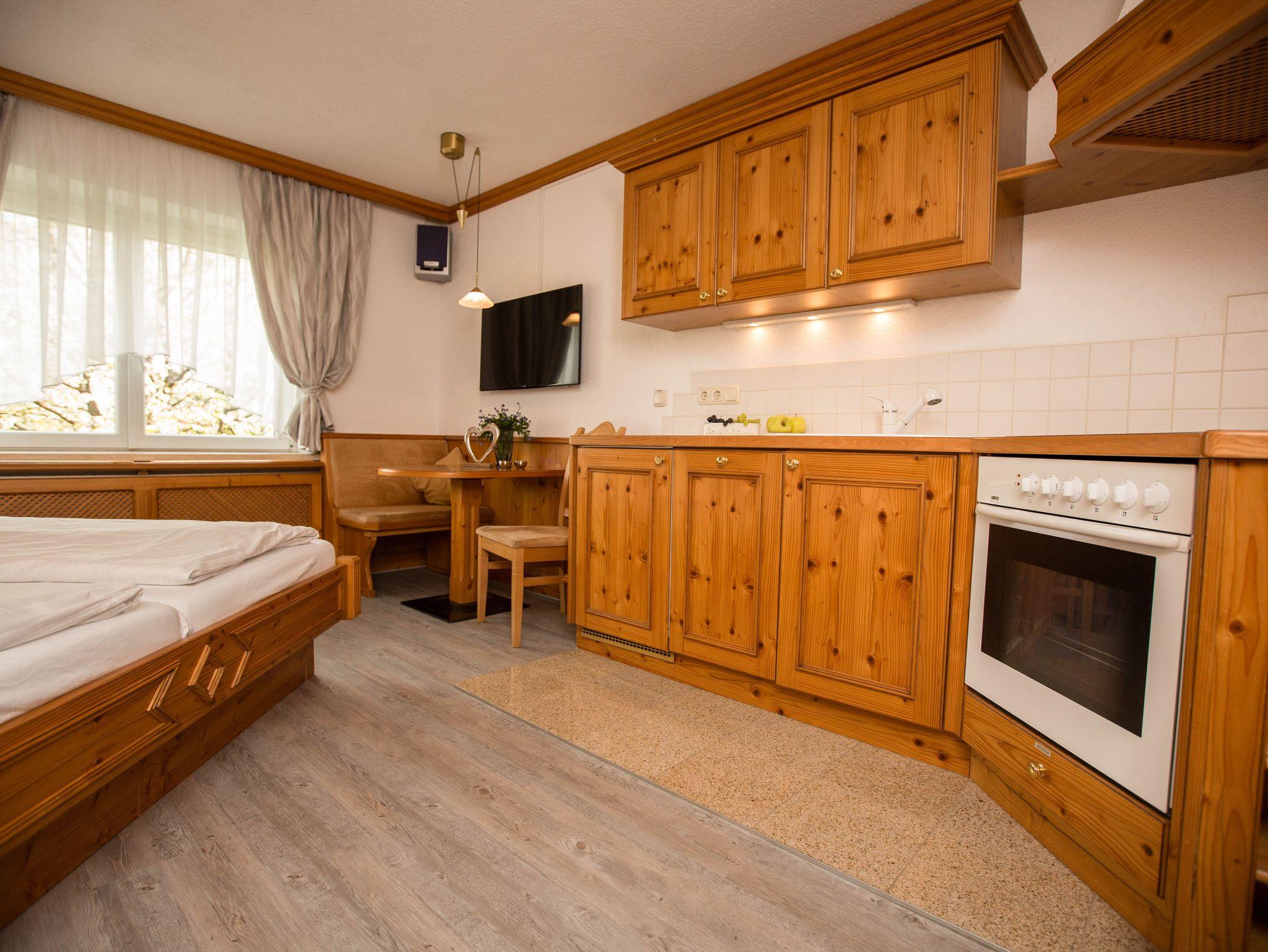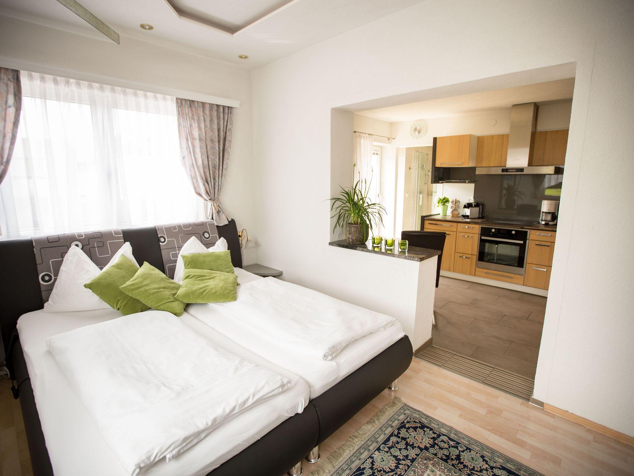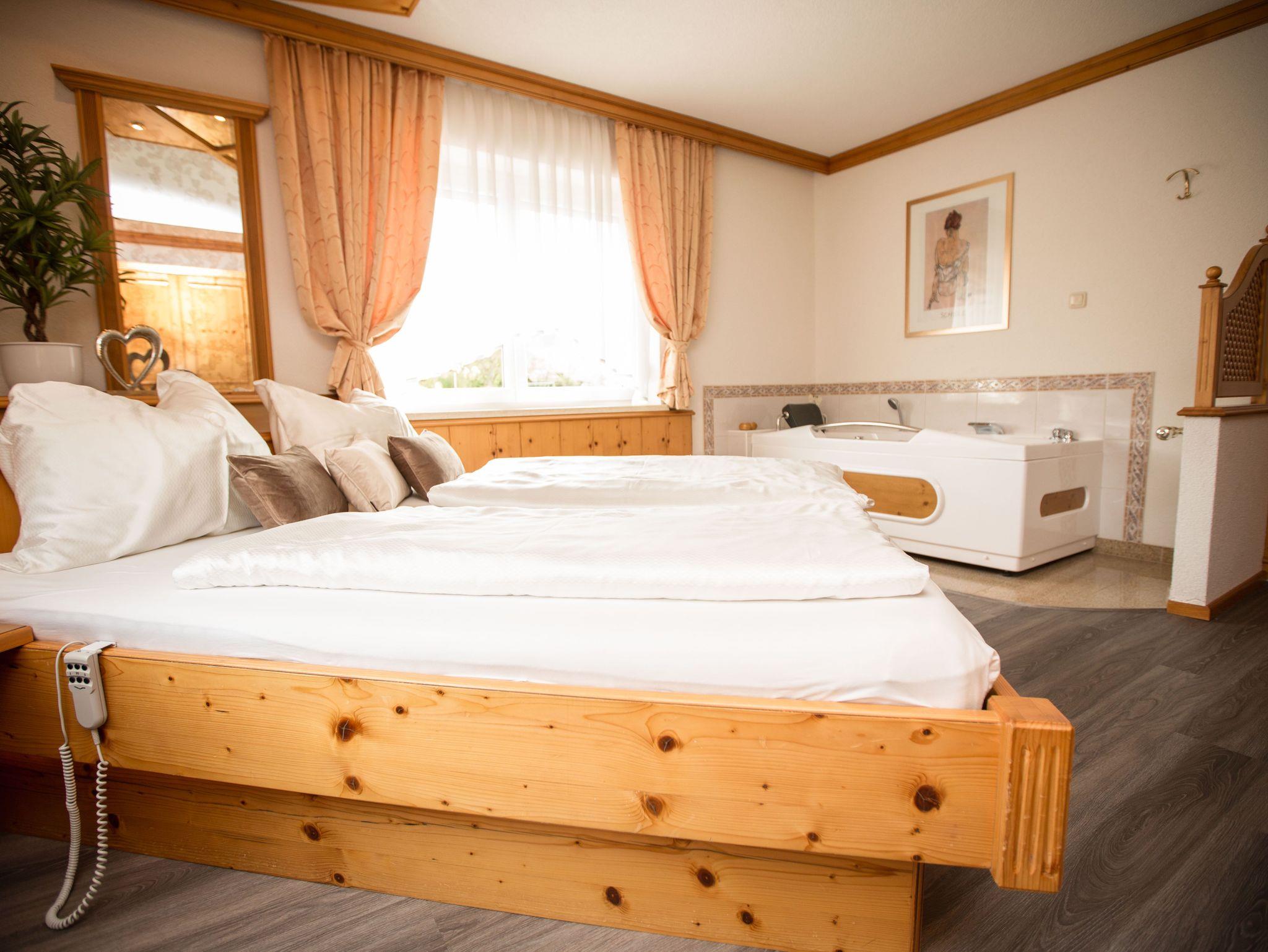 Unsere Fewo Wellness bietet Ihnen Erholung auf 38 m² im luxuriösen Ambiente mit 2 getrennten Räumen plus Badezimmer. Großer Schlafraum mit Whirlpool, Flat-Screen TV, Klimaanlage, elektr. verstellbare Betten, Musikanlage und Safe. Das gemütliche Doppelbett mit Spiegel- und Lichteffekte verleiht zum Träumen und Kuscheln. Küche mit Esstisch, einer vollausgestatteten Küchenzeile (Kühlschrank mit Gefrierfach, Geschirrspüler, Backofen, Kochplatten, Kaffeemaschine, Wasserkocher, Toaster) und eigenem Fernseher. Eine multi-Funktionssitzbank läßt sich zum 3. Schlafplatz adaptieren.