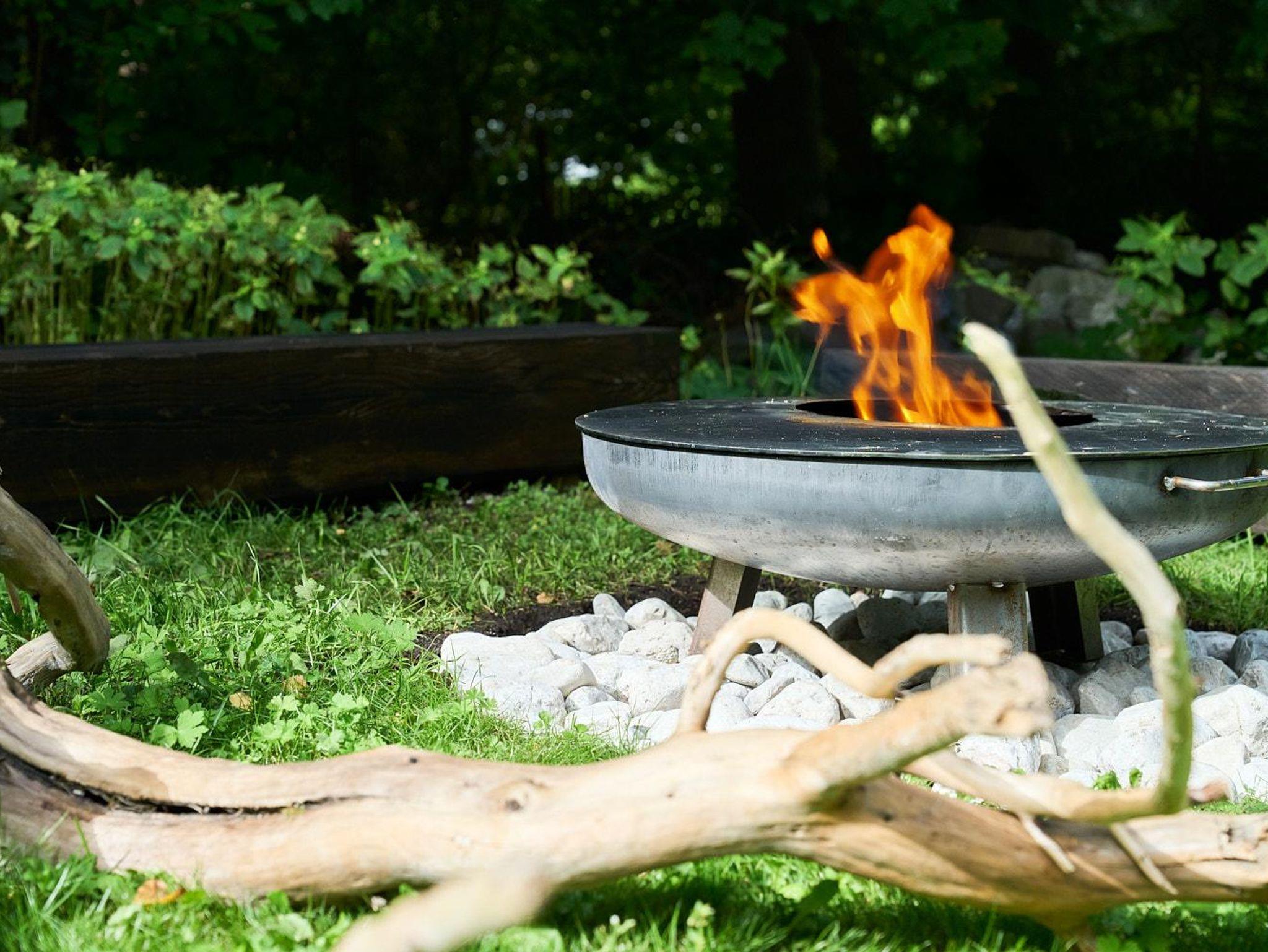 Der großzügige Freibereich mit möblierter Terrasse, Outdoor-Dusche und Feuerstelle bietet viel Platz und privatsphäre.