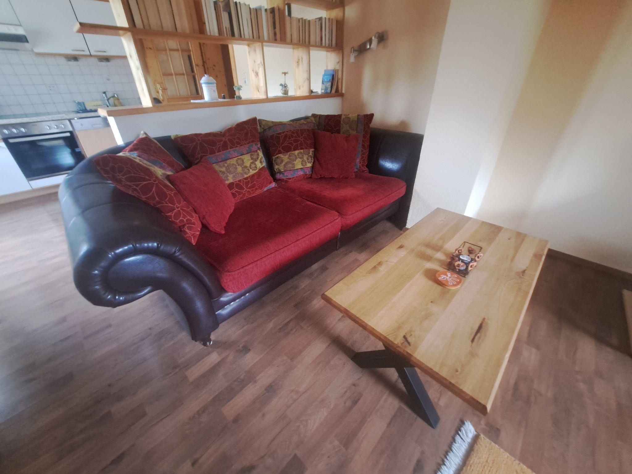Unsere großzügige Ferienwohnung, ideal für 2-5 Personen, bietet 65 m² Wohlfühlfläche. Der kombinierte Wohn- und Schlafraum verfügt über eine ausziehbare Couch (2m x 1,8m), einen Landhausstil-Kleiderschrank und ein farbintensives Kabel-TV mit 20 Programmen. Die gut ausgestattete Einbauküche beinhaltet 4 Kochplatten, Backofen, Kühlschrank mit Gefrierfach, Toaster, Wasserkocher und Kaffeemaschine. Eine gemütliche Essecke lädt zum Verweilen ein.