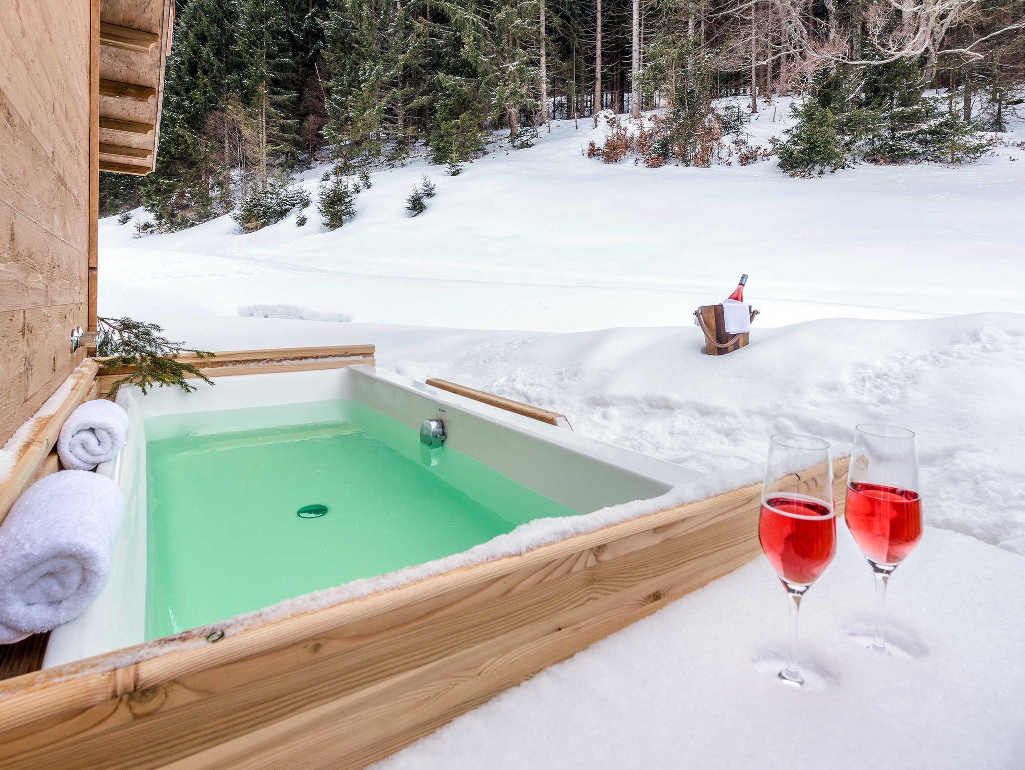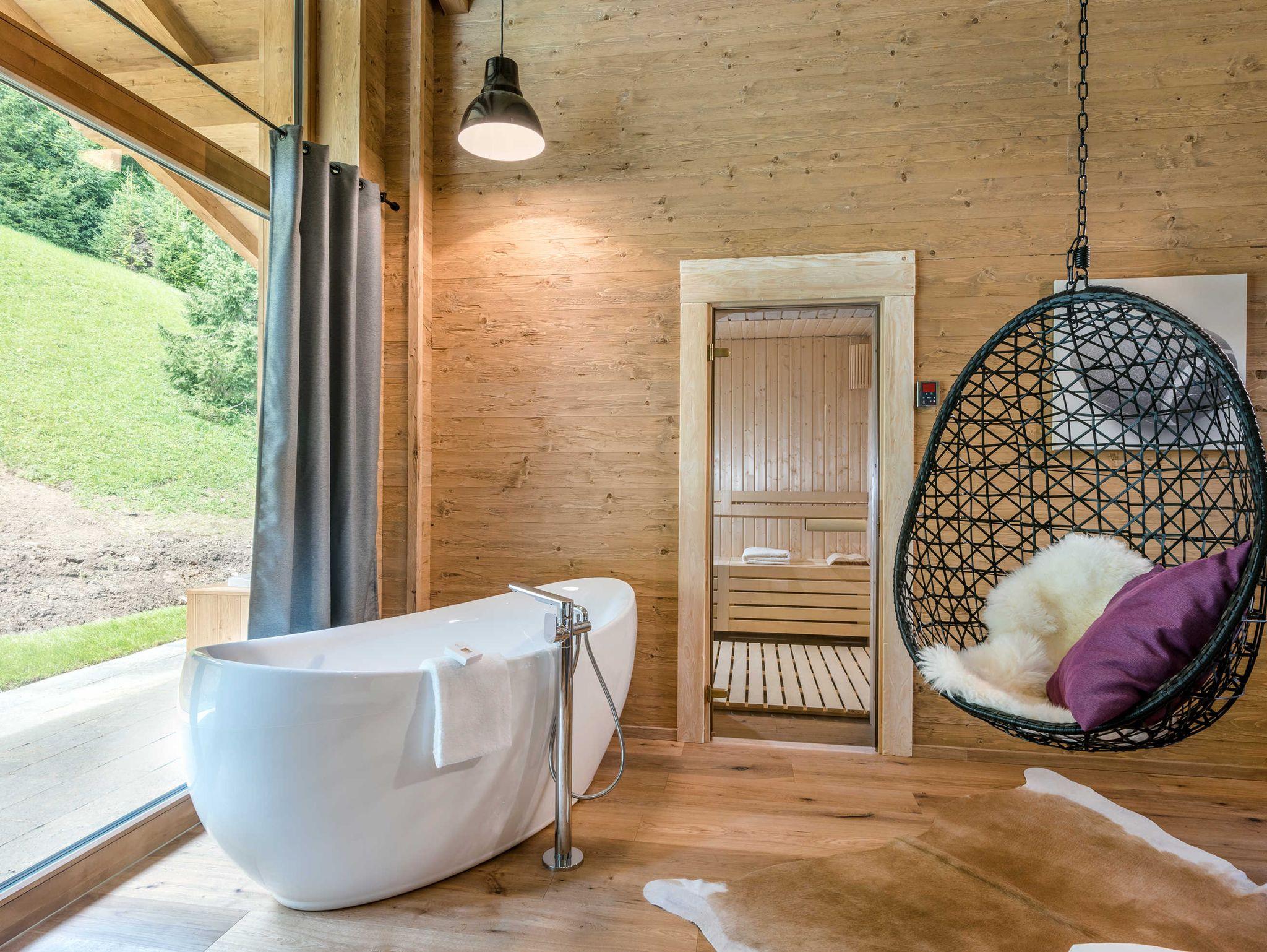 Offener Wohnraum mit Doppelbett, Küche (Induktionsherd, Spülmaschine, Backofen, Kühlschrank, Weinklimaschrank, Kaffeemaschine & Wasserkocher), Chaiselongue, TV-Gerät, gemütlicher-moderner Kamin mitten im Raum, freistehende Badewanne, separates Badezimmer mit Dusche und WC, Daybed im Freien, Sauna mit Lichttherapie, Außenwanne, Garten mit Möbeln und Grillfläche.