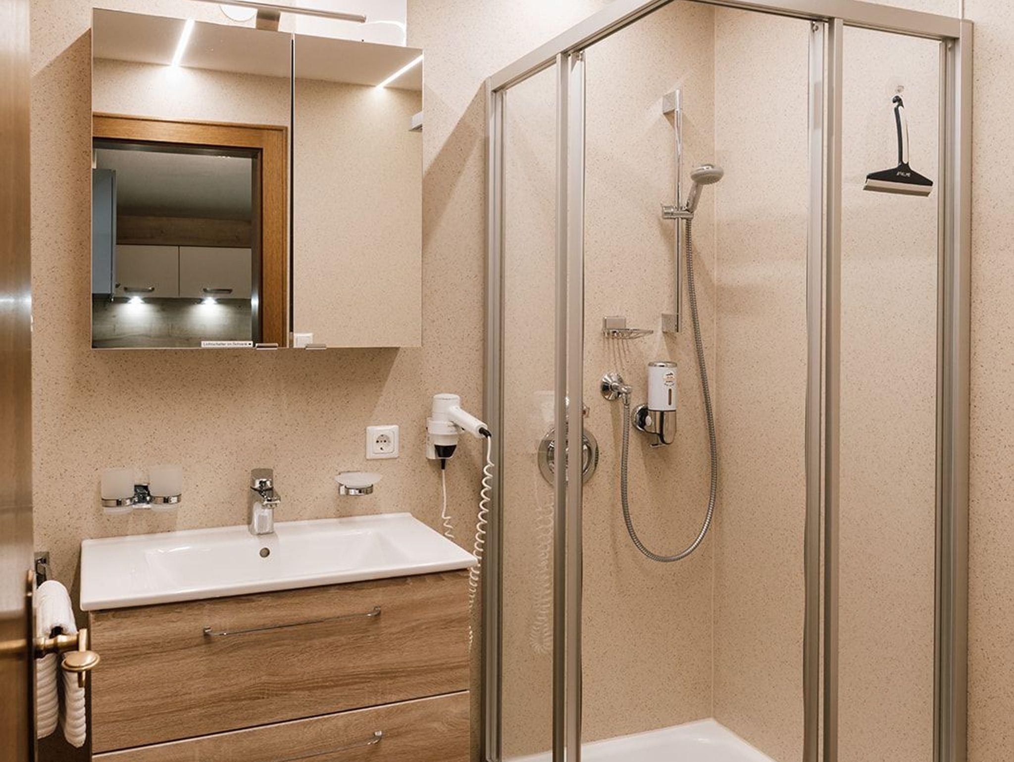 • Badezimmer mit Dusche/WC, Handtücher und Haarföhn