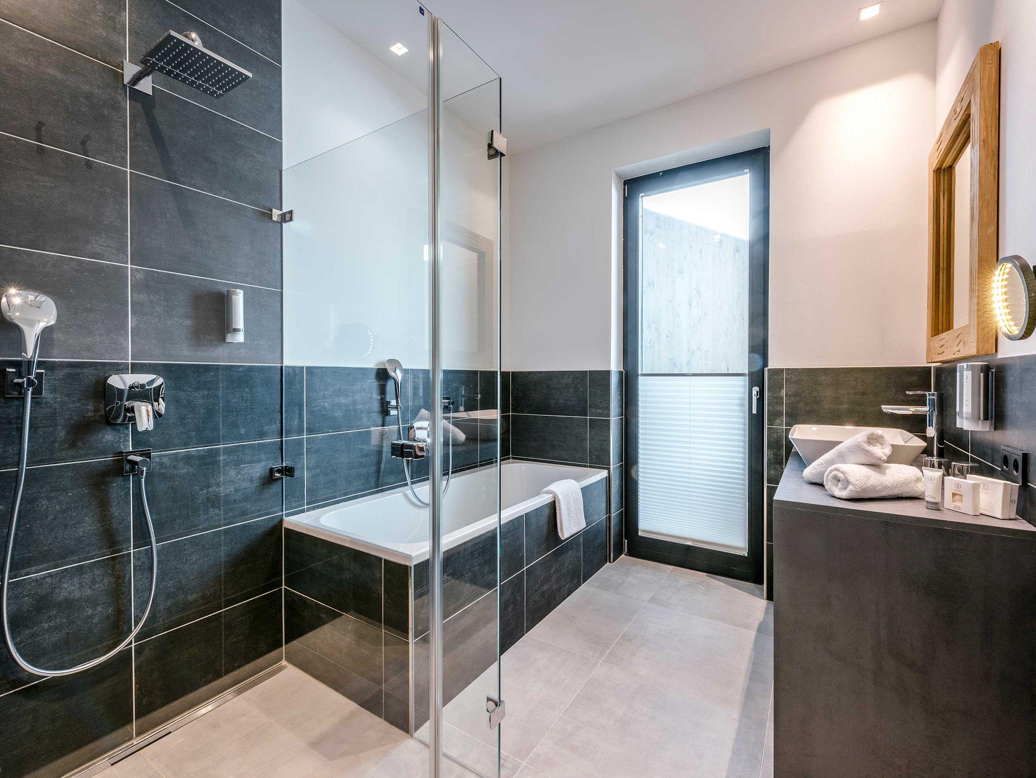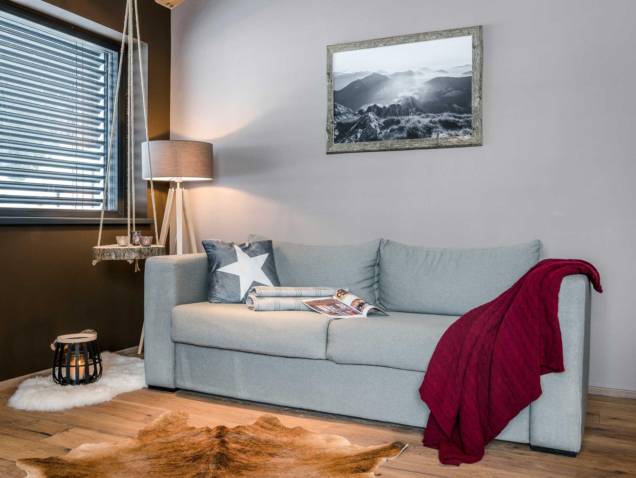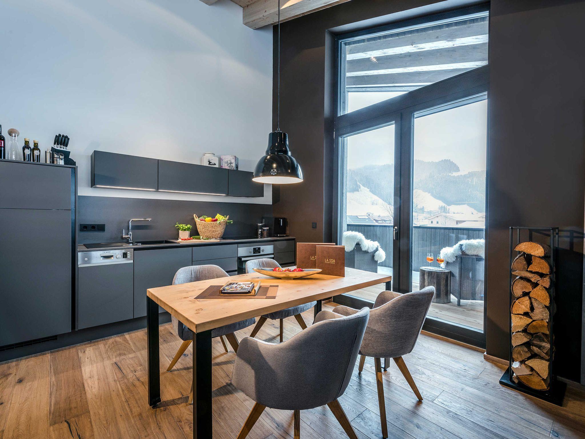 Schlafzimmer, Badezimmer mit Badewanne und Dusche, separates WC, offener Wohnraum mit Küche (Induktionsherd, Spülmaschine, Backofen, Kühlschrank, Kaffeemaschine & Wasserkocher), Sitzecke, gemütlicher Couch, TV Gerät, Balkon mit eigener Sauna.