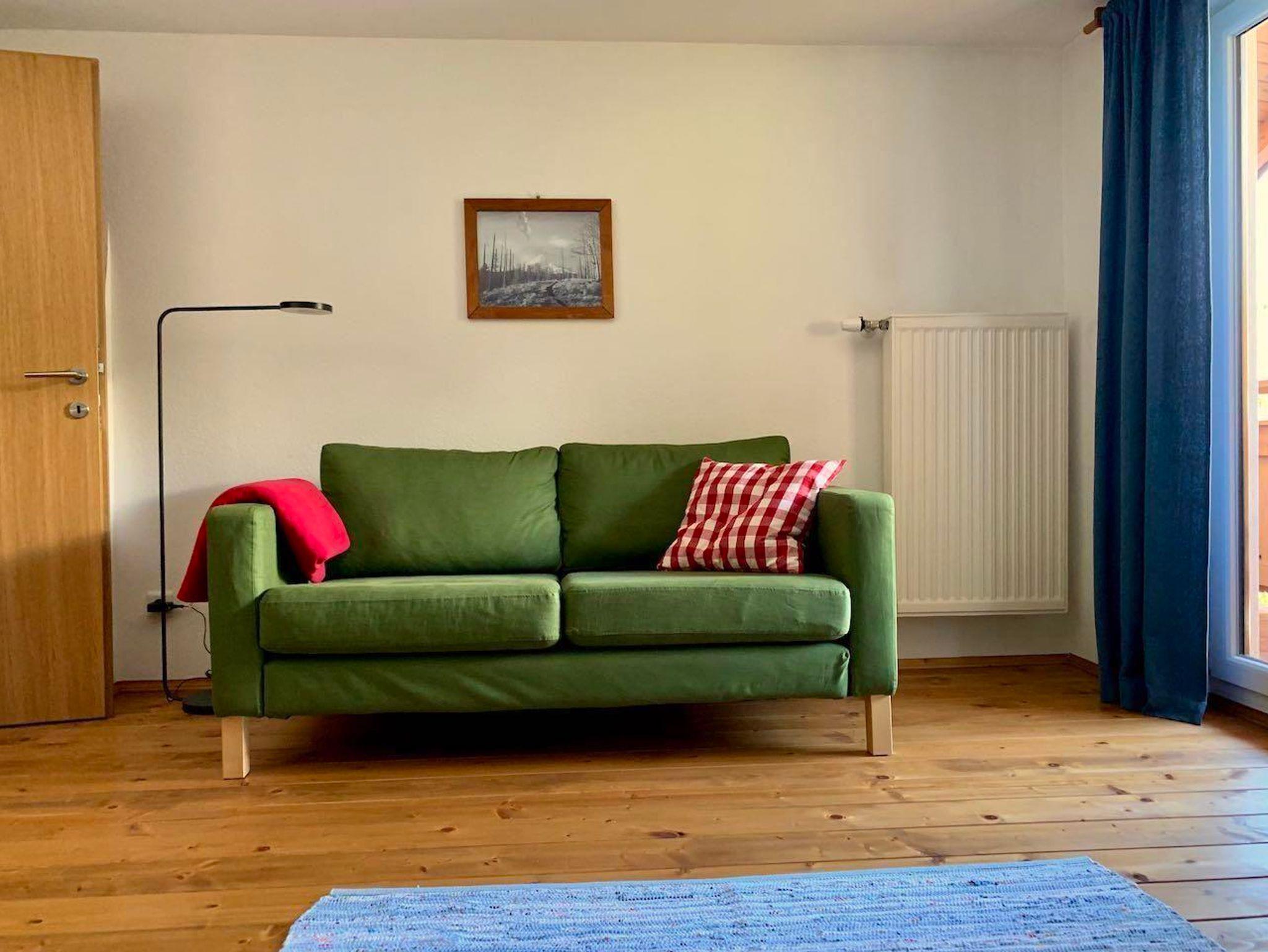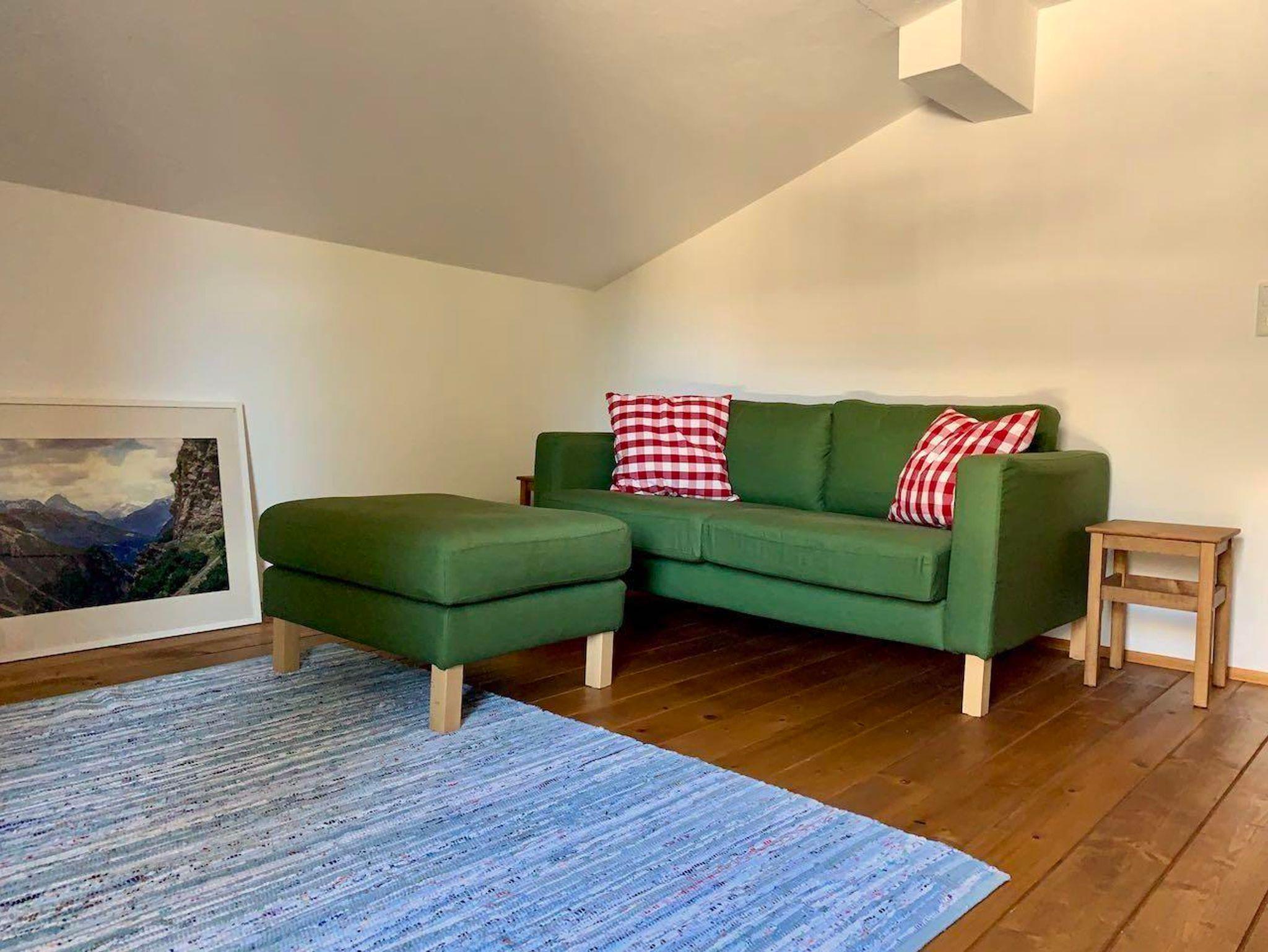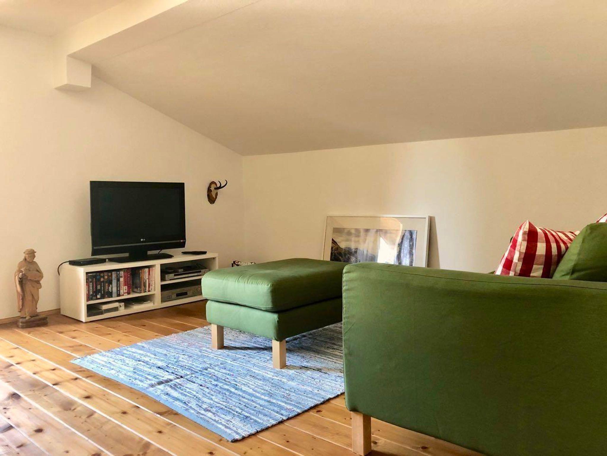 Das Wohnzimmer bietet ein 2er und 3er Sofa mit Hocker.