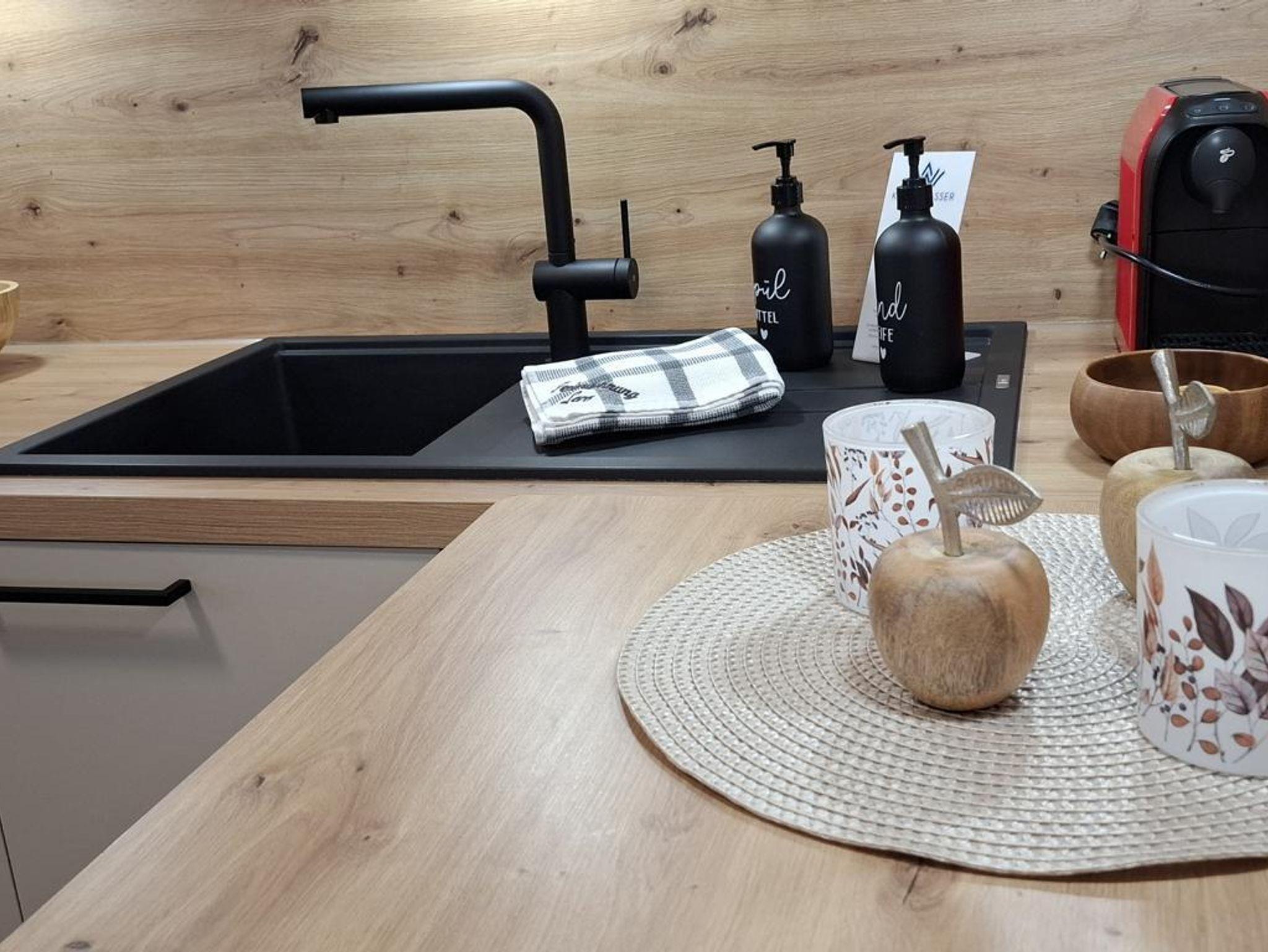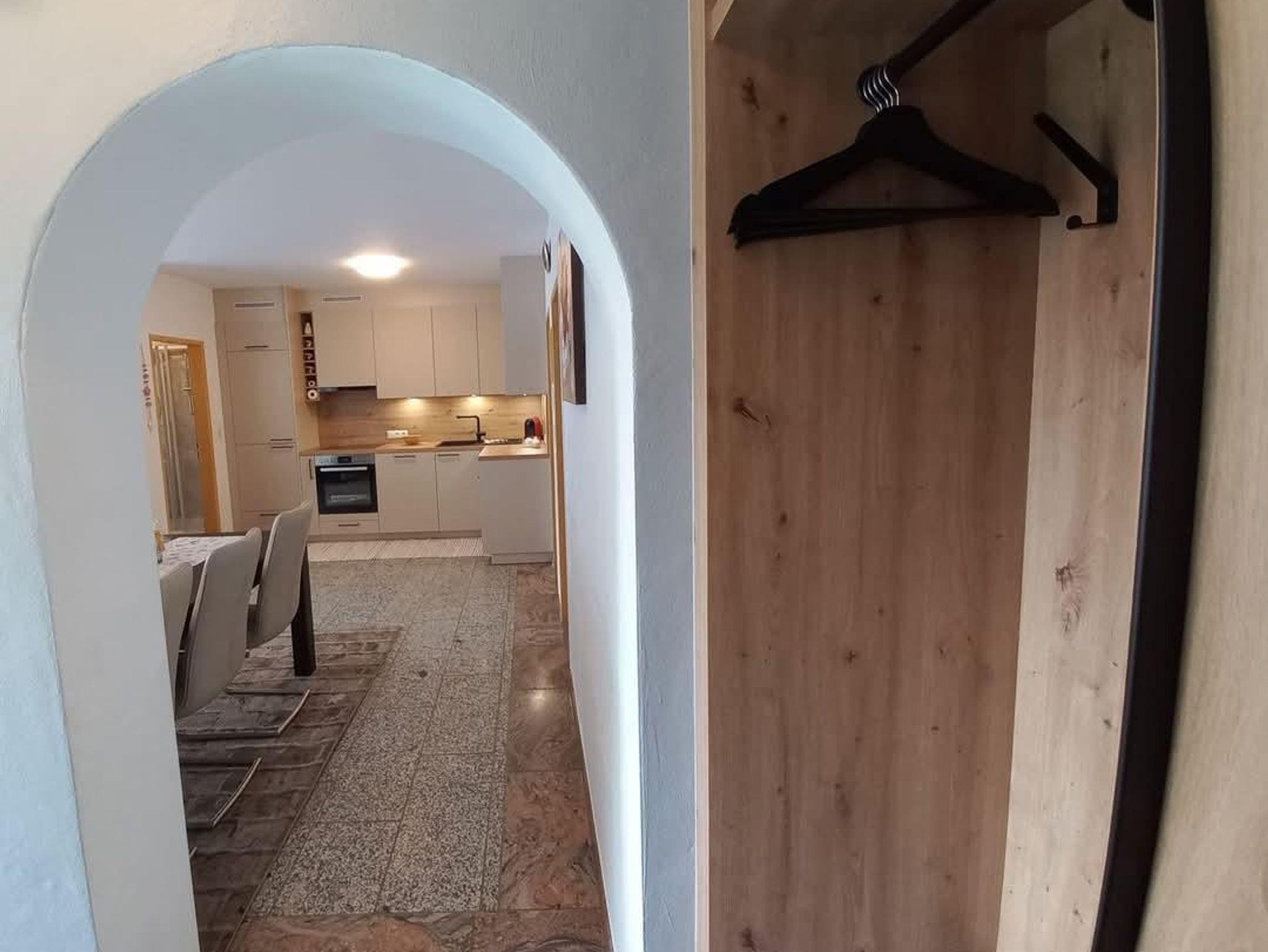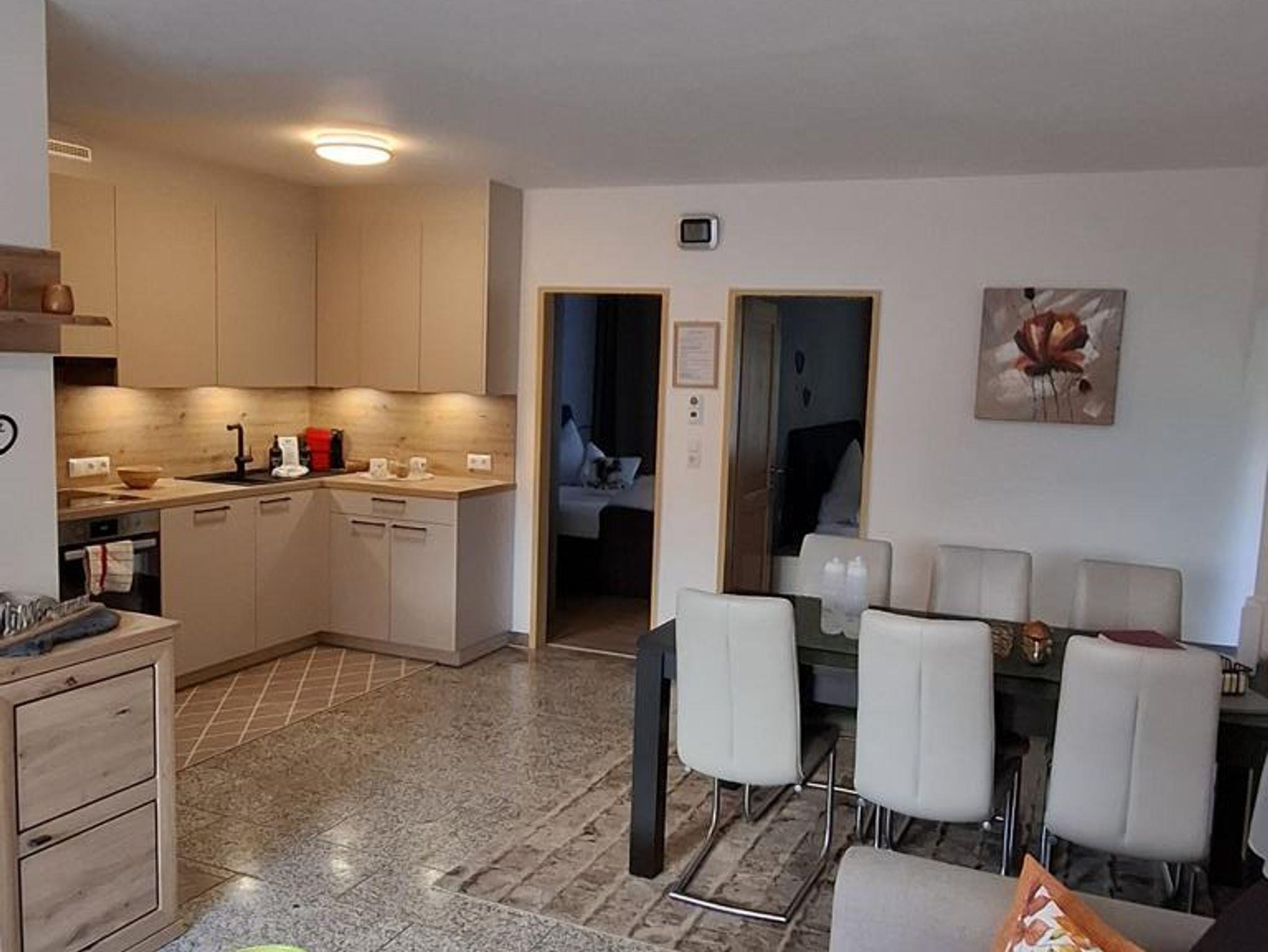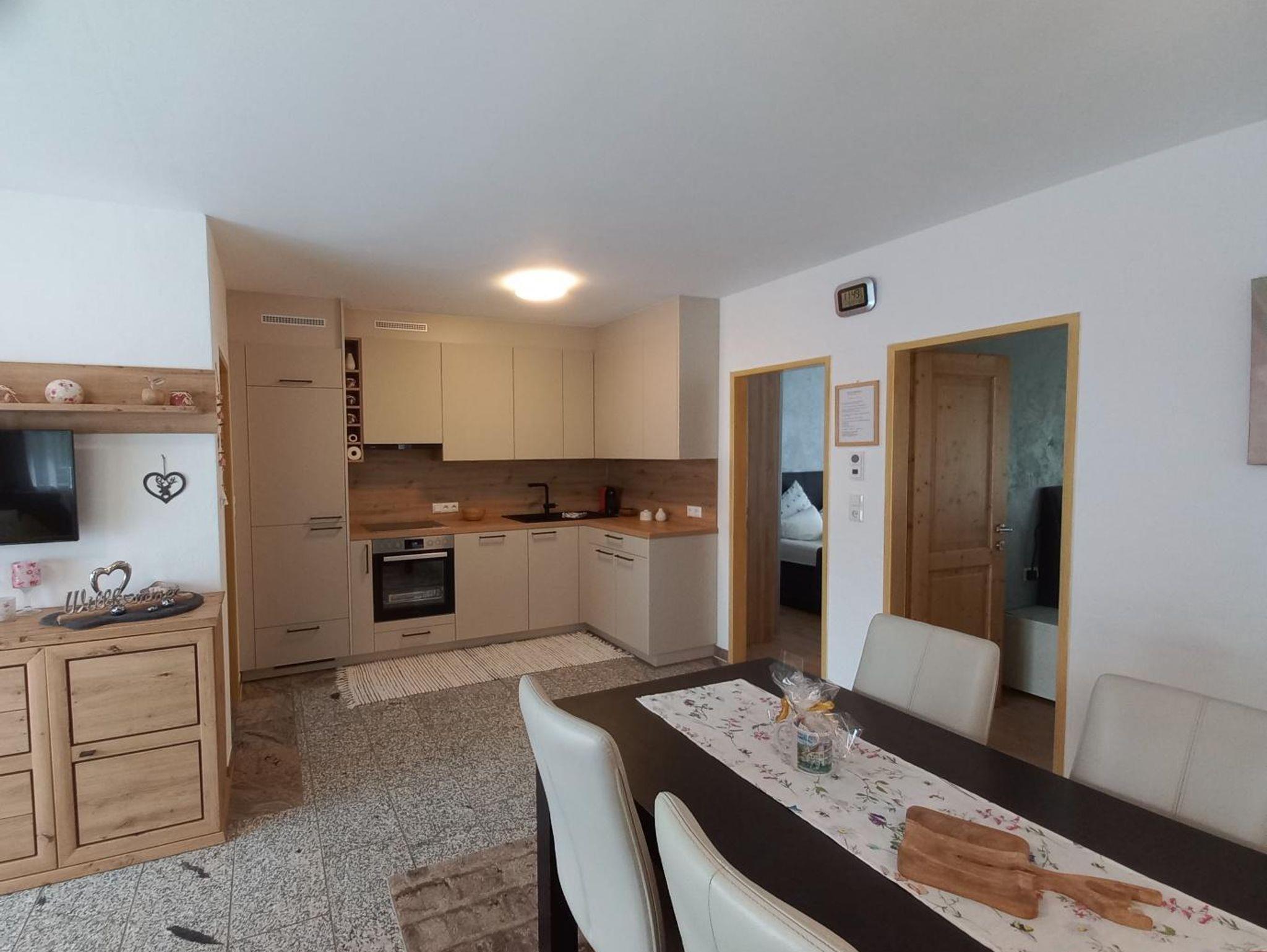 Die Küche ist vollausgestattet , das Wohnzimmer hat einen grossen Tisch mit 6 Stühle und eine ausziebare Couch für 2 Personen.