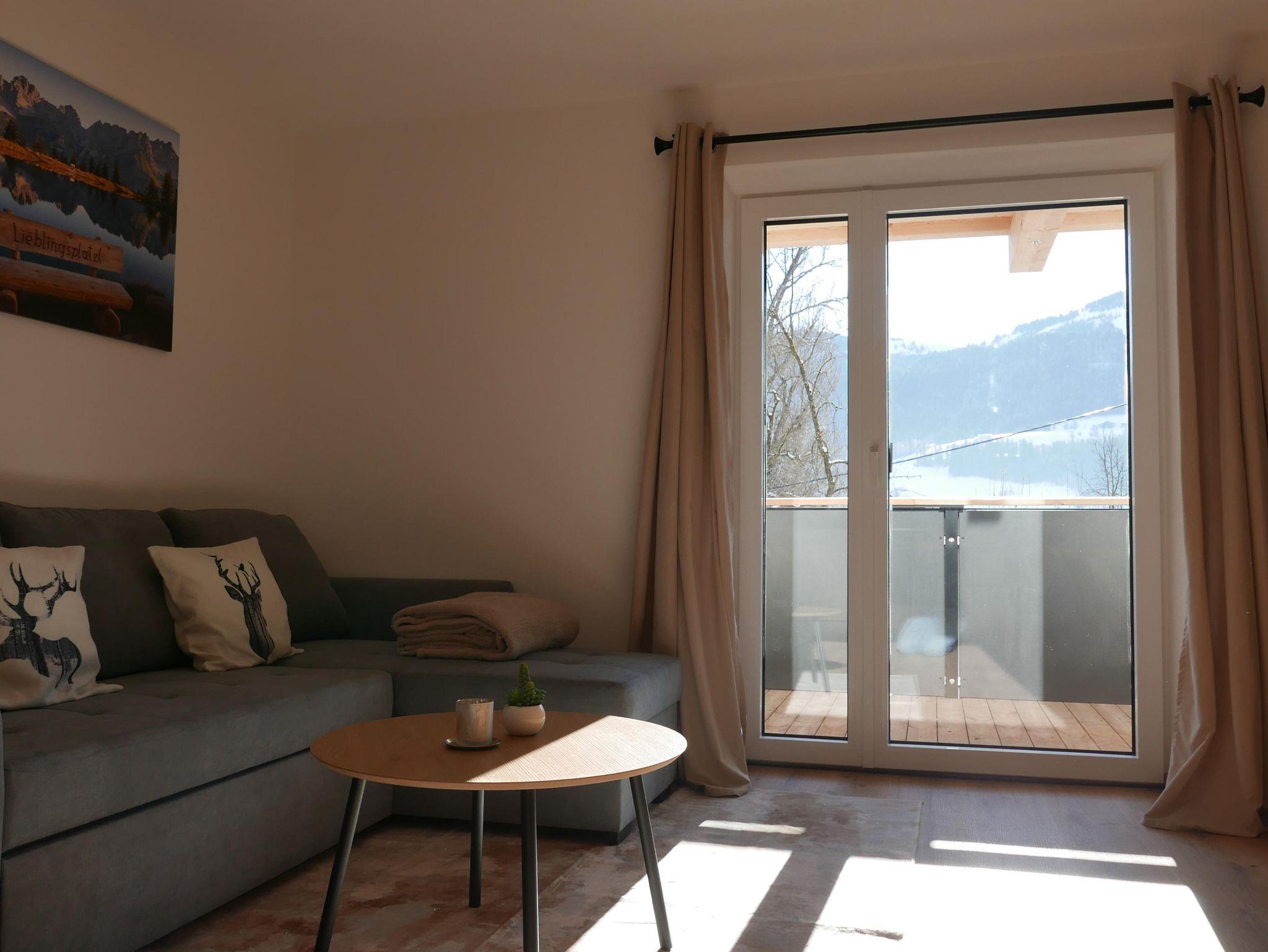 Genießen Sie den großzügigen Wohnbereich mit einer stilvollen Landhausküche, ideal für gesellige Abende. Die bequeme Couch lässt sich im Handumdrehen zu einem Doppelbett ausziehen. Vom Wohnbereich gelangen Sie auf den Balkon, von dem aus Sie den malerischen Blick auf den Brandstadl genießen können.