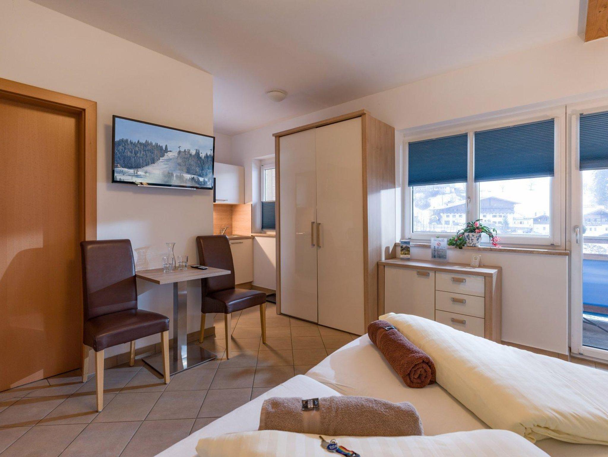 Das moderne Studioappartement verfügt über einen kombinierten Wohn-/Schlafraum, Dusche/WC, Küchenbereich, Esstisch, Smart-TV und Glasfaser-Internetanschluss/WiFi. Der Küchenbereich ist mit Kühlschrank, Mikrowelle/Grill, Cerankochfeld, Senseo Pad-Kaffeemaschine, Essgeschirr und Küchenutensilien ausgestattet. Bettwäsche und Handtücher werden gestellt. Alle Appartements sind Nichtraucherappartements. Die Bilder wurden in verschiedenen Einheiten dieser Kategorie aufgenommen.
