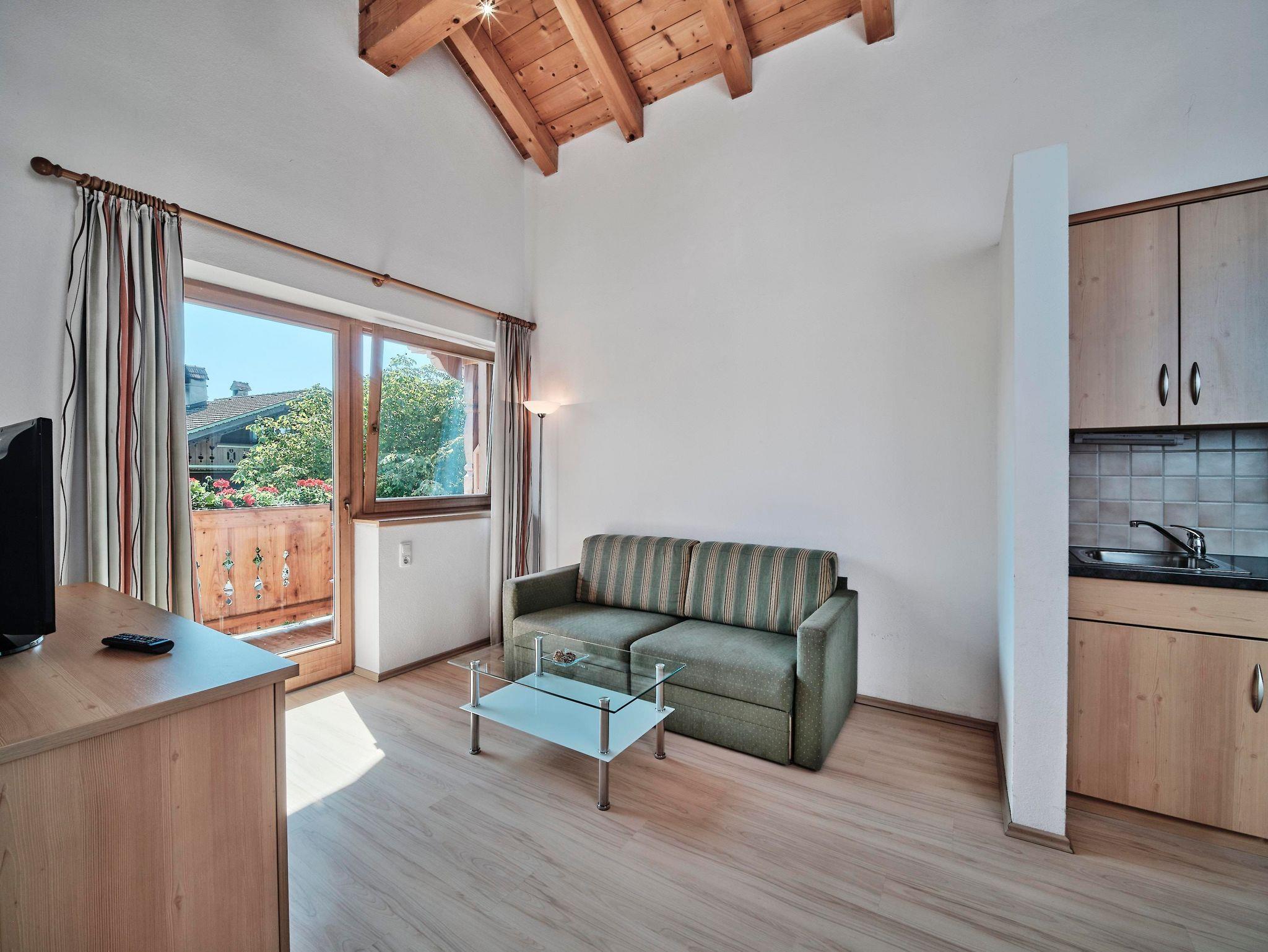 Studio mit Doppelbett, 1 Einzelbett und 1 Doppelcouch ca. 54 m², Bettwäsche, Sitzgruppe und Wohnlandschaft, Küchenzeile, Bettdecken & Polster für Allergiker, Flat-SAT-TV mit Radio, W-LAN, Laminatboden, Dusche/WC, Handtücher, Handtuchtrockner, Haartrockner, Toilettenartikel, Kosmetikspiegel, Bodenheizung, Safe. Für 2-5 Gäste geeignet. Bergpanorama Wilder Kaiser, Südseite mit Terrasse.