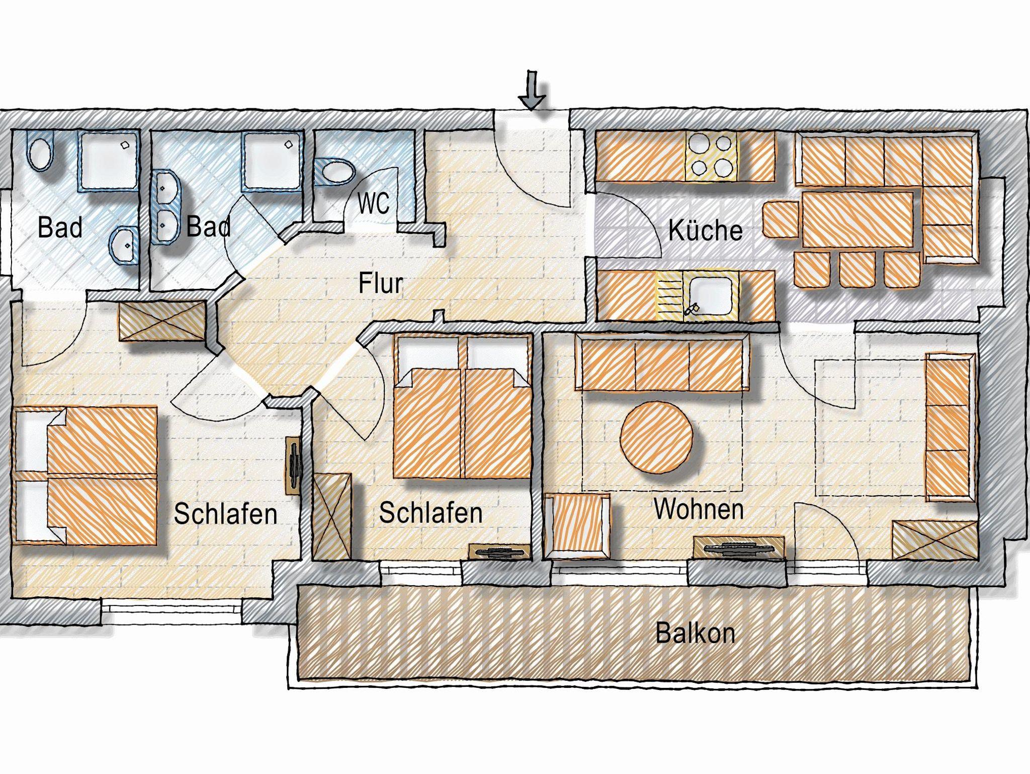 großes Appartement im Appartementhaus mit zwei Doppelzimmern, einer geräumigen Küche mit Esstisch und einem Wohnzimmer. die zwei Sofas im Wohnzimmer kann man ausziehen und schafft damit Platz für bis zu 8 Personen. Zwei Badezimmer und eine separate Toilette sind vorhanden.