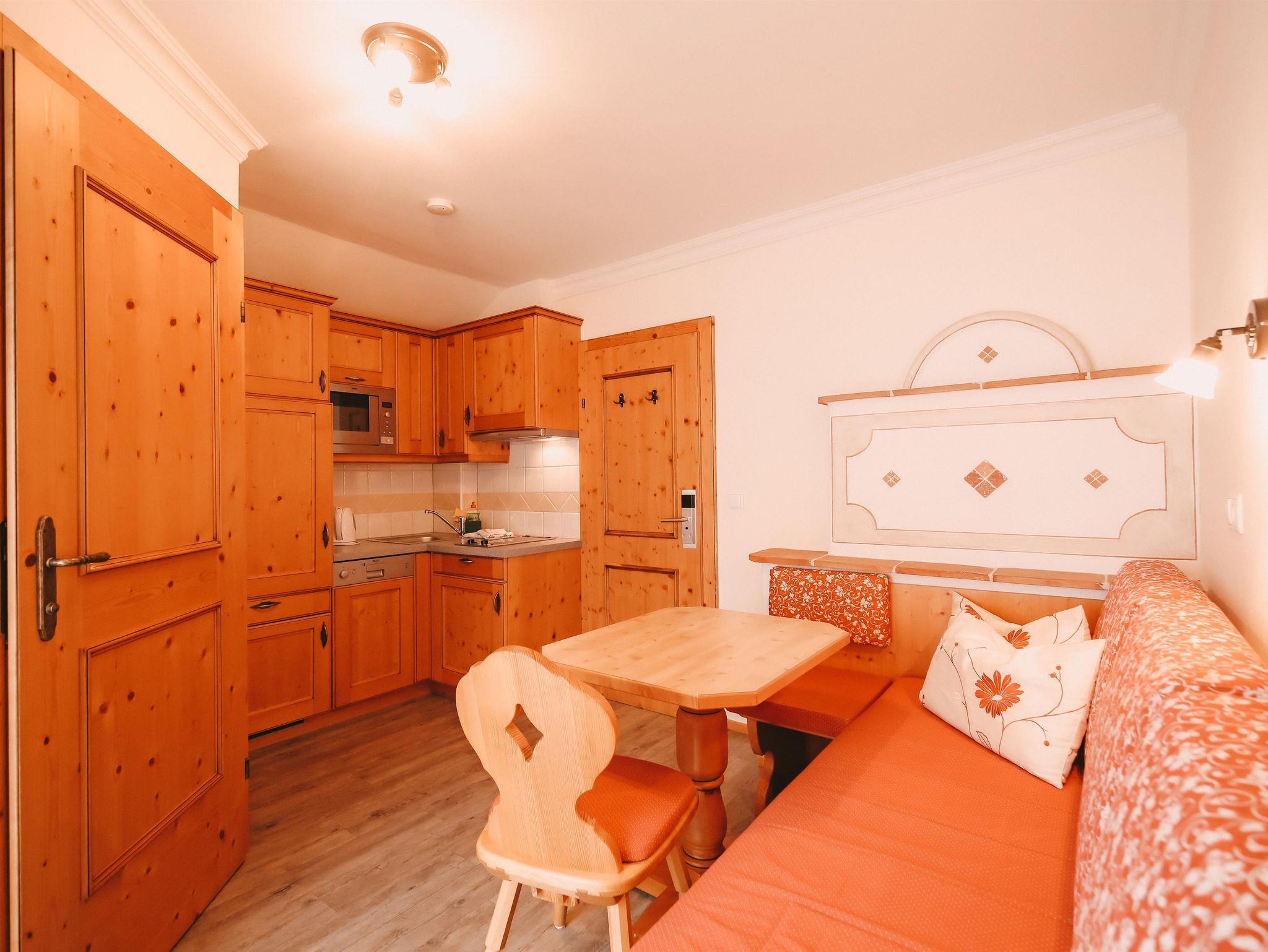 kleines Appartement im Stammhaus mit Doppelzimmer, einer gemütlichen Küche mit Esstisch und Kachelofen. Der Balkon nach Süden lässt die Morgensonne durch die Räume fluten.
