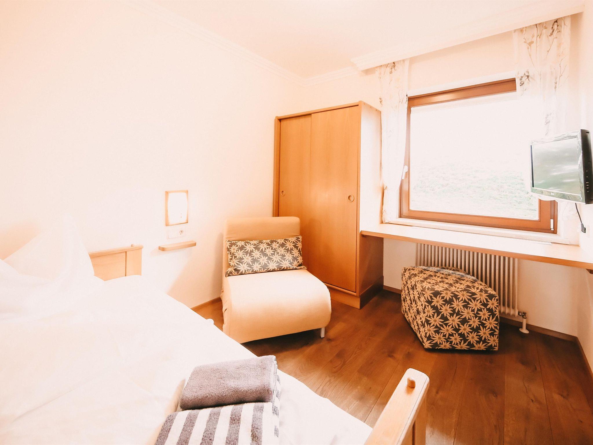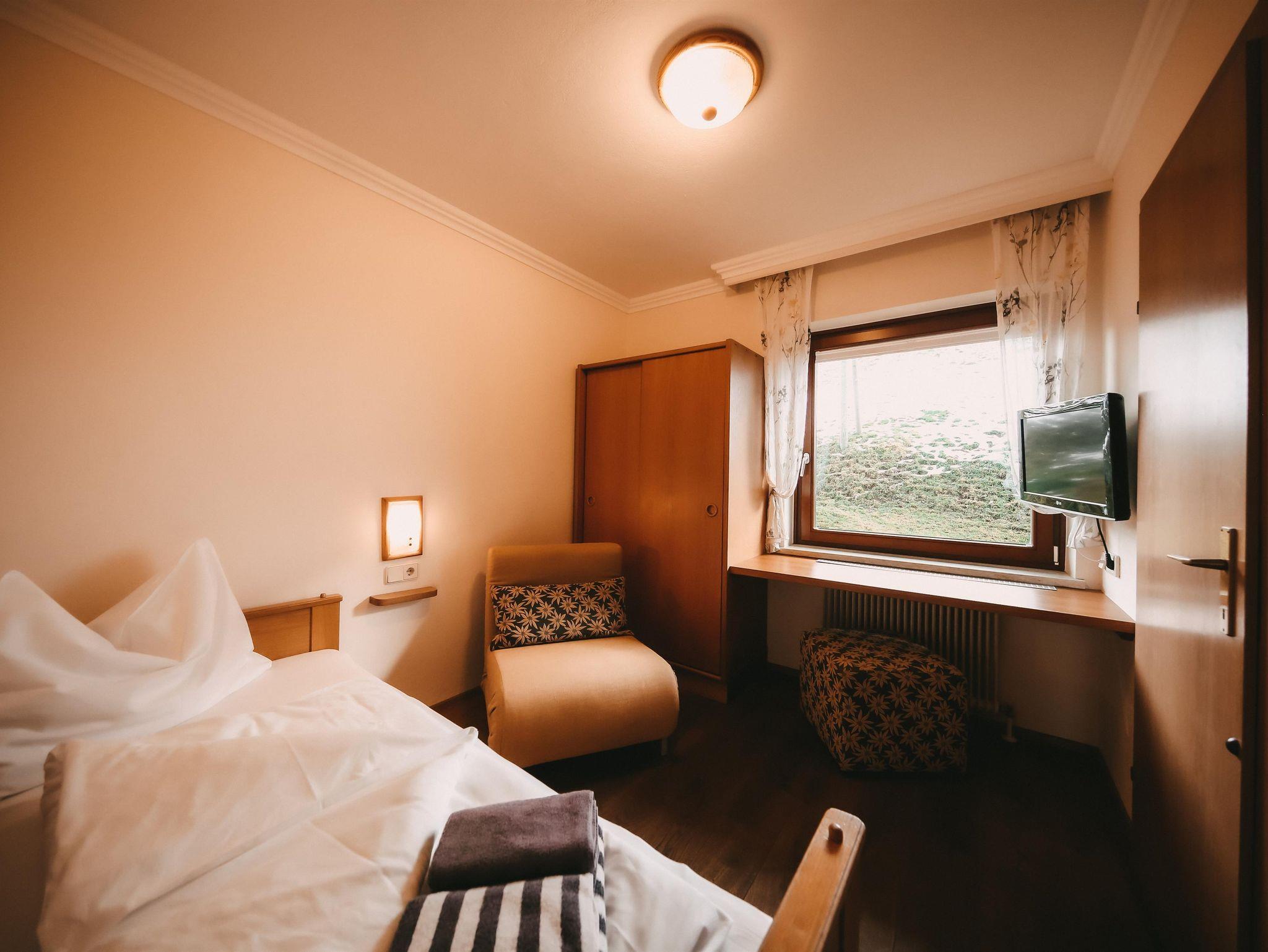 kleines Einzelzimmer im Stammhaus ohne Balkon, mit Dusche und WC. Ideal als Ergänzung zu unseren Appartements aber auch für Einzelreisende.
