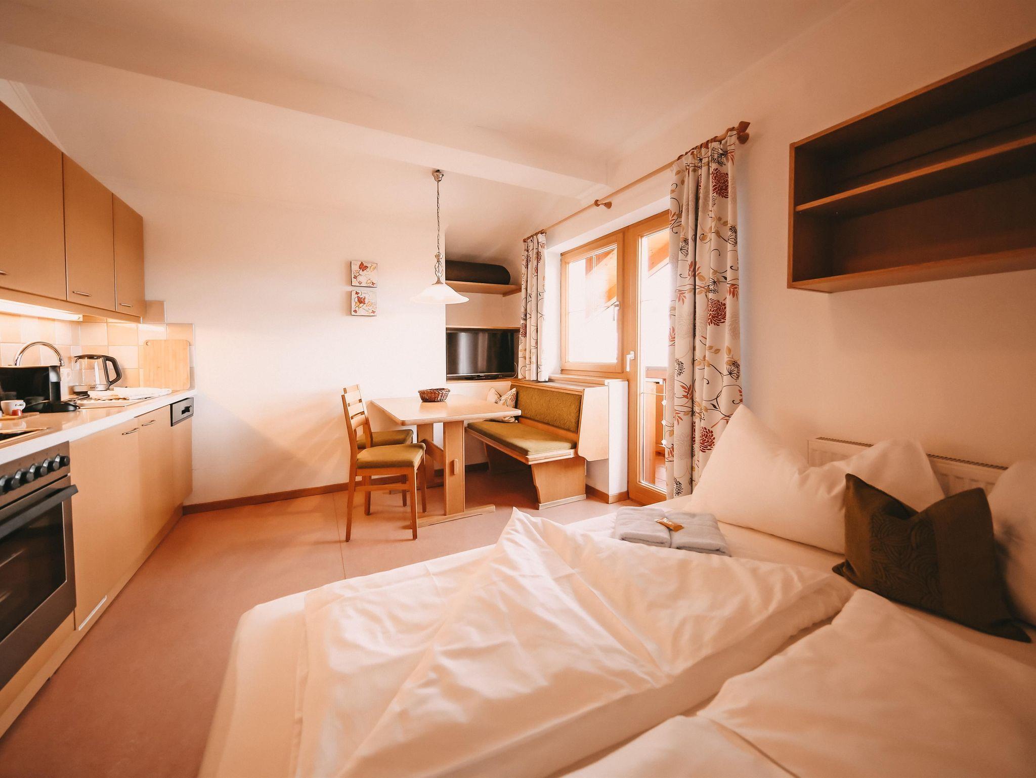 Appartement im Appartementhaus mit einem Doppelzimmer und einem Schlafsofa für zwei Personen in der Wohnküche. Der Ausblick vom Balkon nach Westen zeigt täglich die schönsten Sonnenuntergänge über den Bergen.