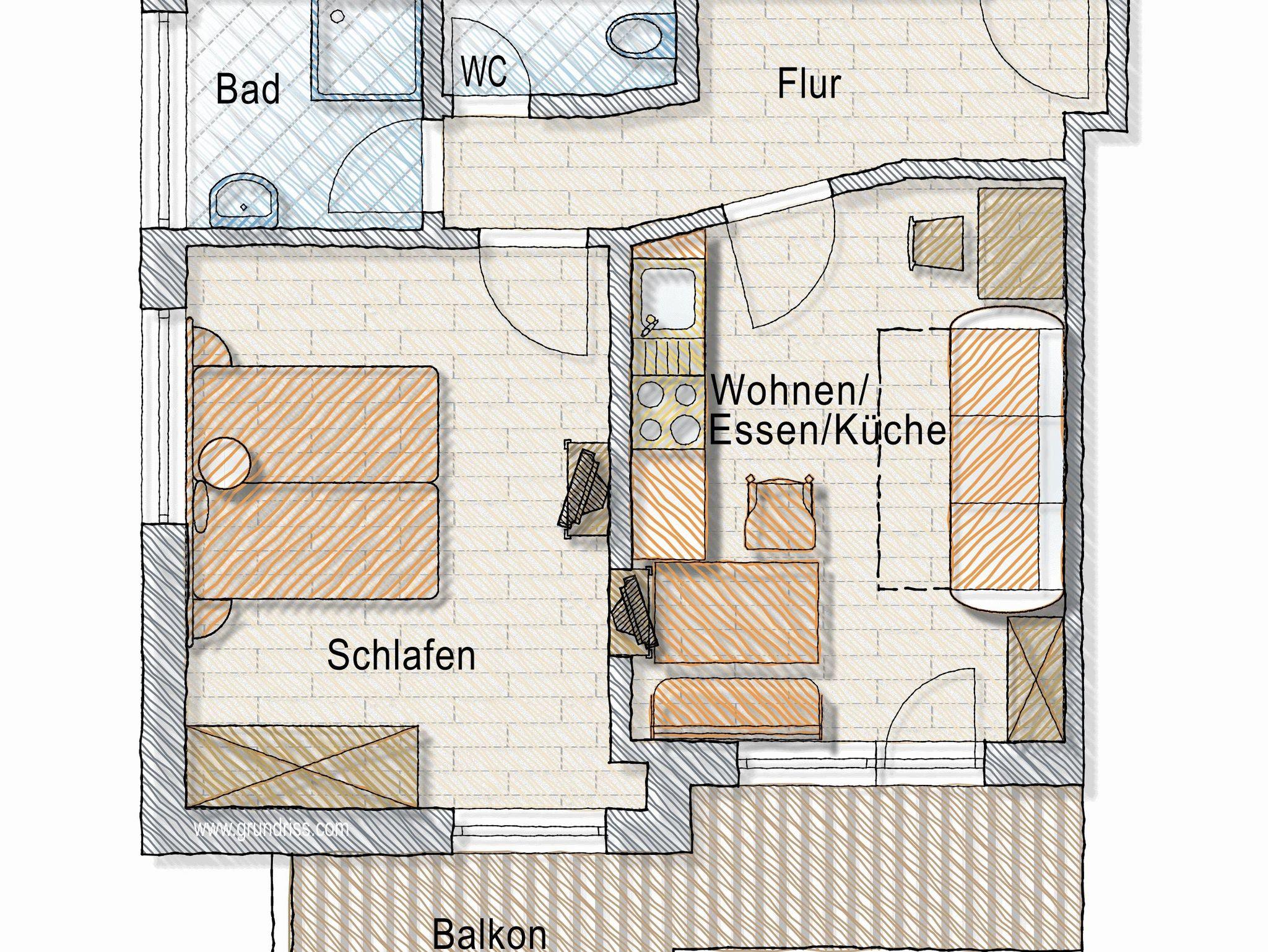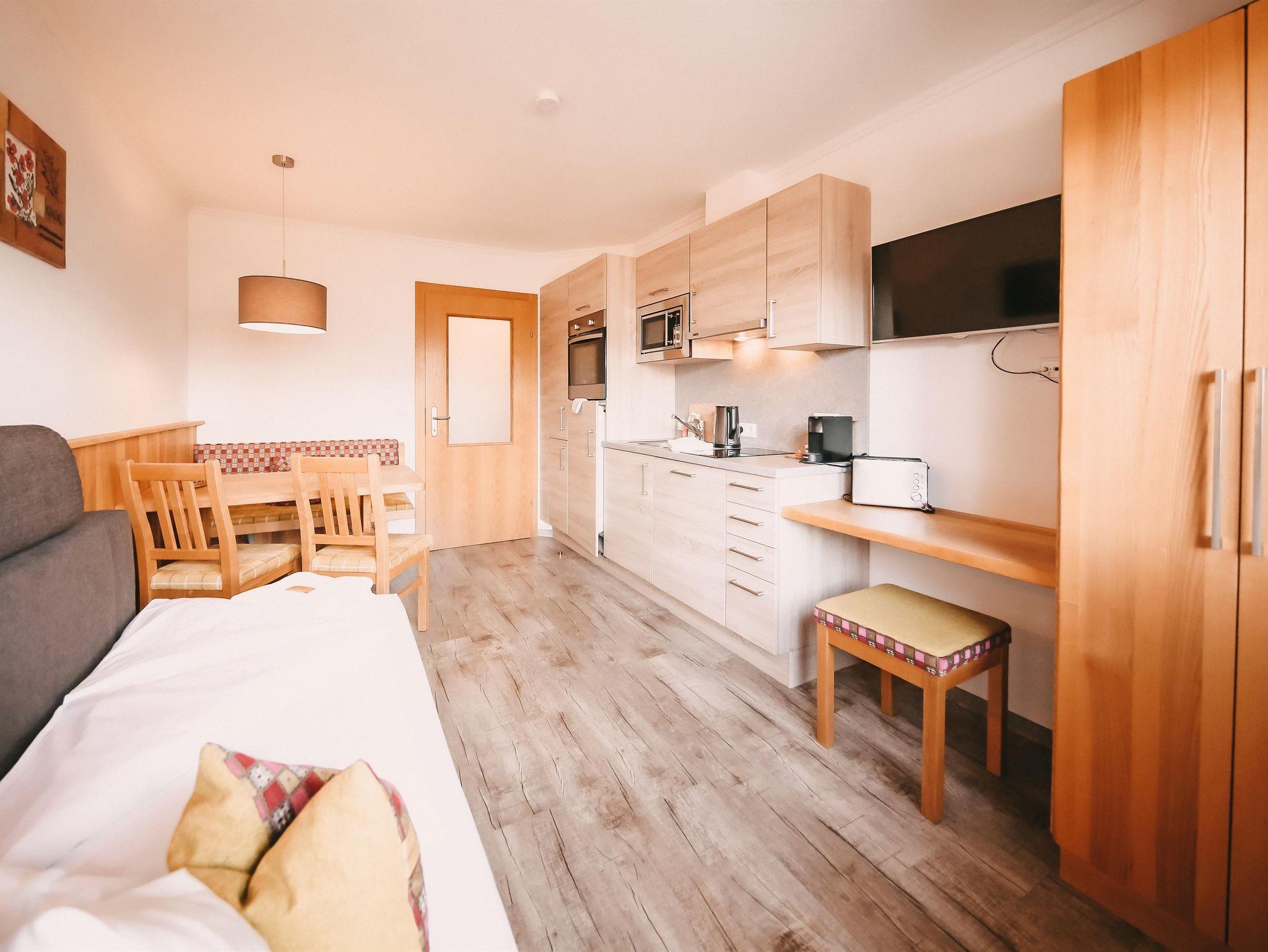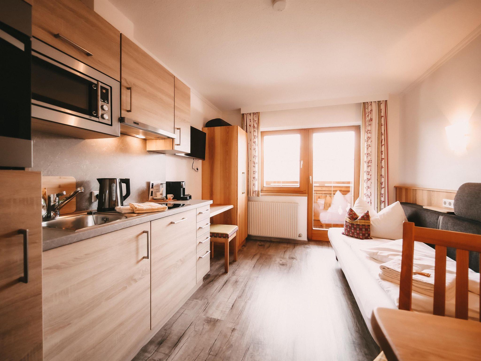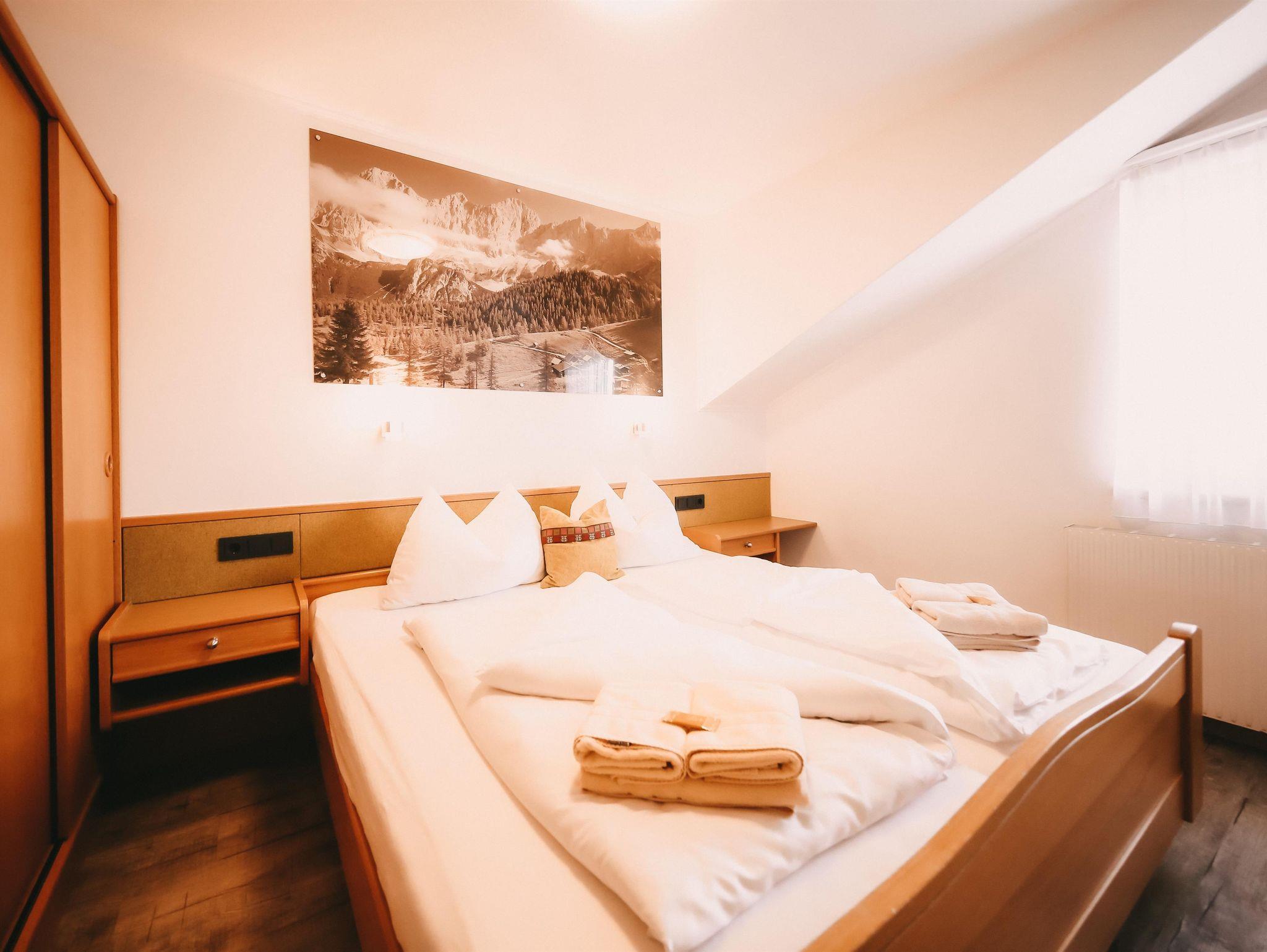 Appartement im Appartementhaus mit einem Doppelzimmer und einem Schlafsofa für zwei Personen in der Wohnküche. Der Balkon zeigt Richtung Dachsteinmassiv.