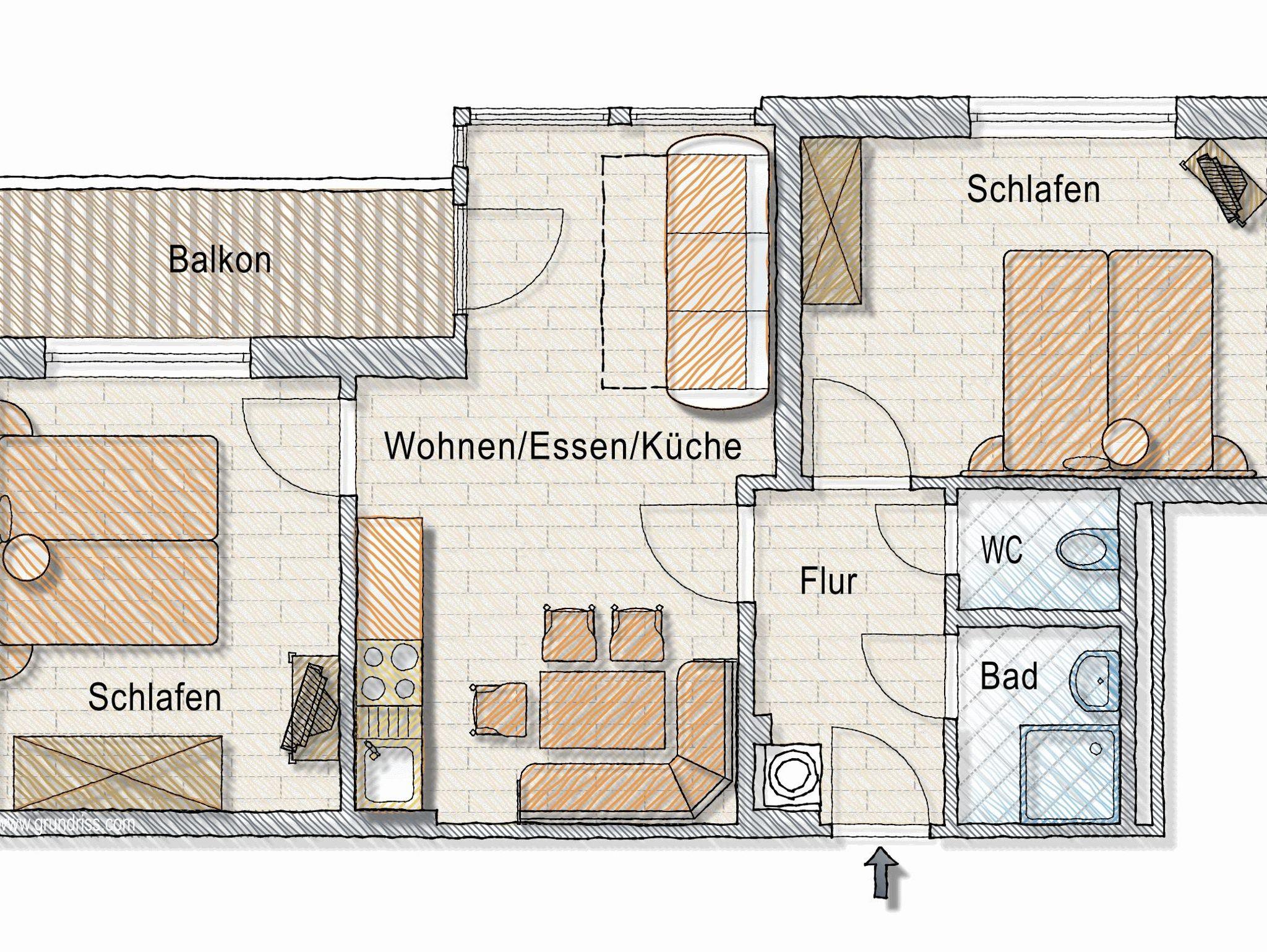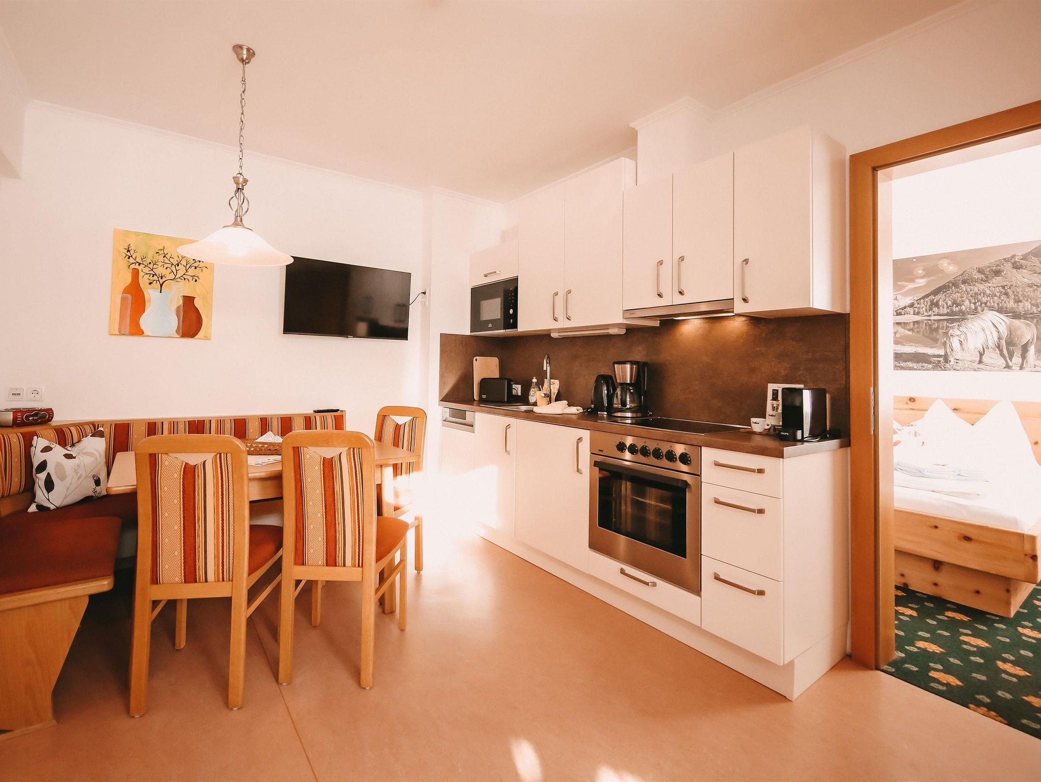 geräumiges Appartement im Appartementhaus mit zwei Doppelzimmern. Wenn man das Sofa in der Wohnküche mitbenützt, bietet das Wintergartl platz für bis zu 6 Personen. Der Ausblick nach Süden vom Wintergarten und vom Balkon lässt die Morgensonne ins Zimmer scheinen