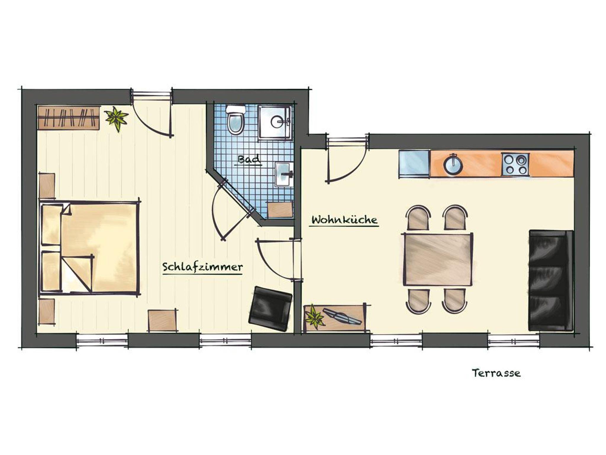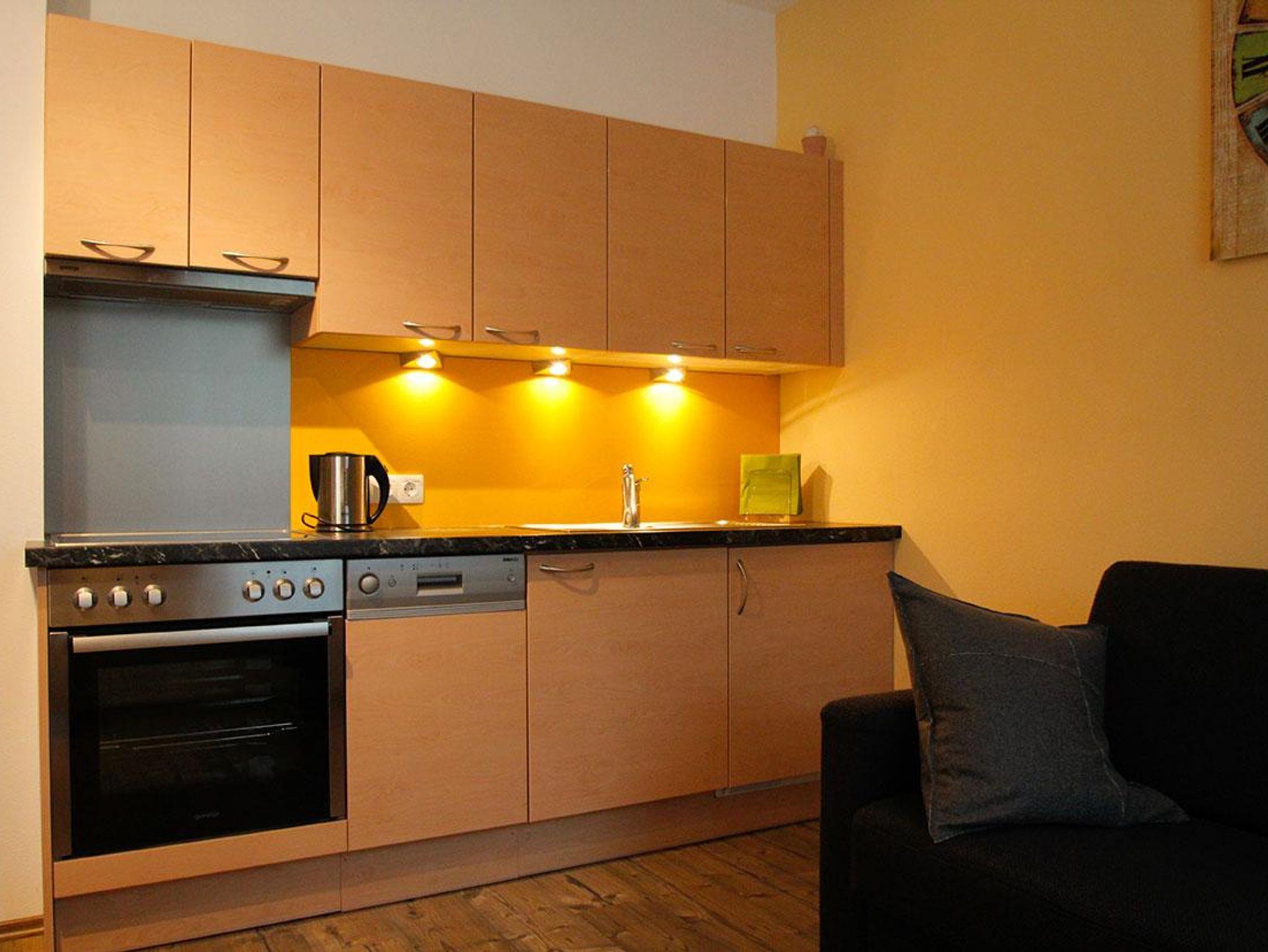 Schlafzimmer, Wohnküche mit großem Schlafsofa einem Badezimmer (Dusche, WC und Fön) / Ausstattung: LCD-Screen mit SAT, gratis Internet WLAN, komplett eingerichtete Küche mit Kühlschrank, E-Herd mit Backrohr, Mikrowelle, Geschirrspüler, Kaffeemaschine, Wasserkocher, Geschirr, Kochtöpfe, Handtücher, Bett- und Küchenwäsche. / Das Appartement Blumenwiese befindet sich im Untergeschoß (ebenerdig).