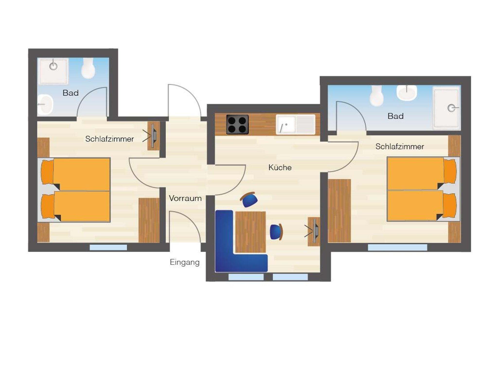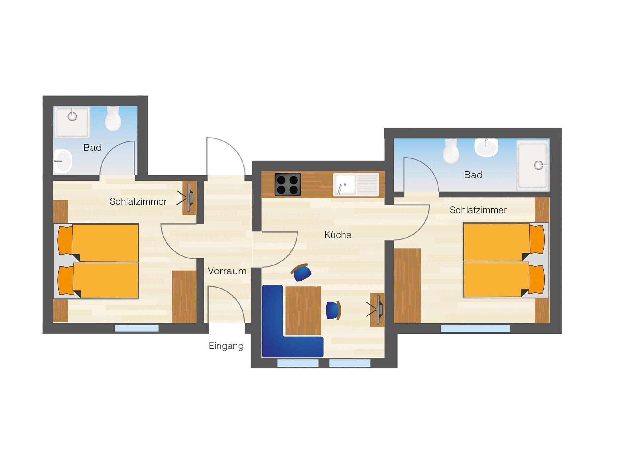 Appartement bestehend aus 1 Wohnküche, 2 Schlafzimmern jeweils mit Bad, WC und TV sowie 1 Vorraum mit Schuhtrockner. Kostenloser Internetanschluß. Küche mit E-Herd, Geschirrspüler, Kühlschrank, Mikrowelle, Wasserkocher, Toaster, TV und Kaffeemaschine. Gegen Aufpreis bieten wir Ihnen gerne Brötchenservice.
