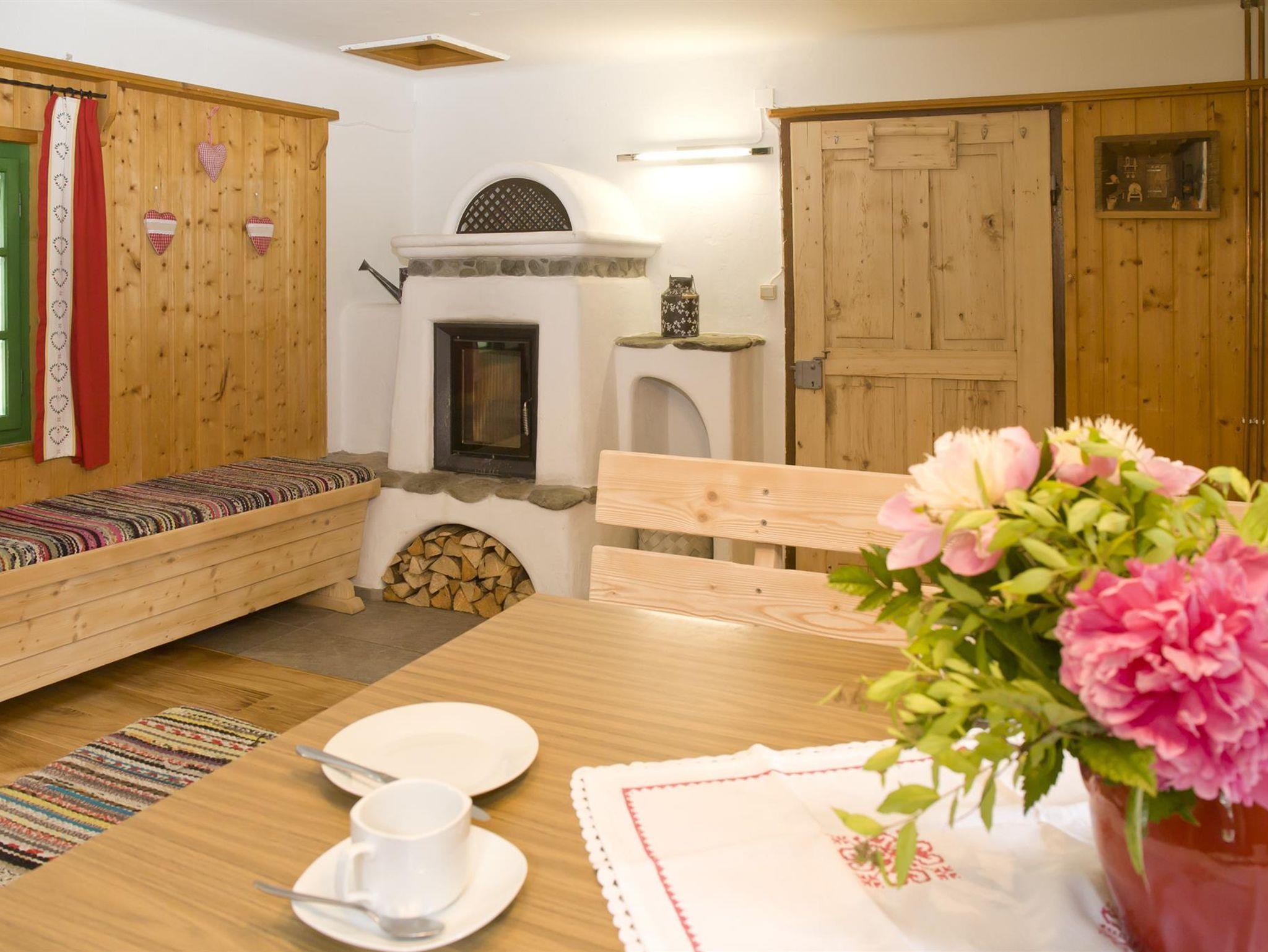 Die Hütte hat drei Schlafkammern für 6 Personen. Eine große Wohnküche mit Kachelofen,