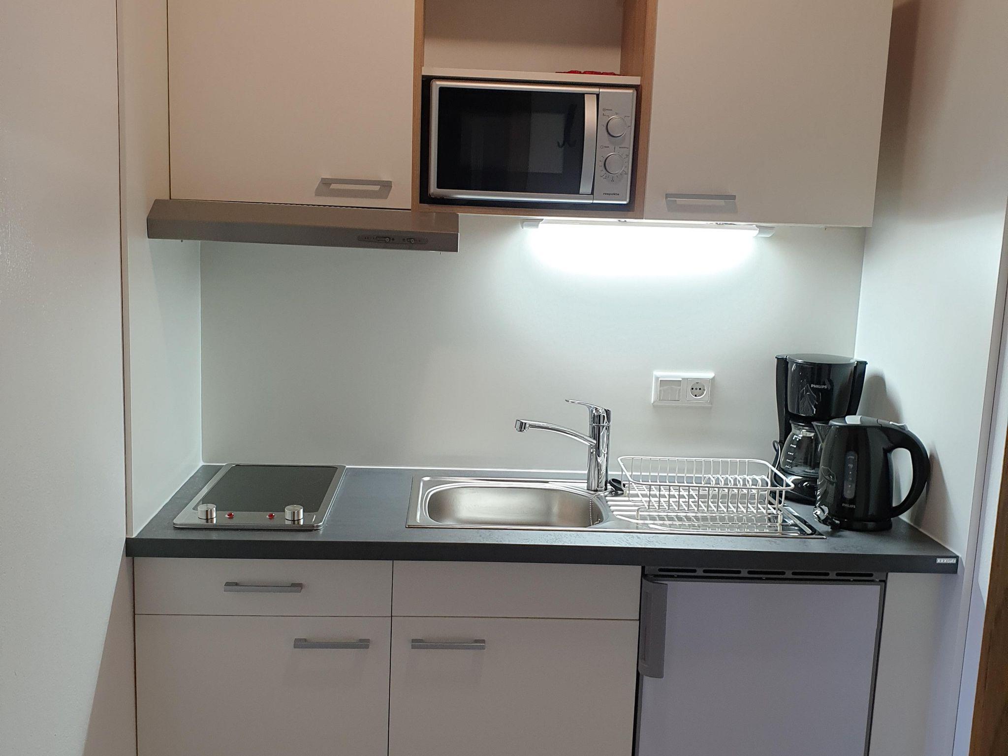 Das Appartement hat einen Schlaf-wohn Raum mit einer Kochnische und Sitzecke, ein Doppelbett und eine Schlafcouch, Badezimmer mit Dusche und WC. Das Schlafzimmer hat ein Doppelbett und eine Schlafcouch ein eigenes WC und Waschbecken.Beide mit Balkon. Das Appartemetn ist für 4 Erwachsene und 2 Kinder.