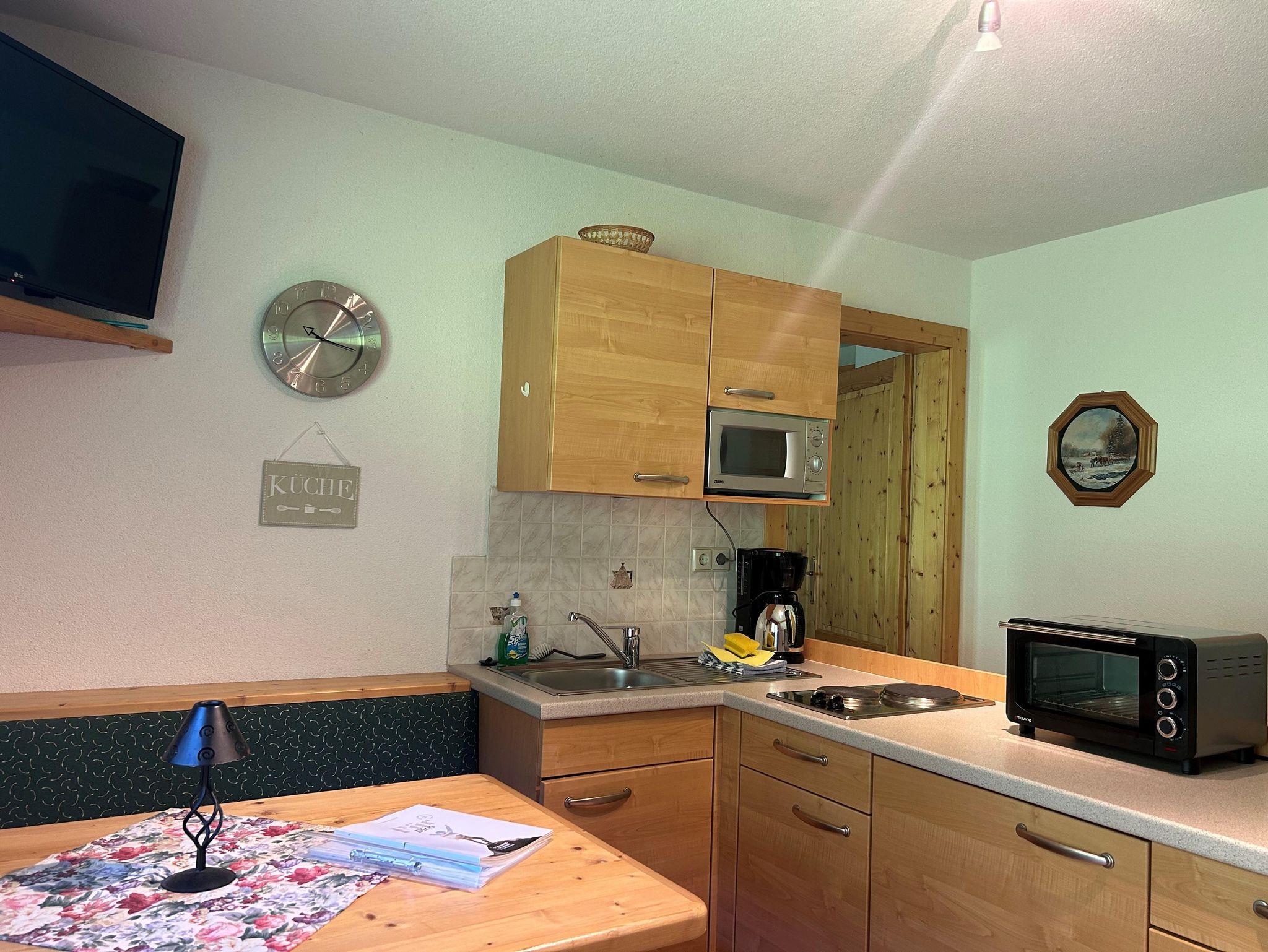 Die Wohnküche ist ausgestattet mit E-Herd, Kühlschrank, Mikrowelle, kleinem Backofen, Kaffeemaschine und weiteren Küchenutensilien.
