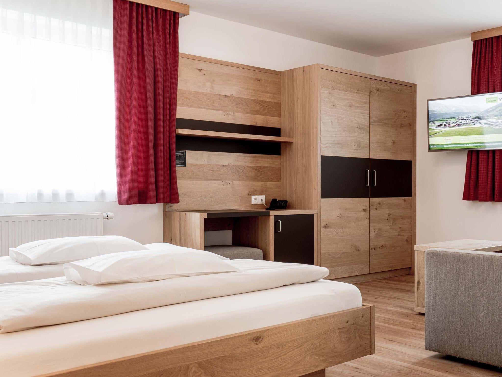 Die vollausgestatteten Appartements und Zimmer sind großzügig gestaltet, warme Farben und viel Holz sorgen für ein angenehmes Wohngefühl. Eine wohltuende Auszeit und Ruhe genießt du im kleinen, aber feinen Wellnessbereich mit Finnischer Sauna, Kräutersauna und Infrarotkabine. Weiteren Komfort bietet die Parkgarage (reservierungs- und kostenpflichtig) mit direktem Zugang zum Appartementgebäude und zum Aufzug sowie ein Ski- und Schuhraum mit beheizten und verschließbaren Skisafes.