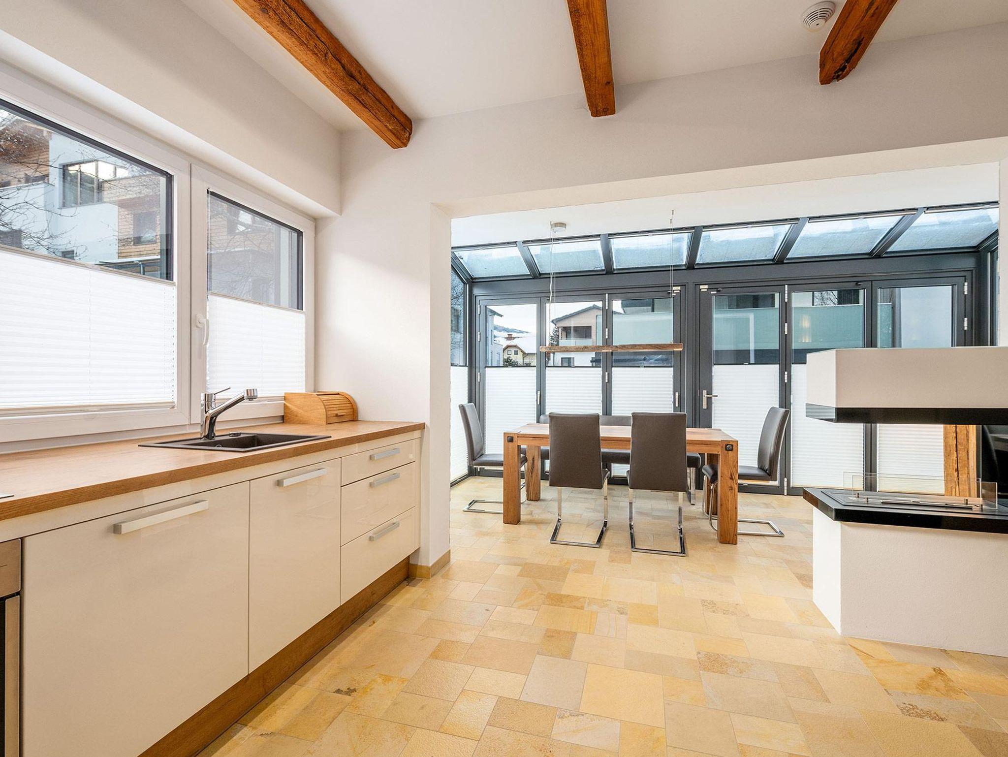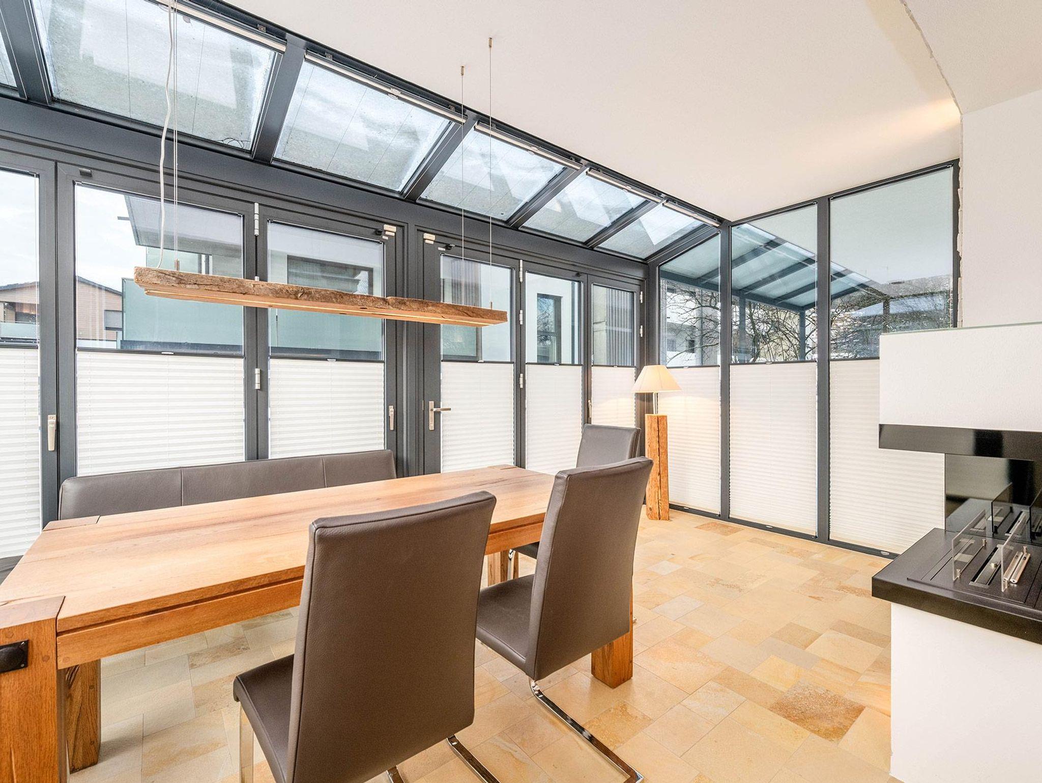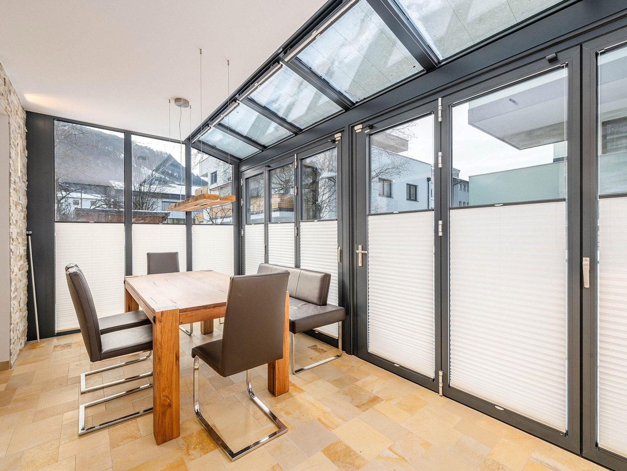 Auf 64 m² Wohnfläche bietet das Apartment Platz für bis zu 5 Personen. Zwei getrennte Schlafzimmer mit jeweils einem 180 cm Doppelbett sorgen für höchsten Schlafkomfort, ergänzt durch ein Schlafsofa im Wohn- und Essbereich. Der lichtdurchflutete Wintergarten mit Essbereich verbindet Innen- und Außenraum auf elegante Weise, während die private Terrasse zum Entspannen nach einem aktiven Tag in den Bergen einlädt.