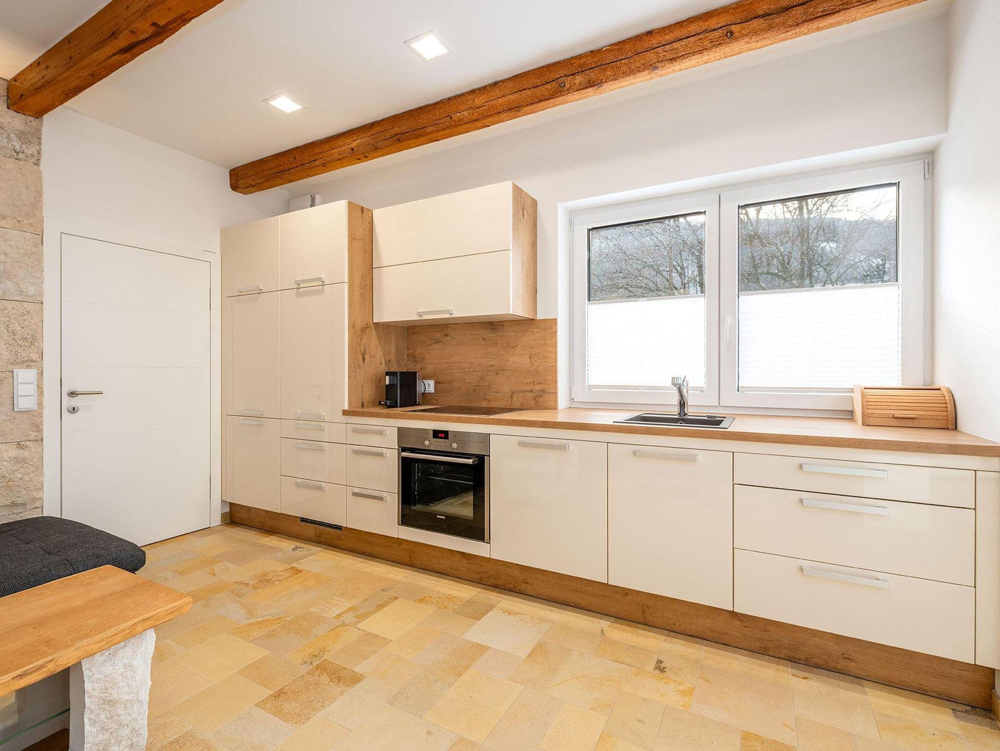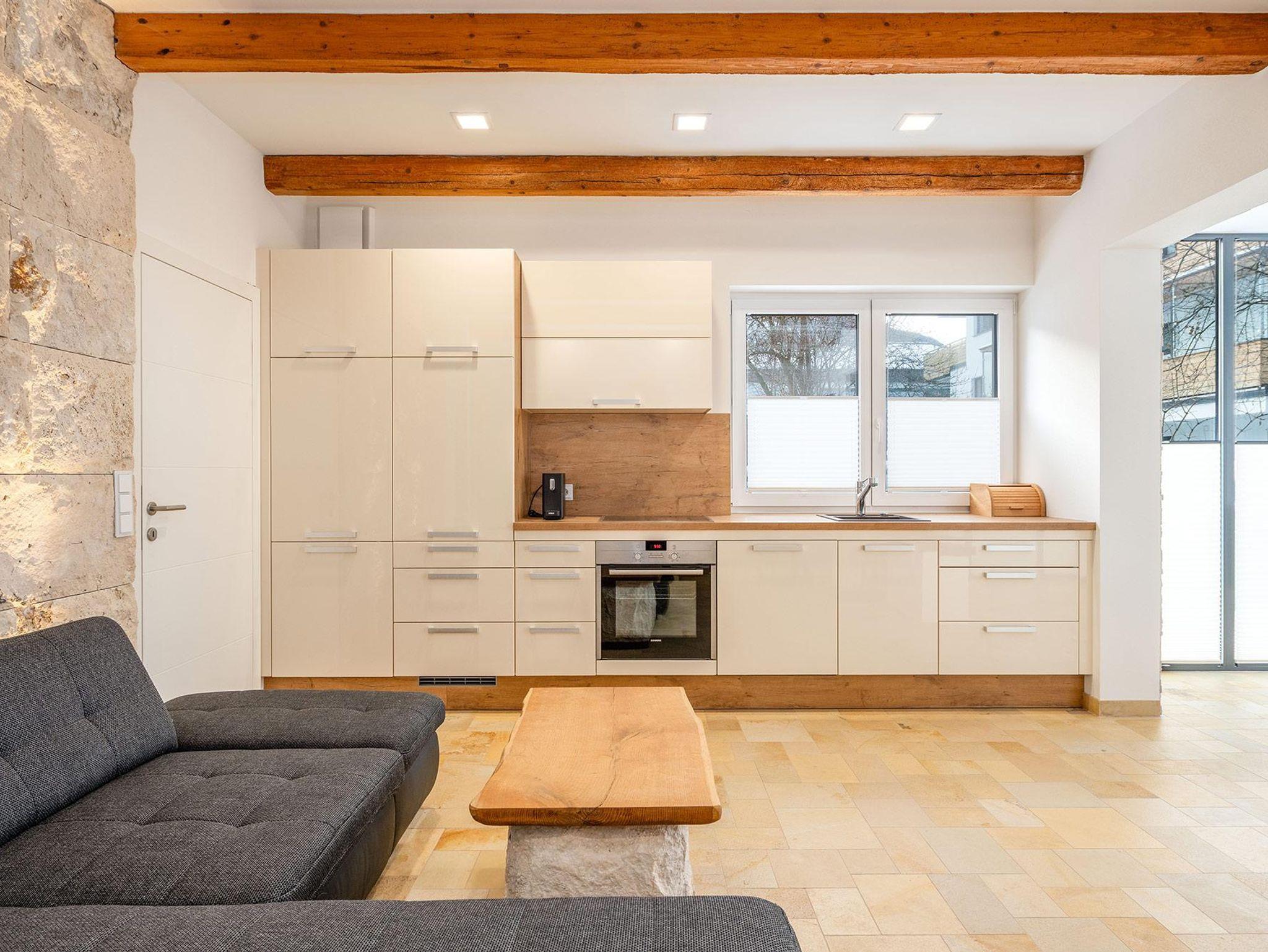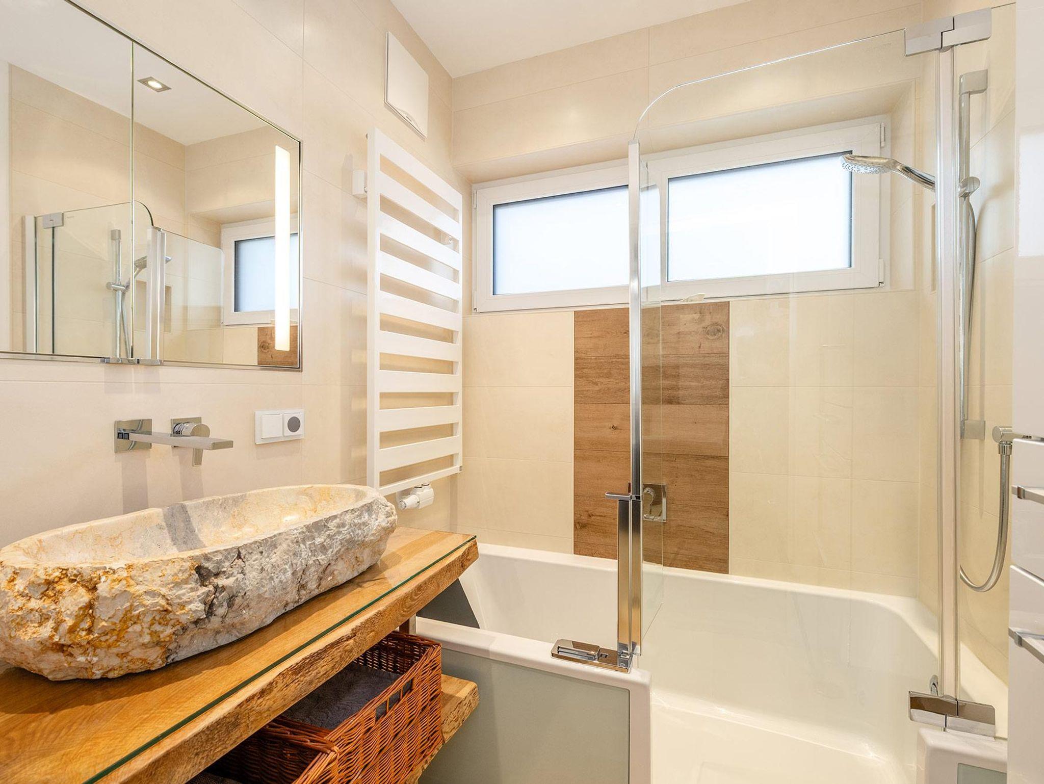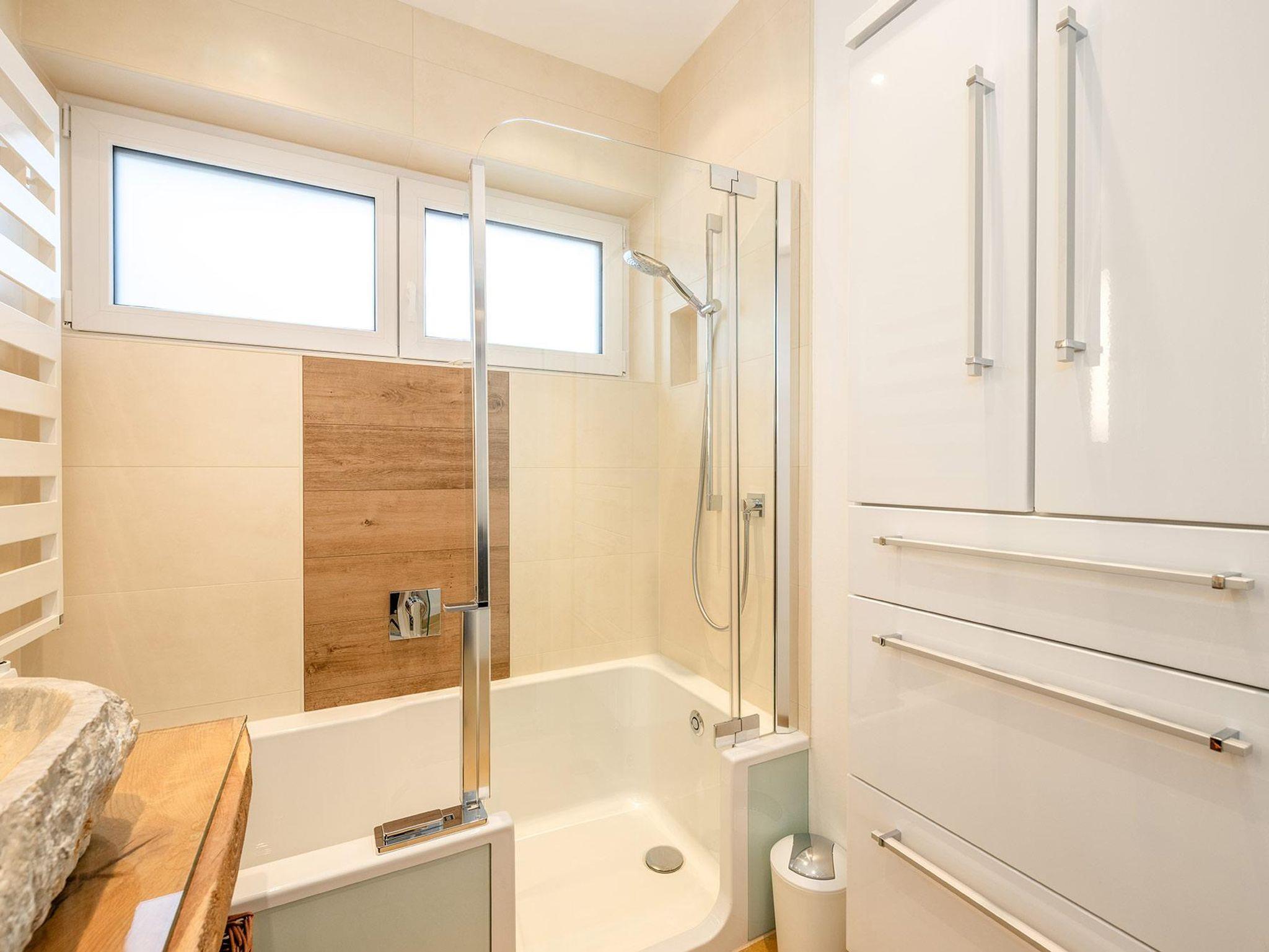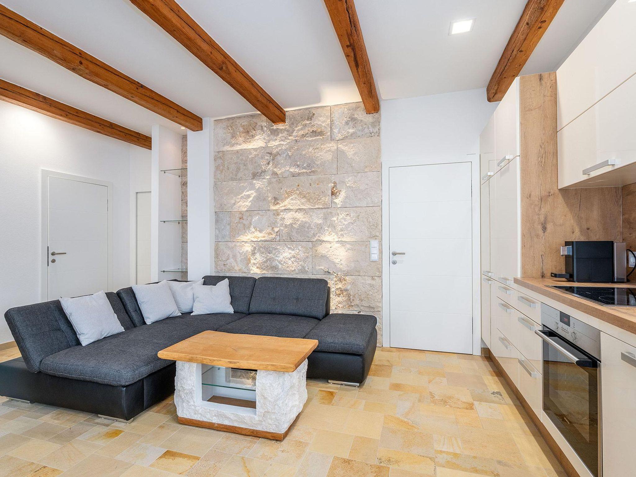 Das großzügige Badezimmer ist mit Badewanne/Dusche ausgestattet, wobei die begehbare Badewanne auch für Personen mit eingeschränkter Mobilität geeignet ist. Ein separates WC sorgt für zusätzlichen Komfort. Die hochwertig ausgestattete Wohnküche sowie ausgewählte Designmöbel unterstreichen den exklusiven Charakter des Apartments.