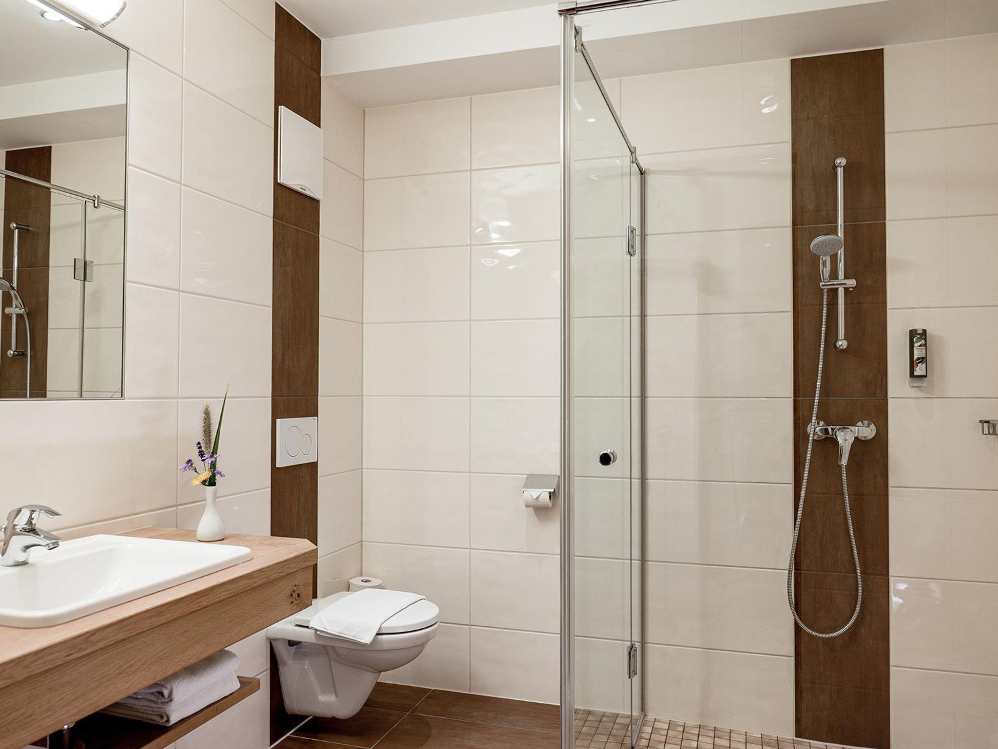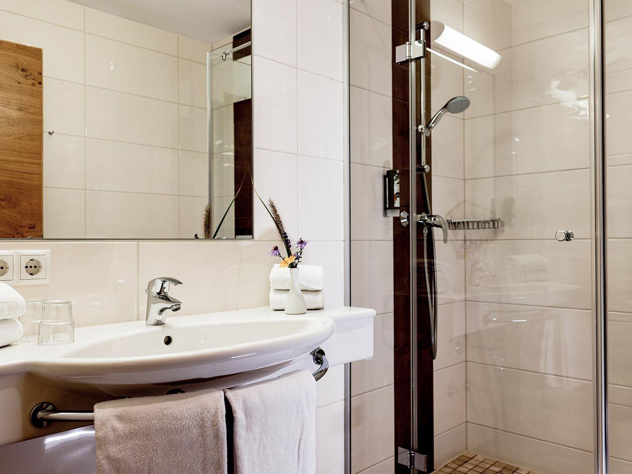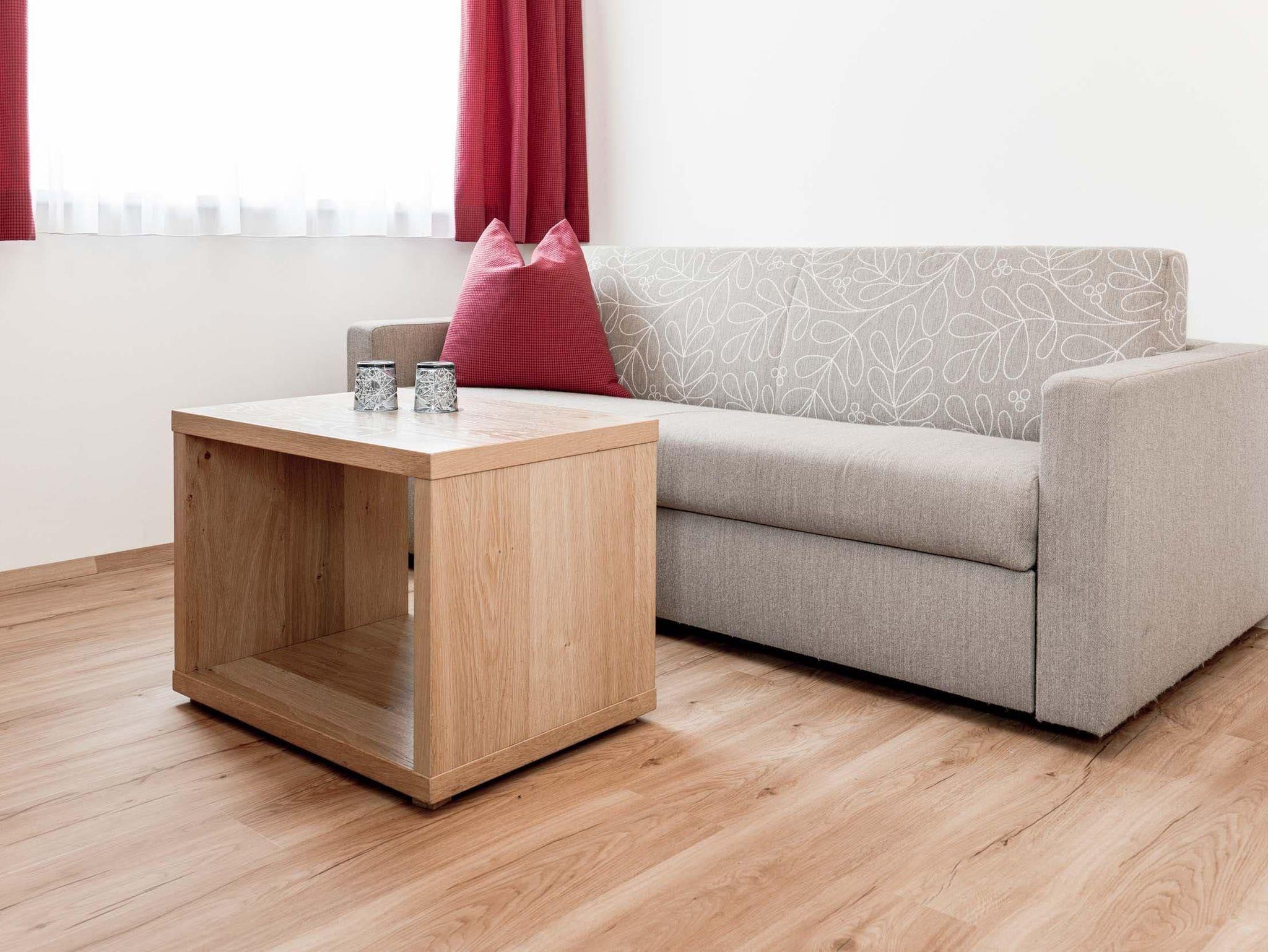 PLUS Doppelzimmer mit ca. 25 m². Die PLUS Doppelzimmer verfügen über ein Doppelbett und eine zusätzliche Schlafcouch für 1 Person, 1 Badezimmer mit Dusche und WC. Alle Appartements und Zimmer sind mit Telefon, TV, Safe, Föhn und WLAN Internet ausgestattet.