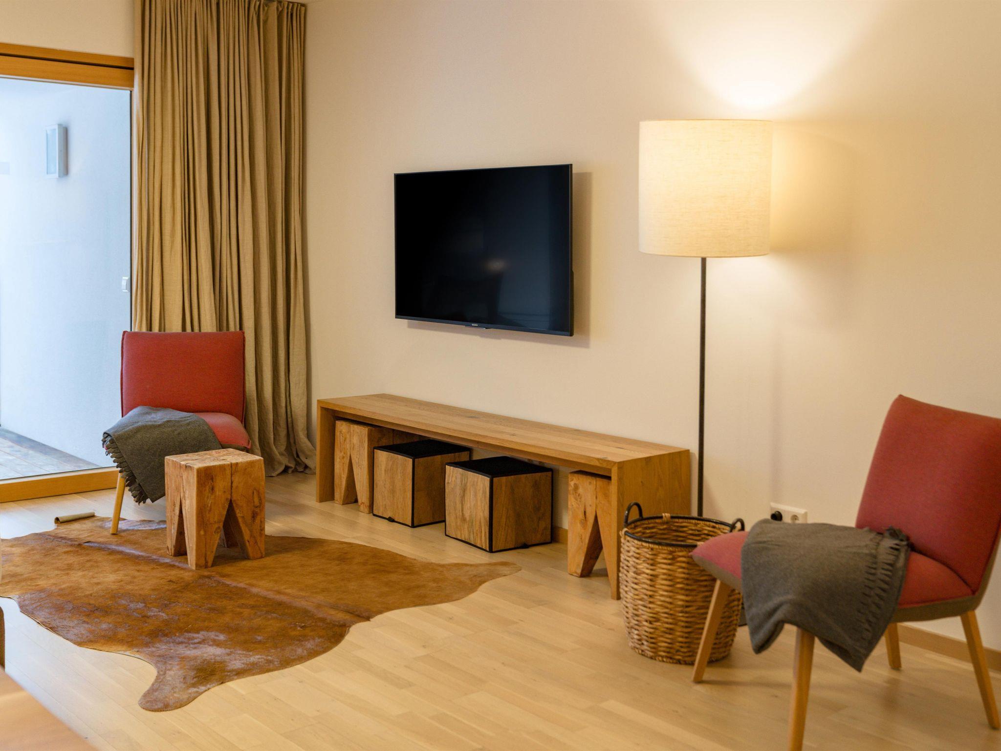 3 miteinander verbunden Häuser 38 servicierte Appartements, von 40m² Studios, Appartements mit einem, zwei oder drei Schlafzimmern bis hin zu 130m² Penthäusern, herrlichen Ausblick und Top Ausstattung inklusive! Die hochwertige Grundausstattung der Appartements mit heimischen Materialen wie Holz, Stein und Glas vermitteln ein modernes Wohlfühlambiente mit viel Licht und Aussicht, - eine Symbiose aus purem Lebensgefühl und Kraftplatz an der Sonne. Komplett ausgestattete Designküchen, großzügige Wohnräume zum Teil mit offenem Kamin, moderne & stylische Möbel, kostenfreies WLAN, Kabel TV in allen Schlaf- und Wohnräumen sowie moderne und lichtdurchflutete Badezimmer, lassen für den Gast, der seine private Freiheit schätzt, keine Wünsche offen .