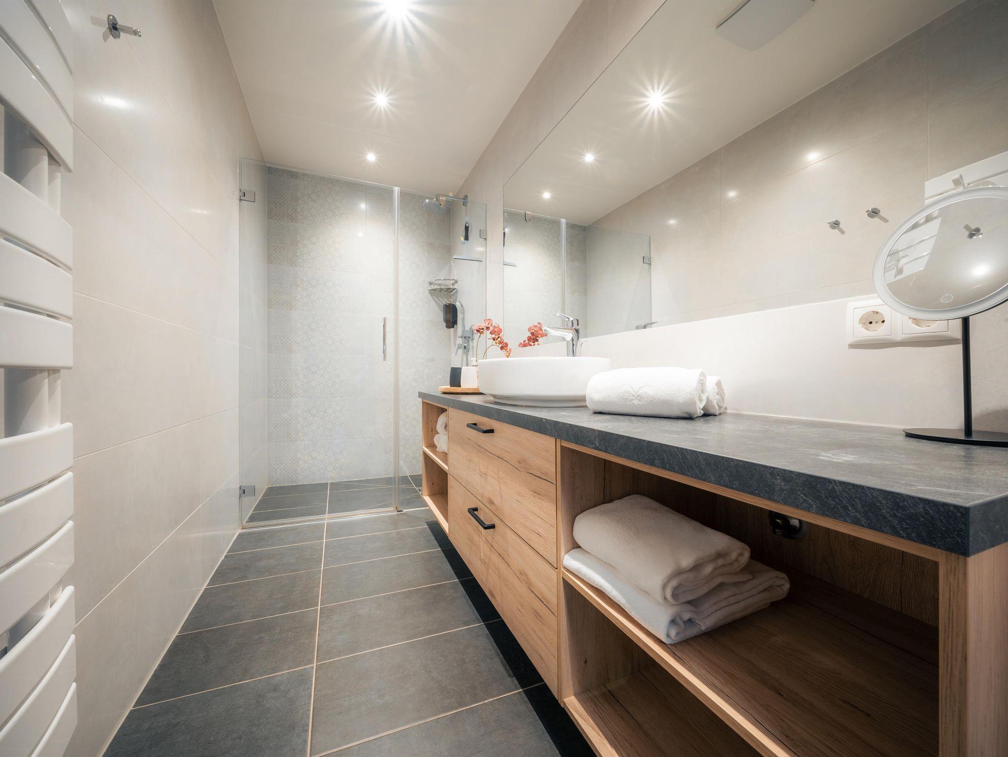 Eben alles was man so braucht. By the way: Das Auto kannst du in der Tiefgarage lassen. Servus im Gustav – 8 Appartements von Smart bis Sky – außerdem mit dabei: Private Sauna im Appartement, eigene Terrasse oder Balkon Top 8 hat keine Balkon, komplett ausgestattete Küchen mit allem PiPaPo, 1-2 Schlafzimmer und Bäder sowie eine Aussicht nach Westen auf die Hochwurzen und das eine oder andere Chi-Chi.