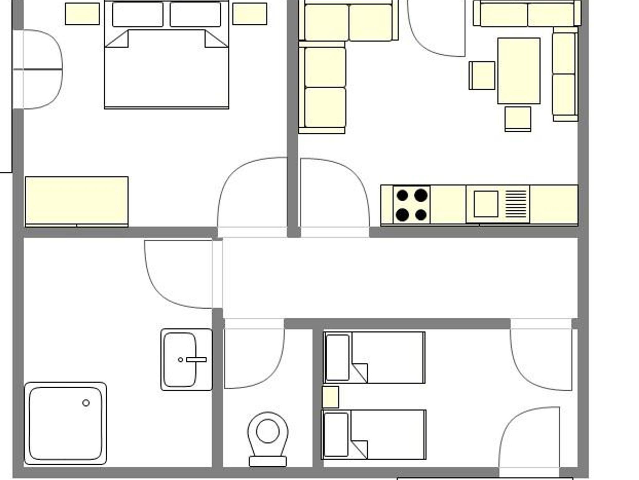 1 Doppelzimmer (entweder mit 2 Einzelbetten oder auch zusammenstellbar), 1 Dreibettzimmer (Doppelbett und Einzelbett),Wohnküche, Bad und extra WC ausgestattet zusätzlich mit Fußbodenheizung