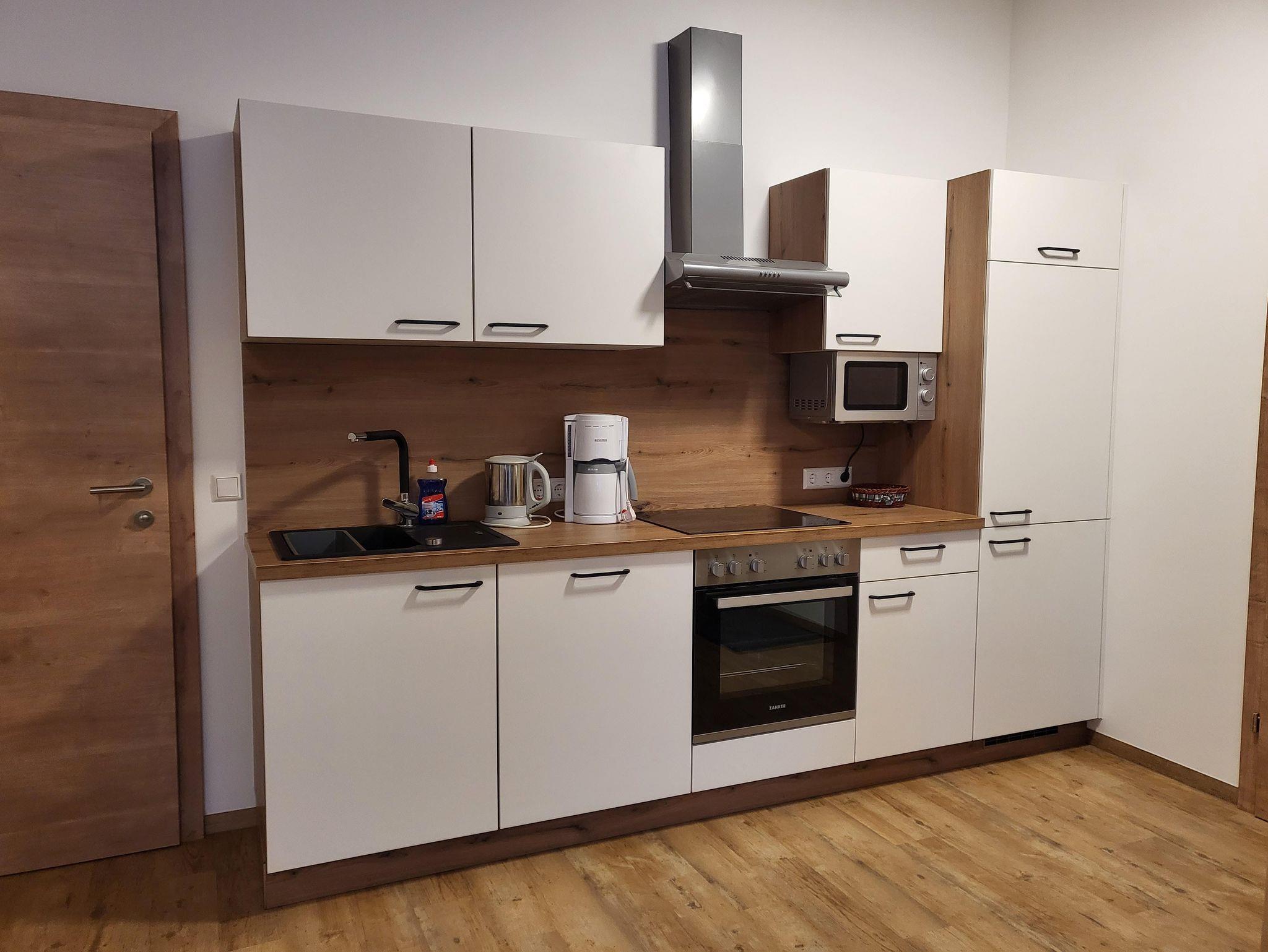 Die Wohnung ,,Enzian“ hat eine Wohnküche mit E-Herd, Backrohr, Mikro, Kaffeemaschine, Wasserkocher, Kühlschrank mit Gefrierfach und Geschirrspüler.