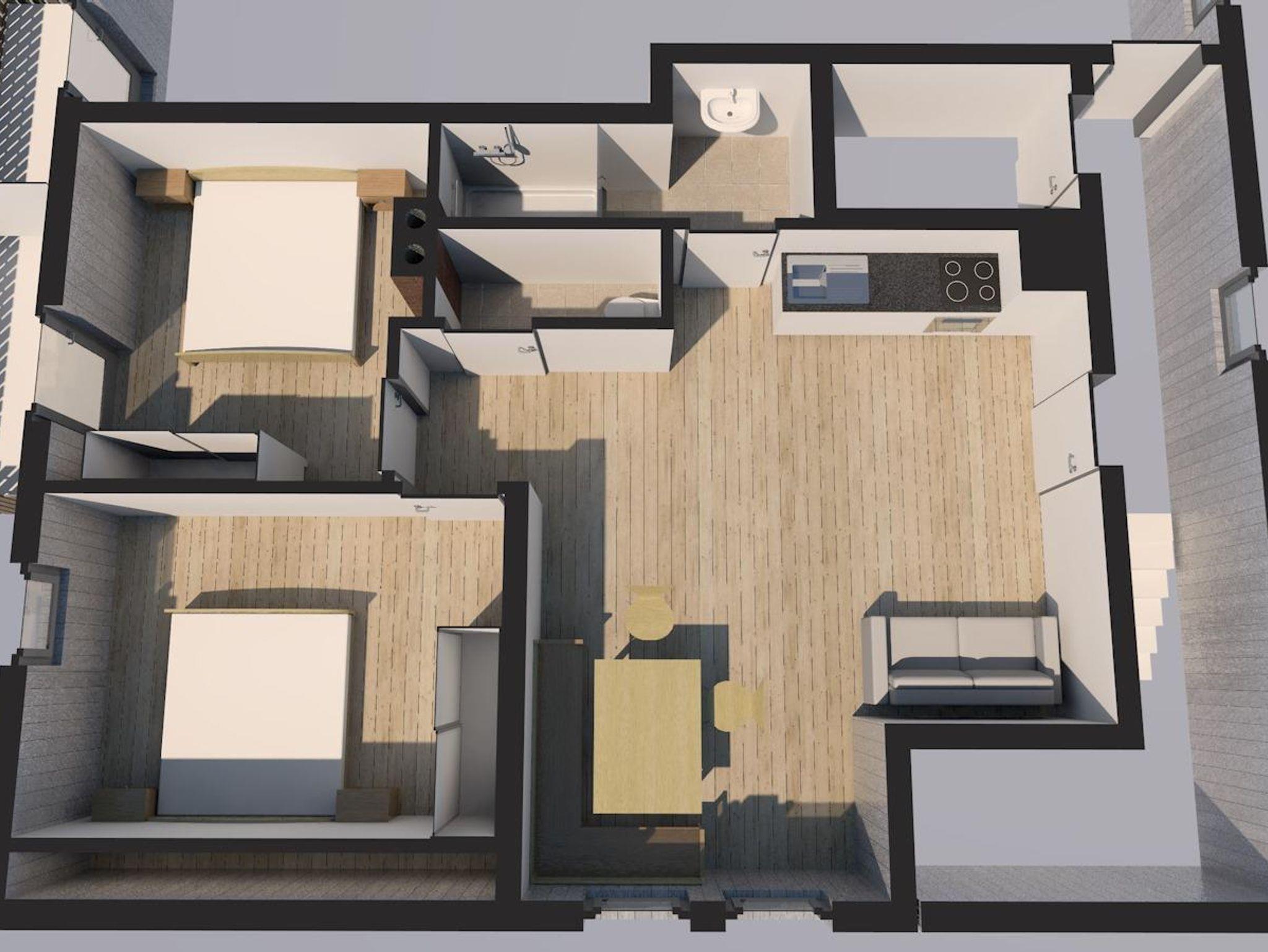 2 getrennte Schlafräume, Badezimmer mit Dusche, WC und Balkon zur Südseite.