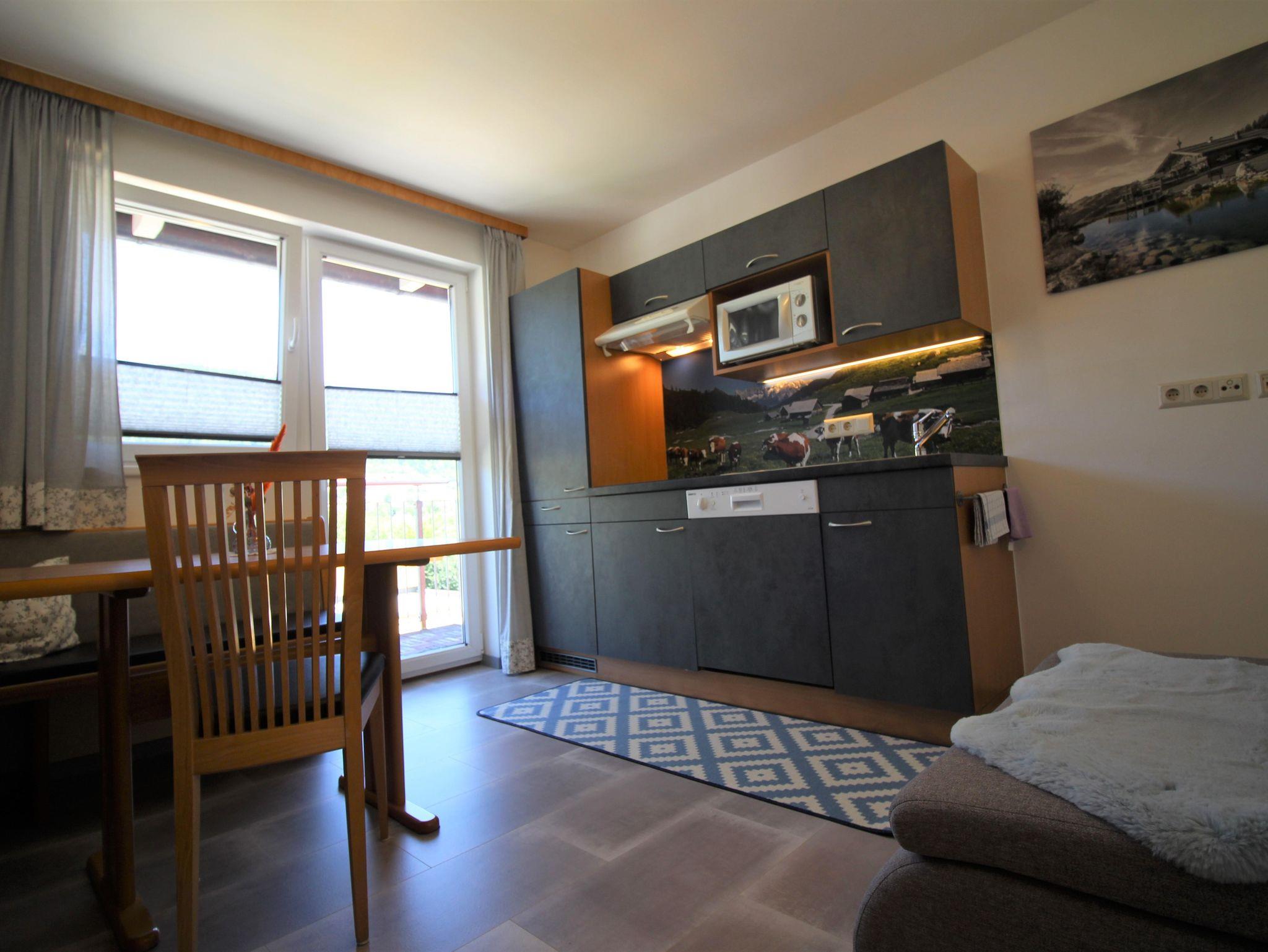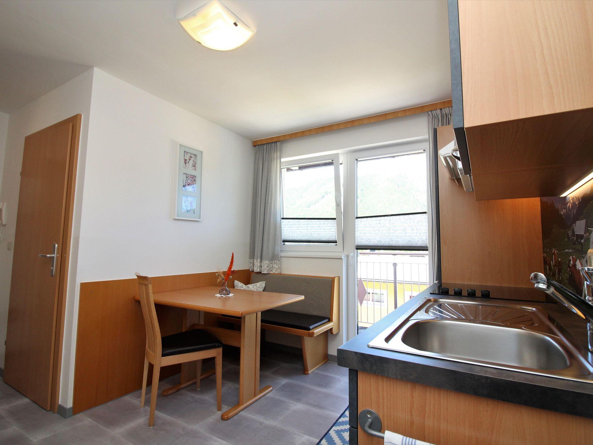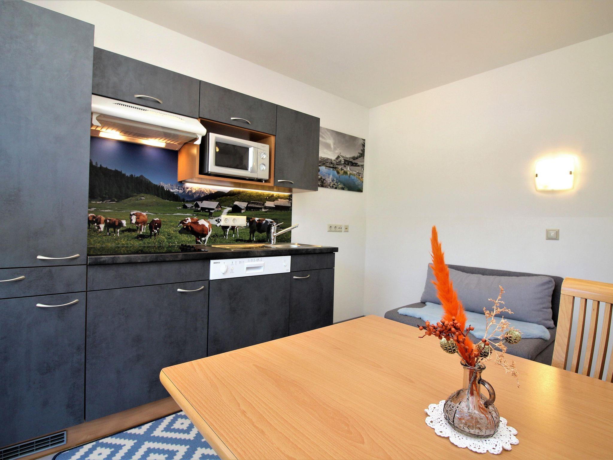 Unser Appartement besteht aus einem Schlafzimmer, einer Wohnküche und einem Bad. Es ist für 2-3 Personen geeignet. Jedes unserer Appartements ist ausgestattet mit: Kabel-TV, Mikrowelle, Geschirrsptrler, Ku¨hlschrank mit Gefrierfach, Kochplatten, Kaffeemaschine, Wasserkocher, Geschirr, Handtu¨cher und Bettwäsche. Ein Schi- und Schuhraum steht zur Verfu¨gung und wir bieten auch Brötchenservice.