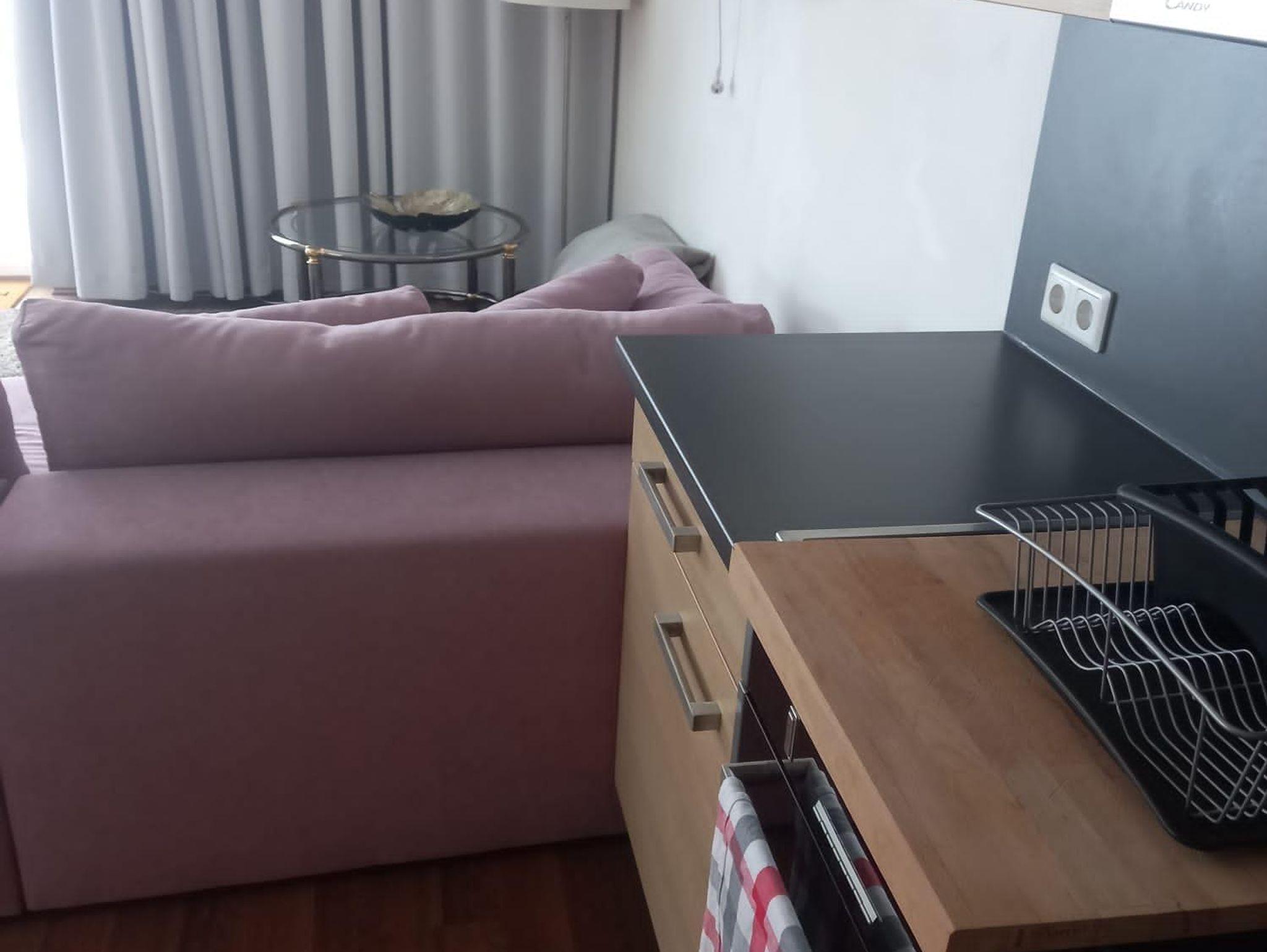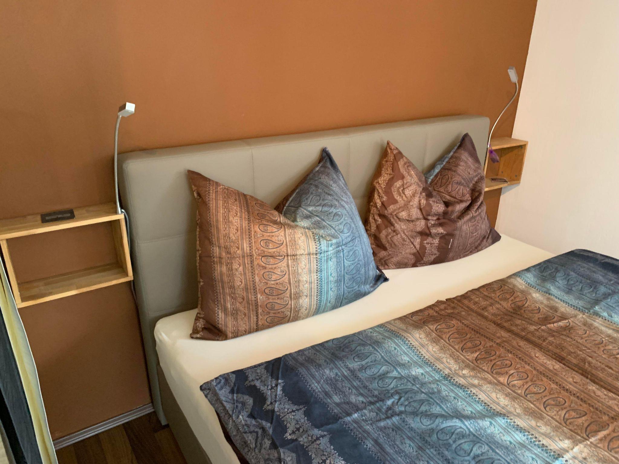 Neben einem Boxspringbett ist die Wohnküche mit einem gemütlichen Sofa ausgestattet.