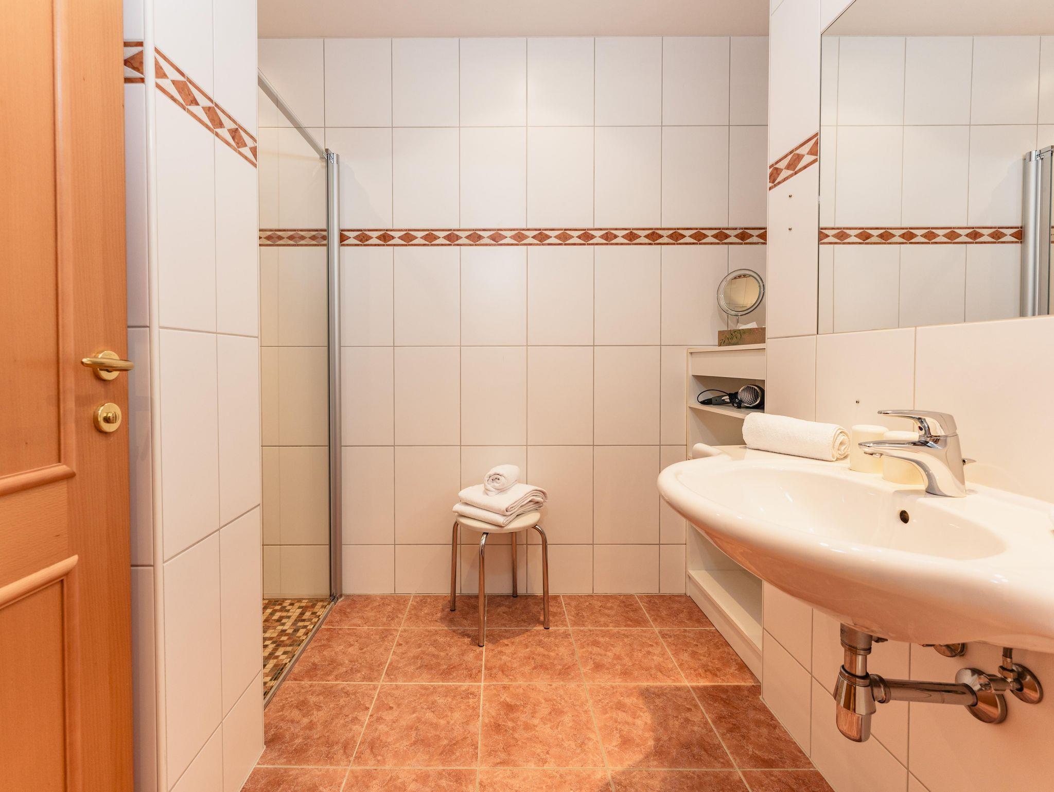 - 1 Badezimmer mit Dusche, Doppelwaschbecken & einem separaten WC im Vorraum