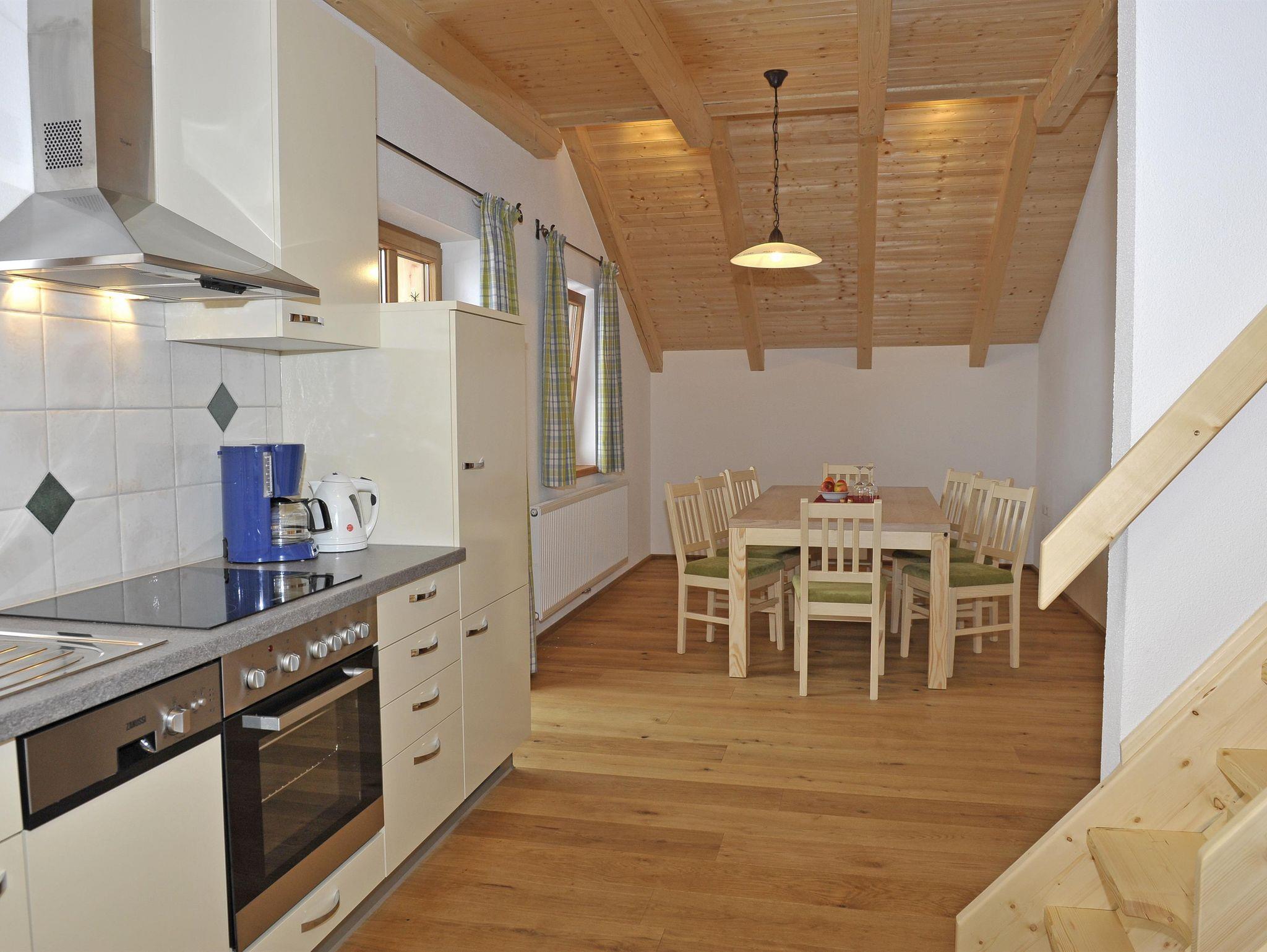 Für eine Familie mit vielen Kindern ist das Appartement Enzian ideal. Es befindet sich ein großes Doppelzimmer mit fixem Zustellbett im Appartement und ein weiteres Schlaflager (4-5 Personen) im ausgebauten Dachboden. Dieses Schlaflager ist über eine Stiege vom Wohnbereich aus erreichbar. Ein sehr geräumiges Bad sowie ein getrenntes WC und eine schöne Wohnküche warten auf Sie.