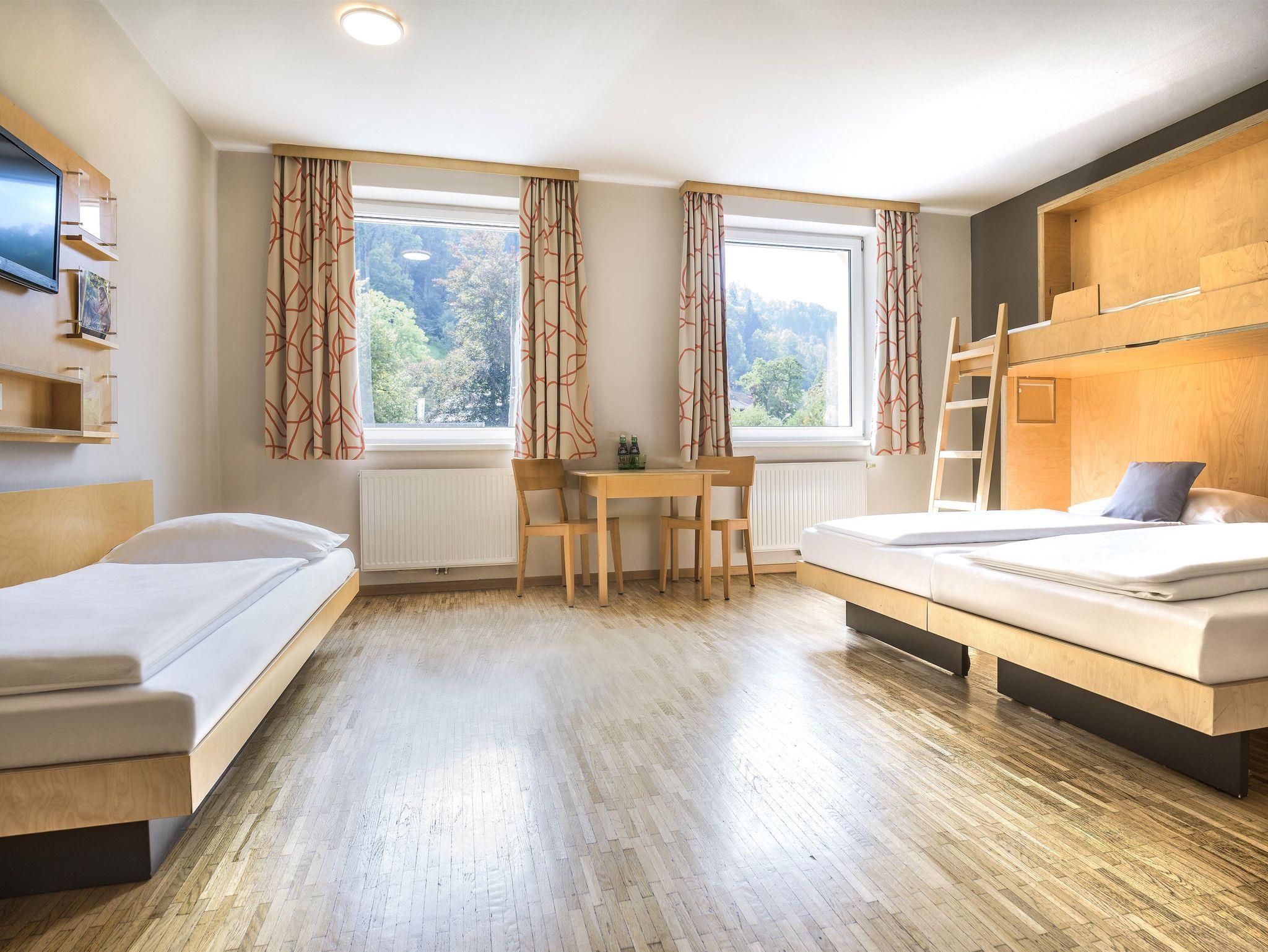 Helle und freundliche Zimmer mit flexiblen Bettensystemen (Doppel-, Einzel-, Sofa-, und Etagenbetten), funktionelle Einrichtung aus natürlichen und regionalen Rohstoffen. Badezimmer mit Dusche/WC