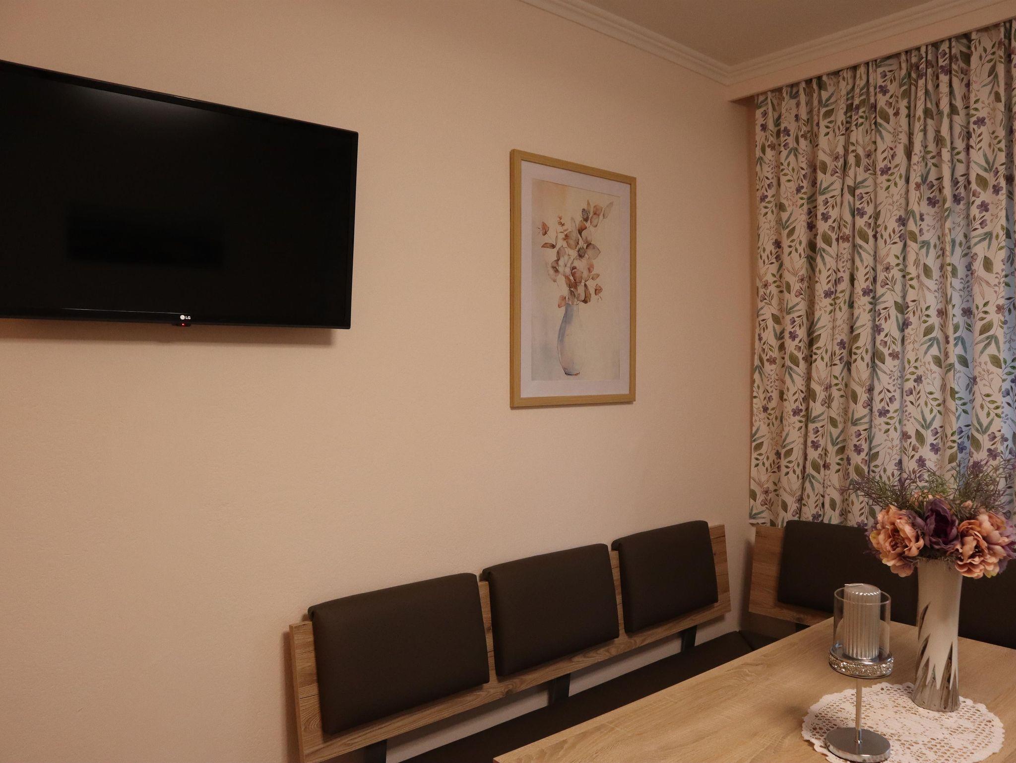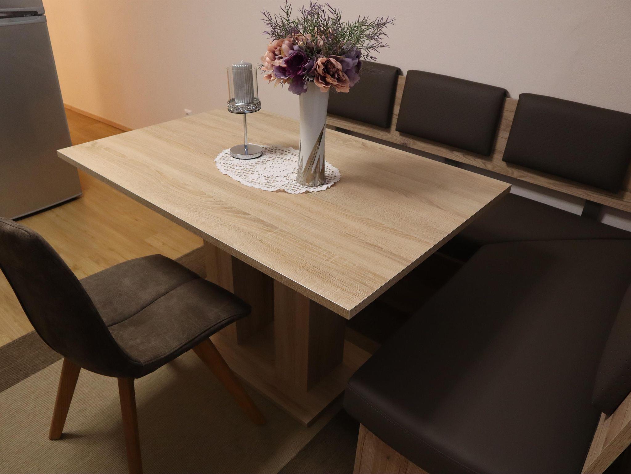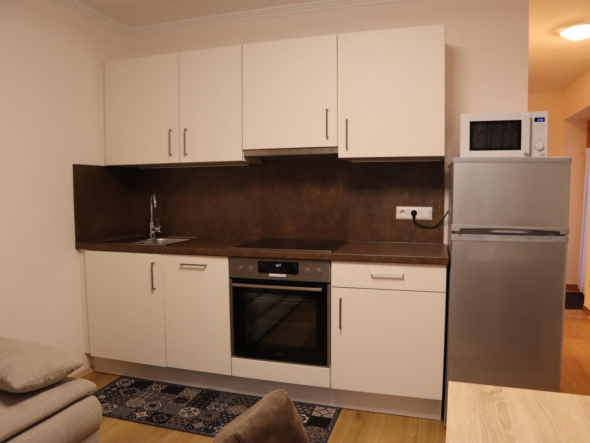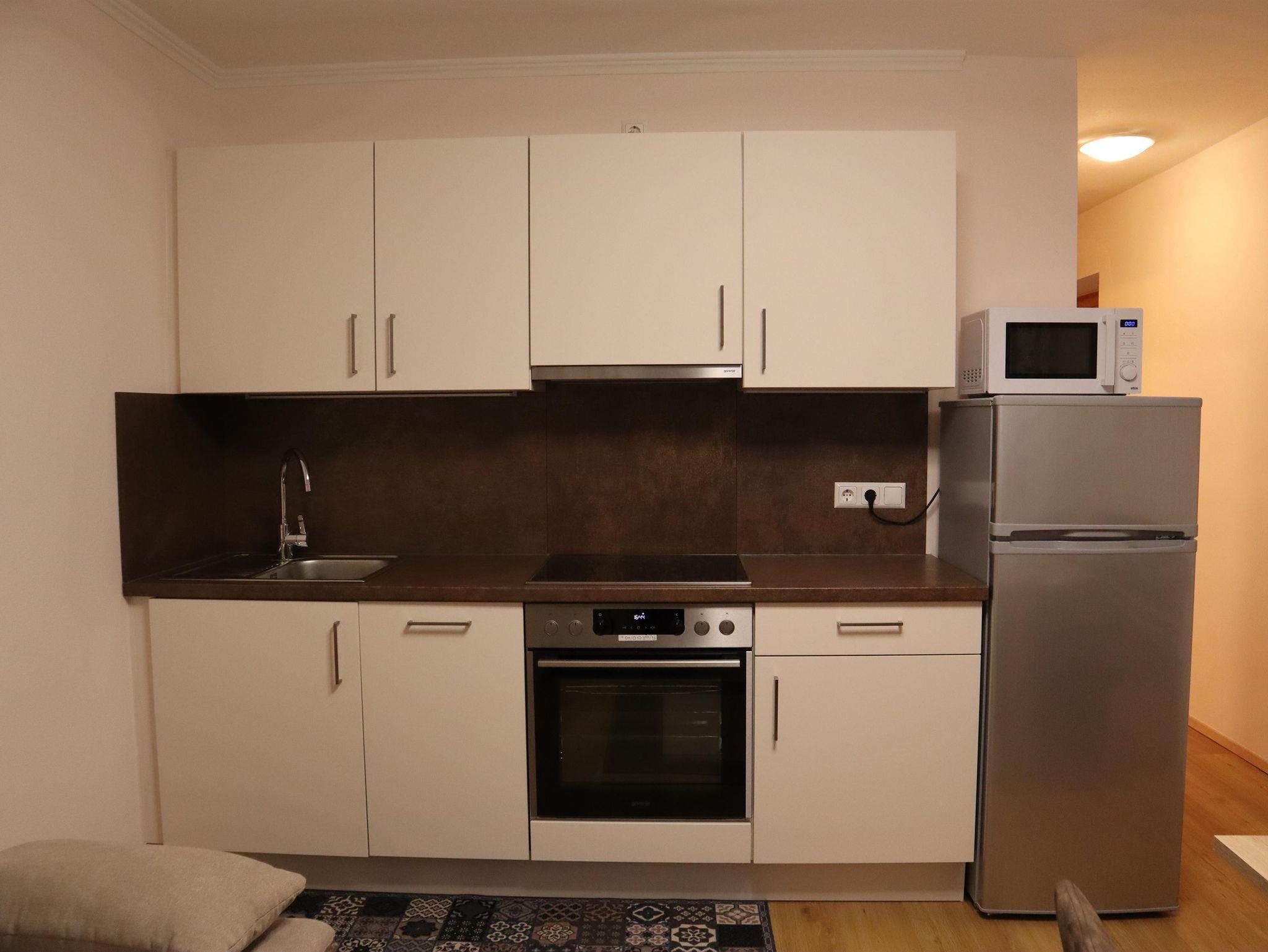 Außerdem gibt es einen Esstisch mit 4 Stühlen, eine ausziehbare Couch (max. 2 Personen) und einen Fernseher in der Wohnküche. Die Wohneinheit bietet auch einen Zugang zur Terrasse. Das Appartement hat auch 1 Badezimmer inklusive Toilette und Dusche, wo auch ein Haarföhn zur Verfügung steht.