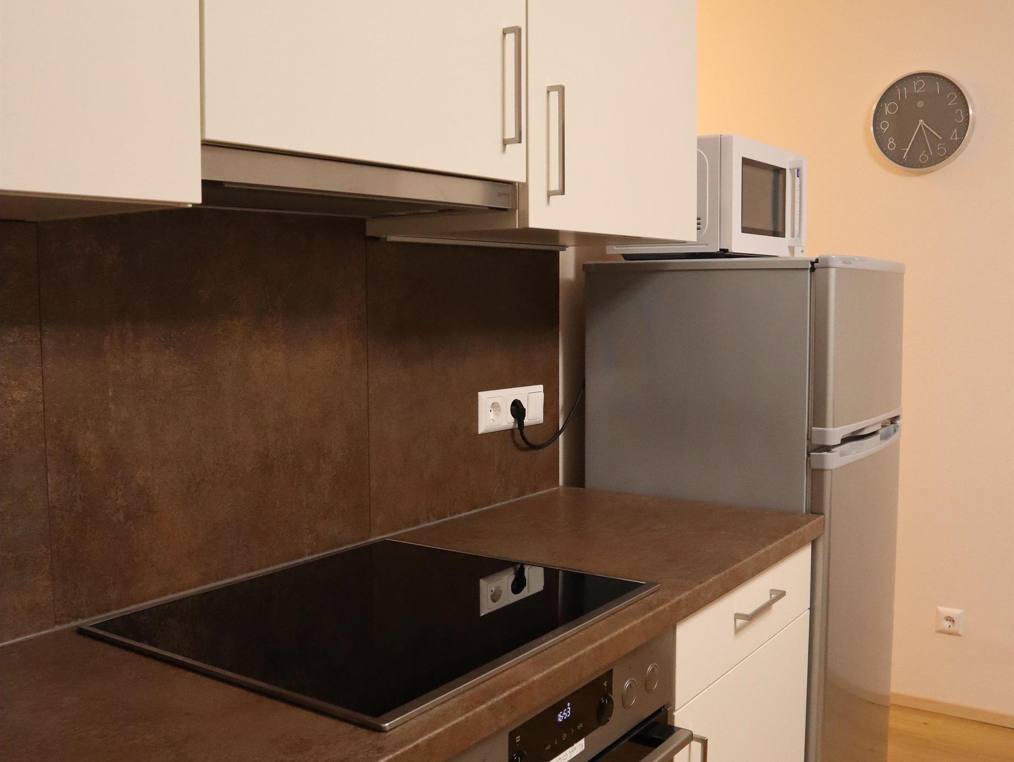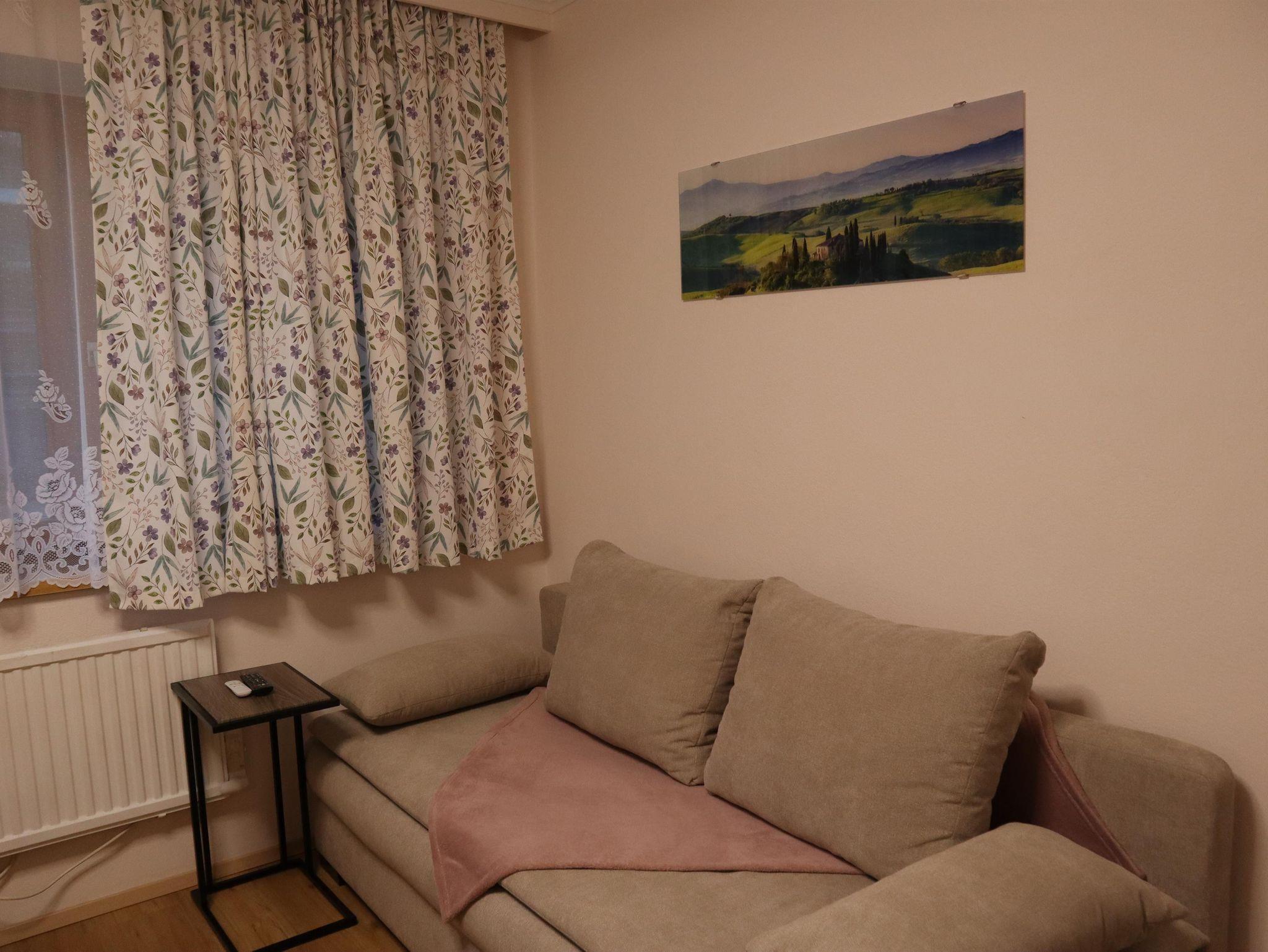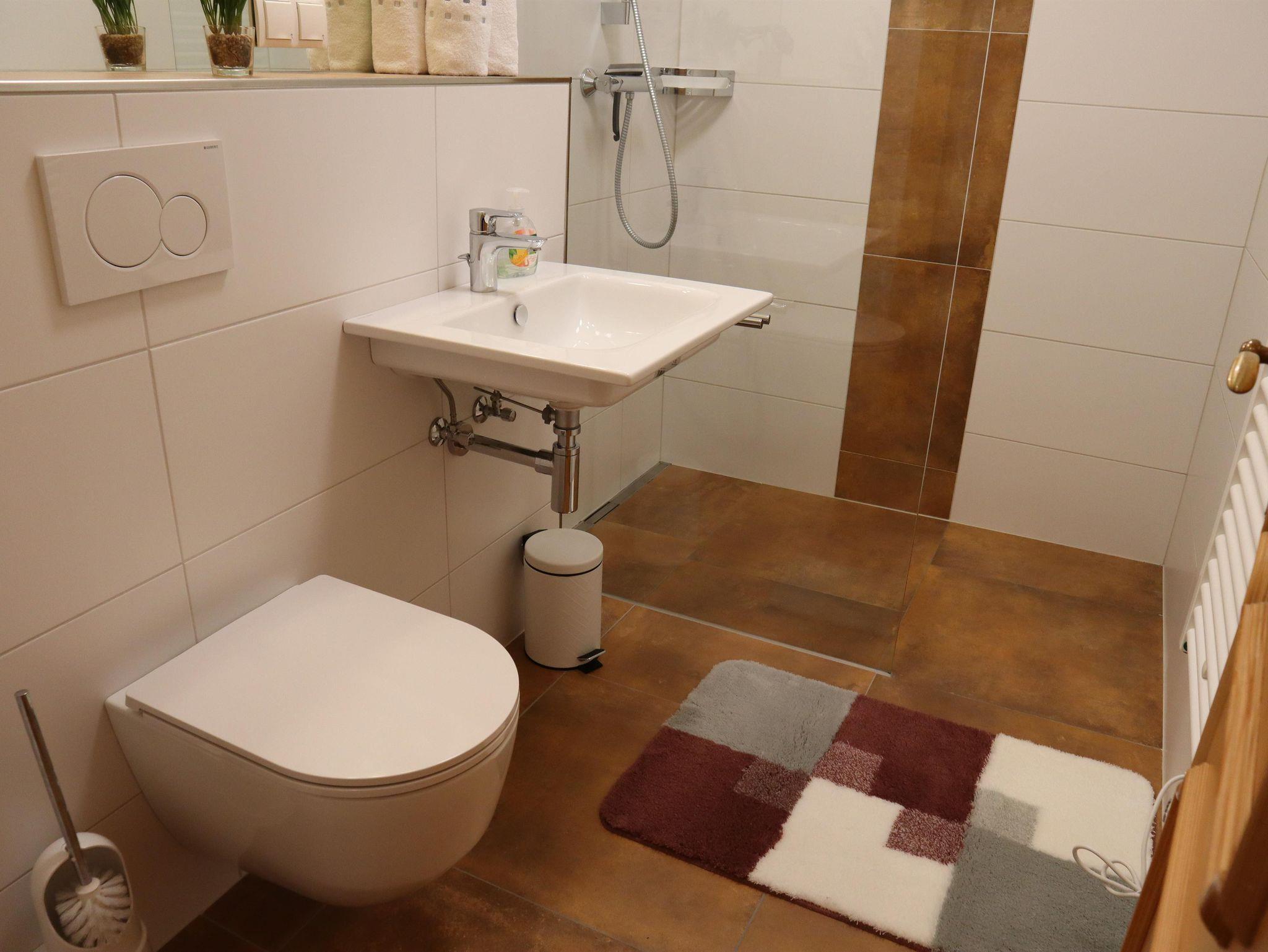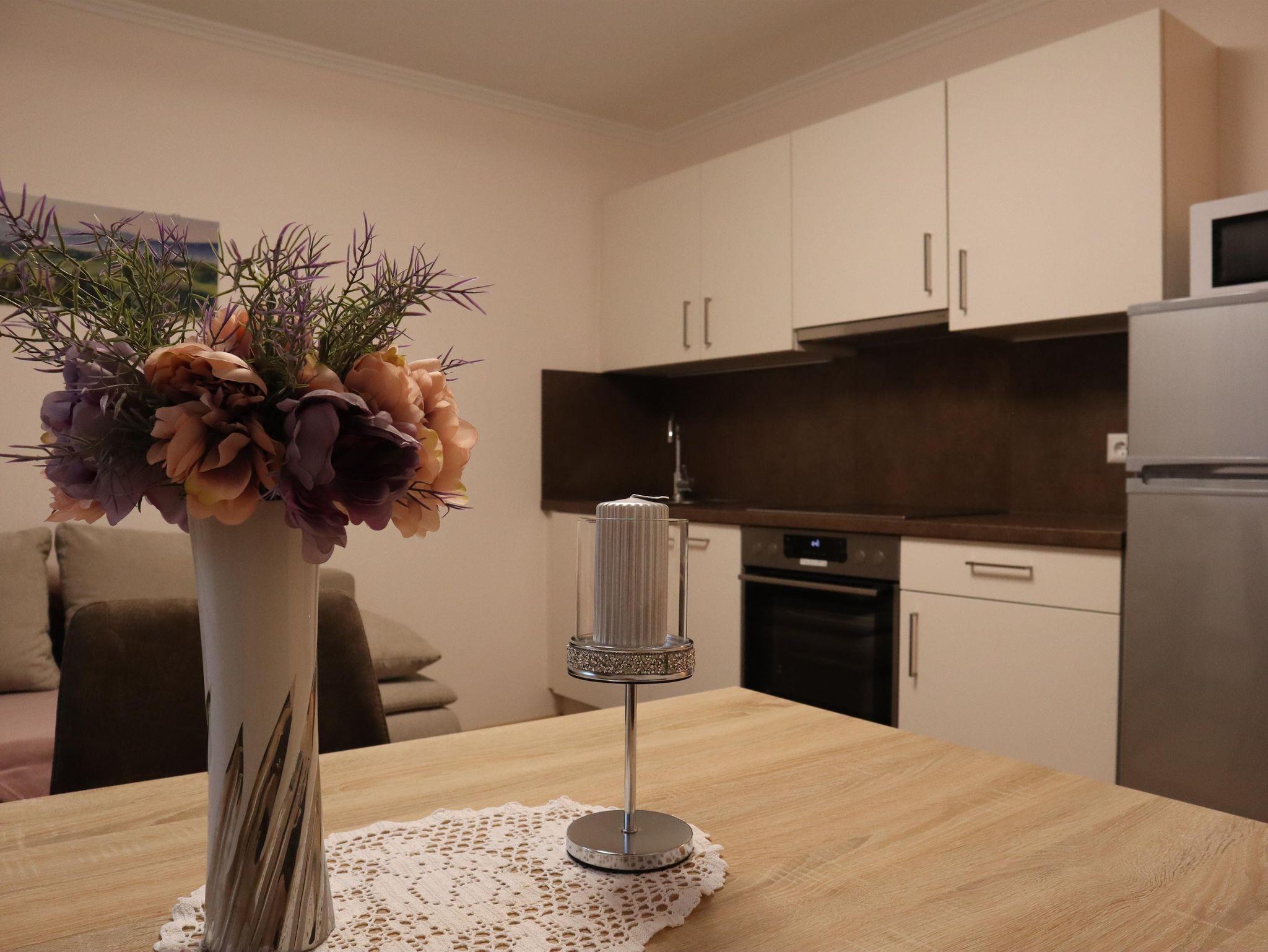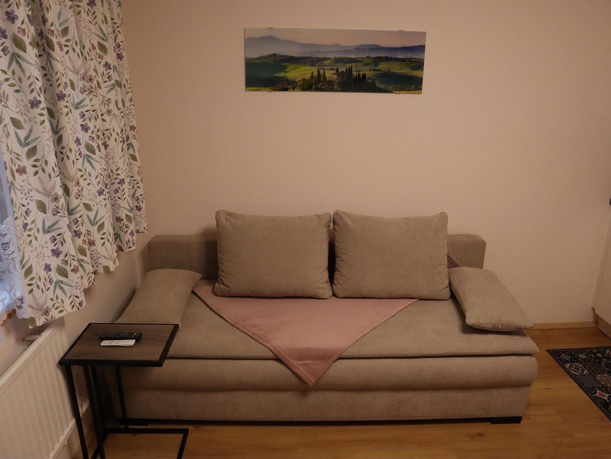 Außerdem gibt es einen Esstisch mit 4 Stühlen, eine ausziehbare Couch (max. 2 Personen) und einen Fernseher in der Wohnküche. Die Wohneinheit bietet auch einen Zugang zur Terrasse. Das Appartement hat auch 1 Badezimmer inklusive Toilette und Dusche, wo auch ein Haarföhn zur Verfügung steht.
