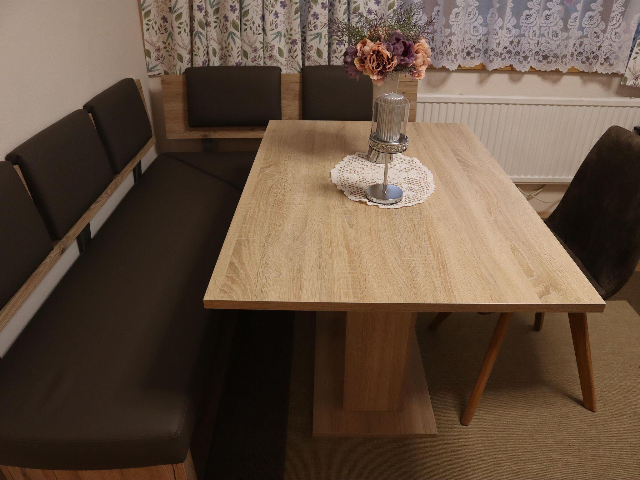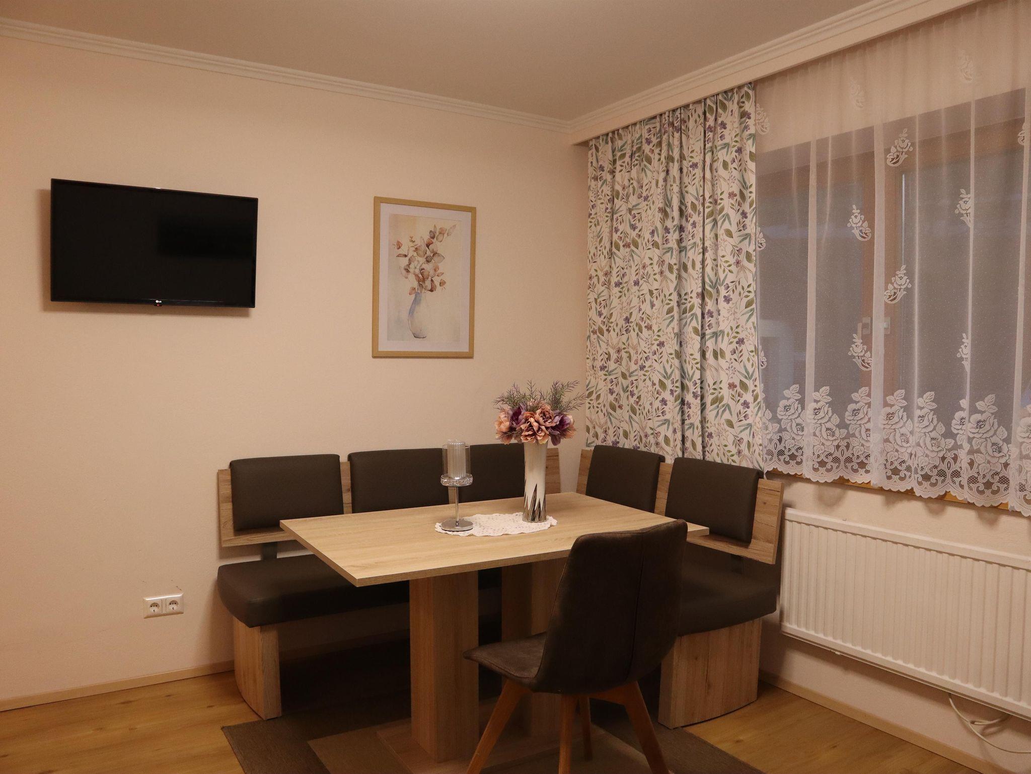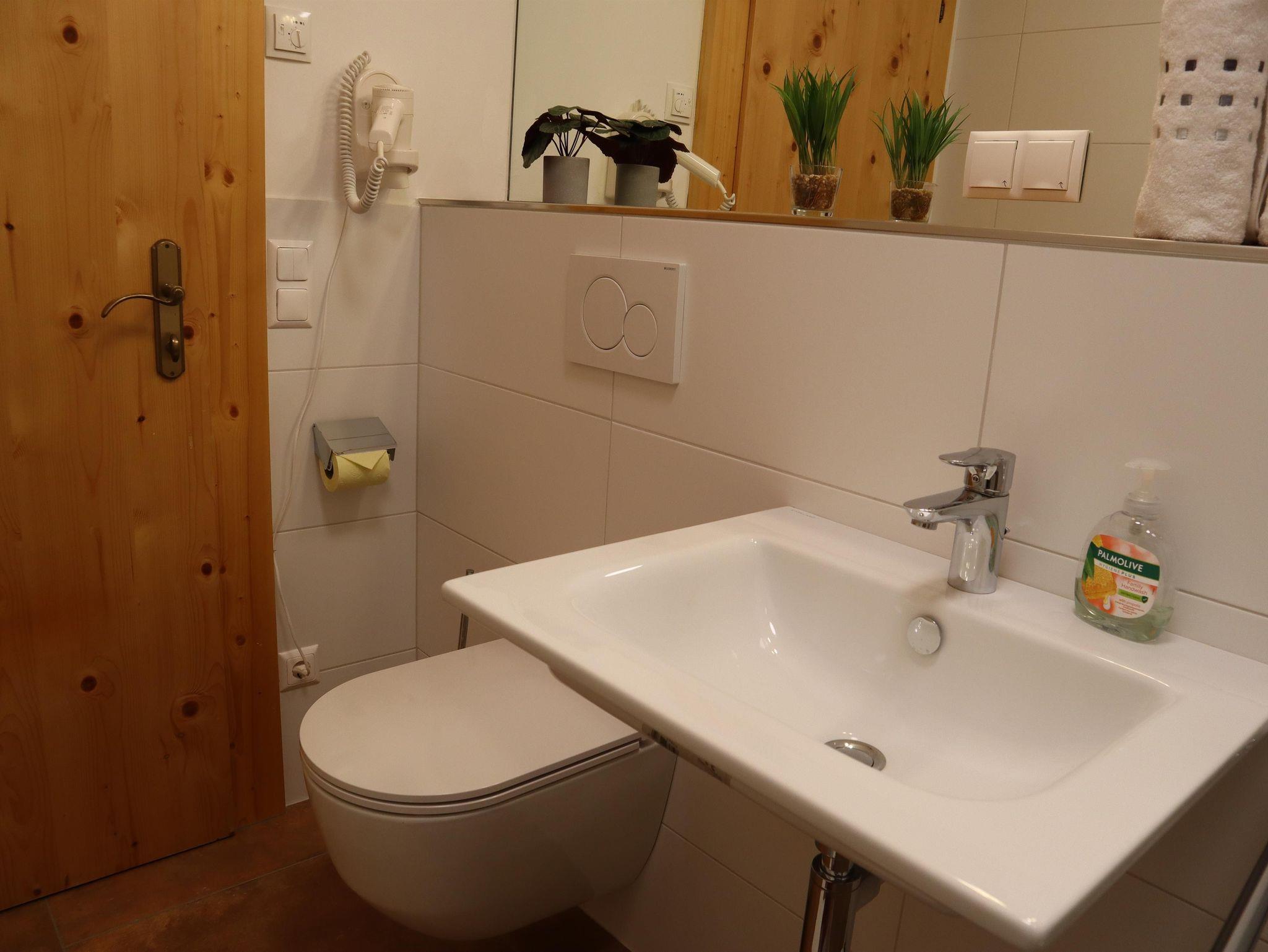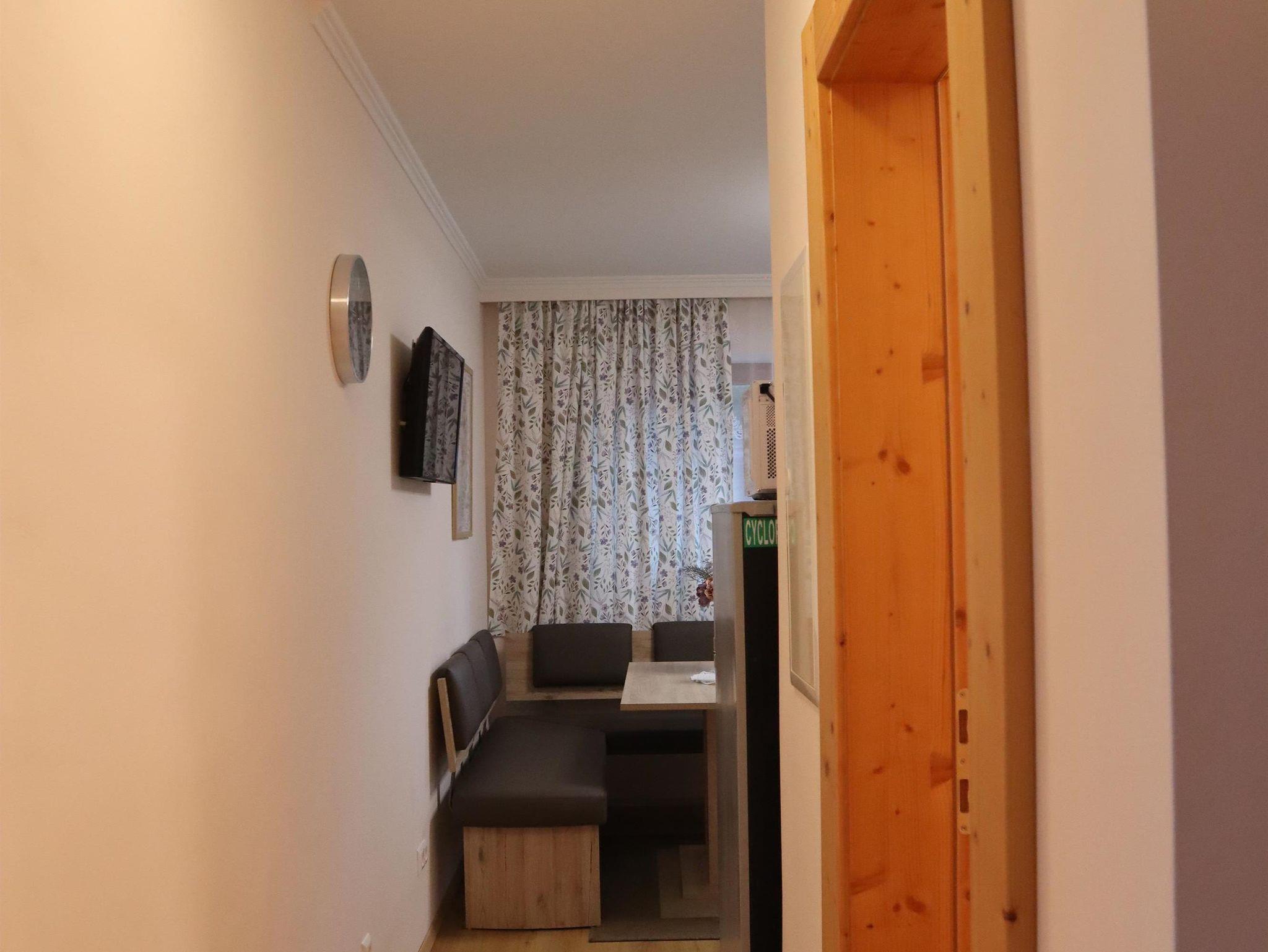 Außerdem gibt es einen Esstisch mit 4 Stühlen, eine ausziehbare Couch (max. 2 Personen) und einen Fernseher in der Wohnküche. Die Wohneinheit bietet auch einen Zugang zur Terrasse. Das Appartement hat auch 1 Badezimmer inklusive Toilette und Dusche, wo auch ein Haarföhn zur Verfügung steht.