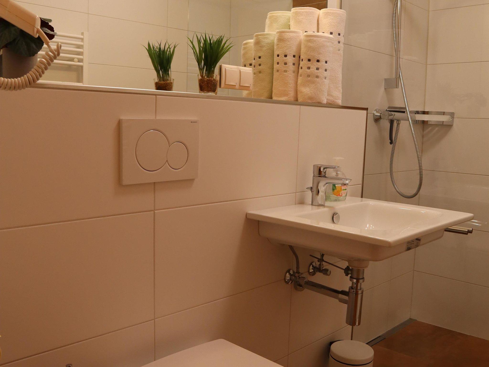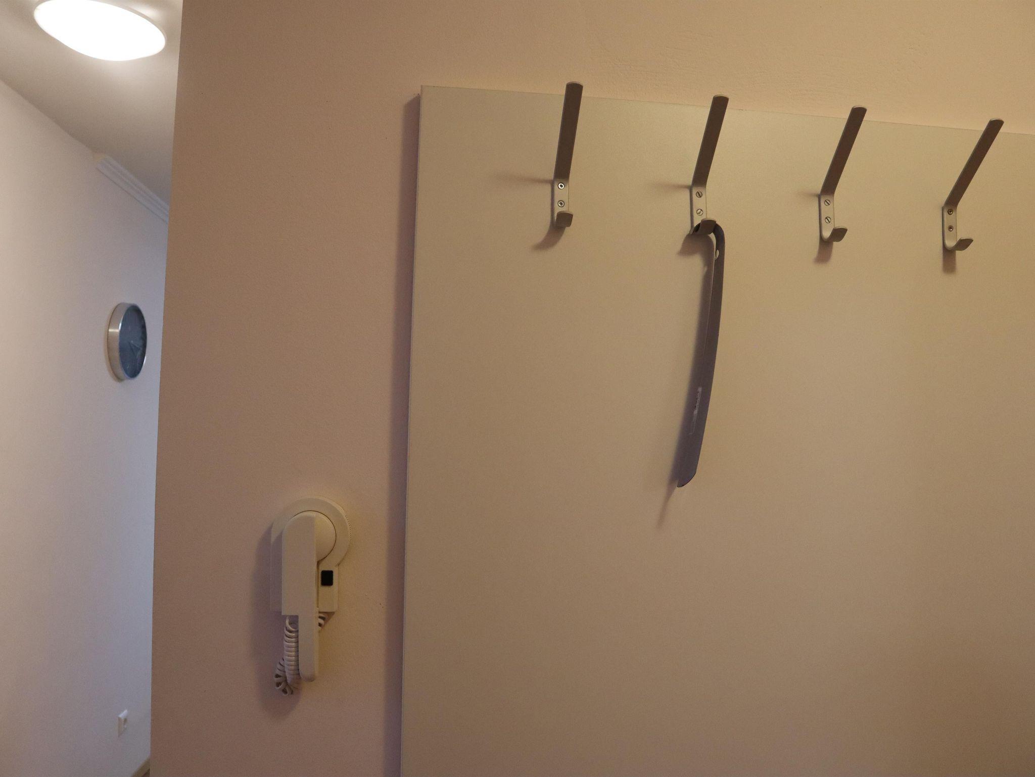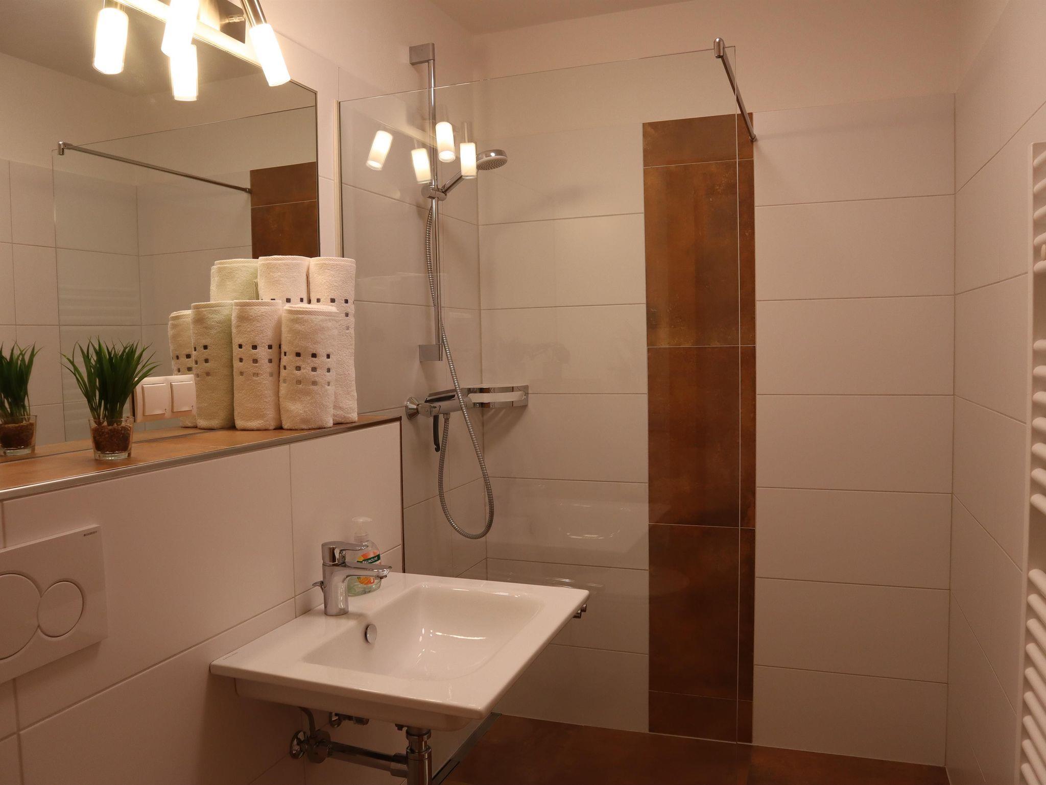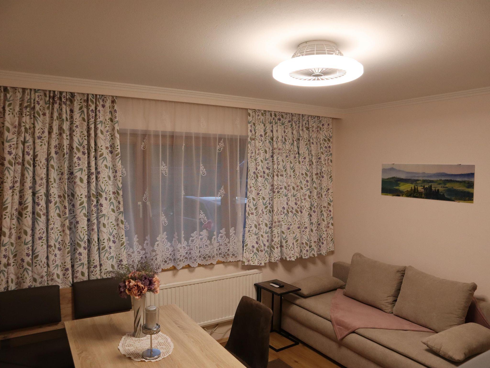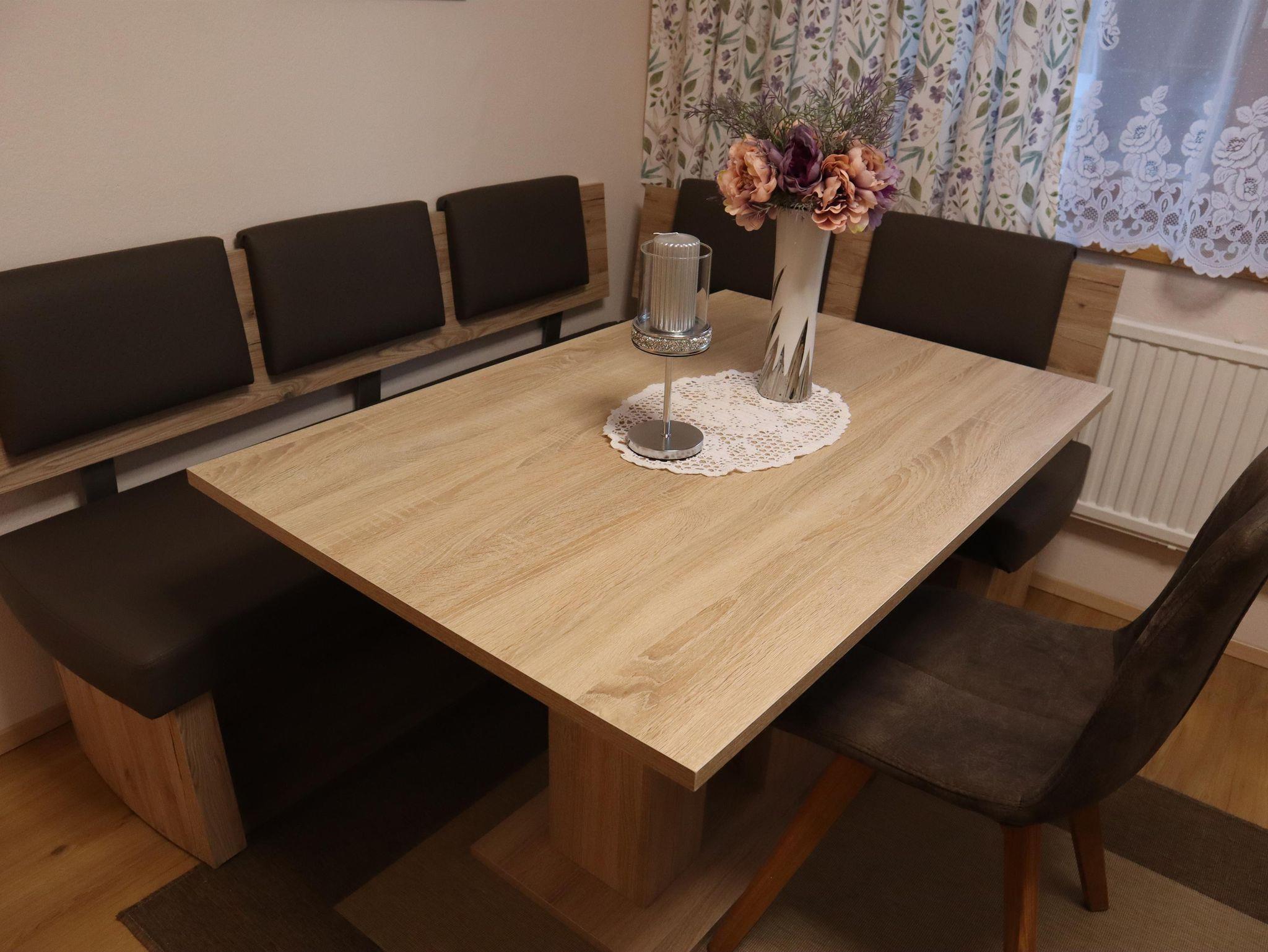 Außerdem gibt es einen Esstisch mit 4 Stühlen, eine ausziehbare Couch (max. 2 Personen) und einen Fernseher in der Wohnküche. Die Wohneinheit bietet auch einen Zugang zur Terrasse. Das Appartement hat auch 1 Badezimmer inklusive Toilette und Dusche, wo auch ein Haarföhn zur Verfügung steht.