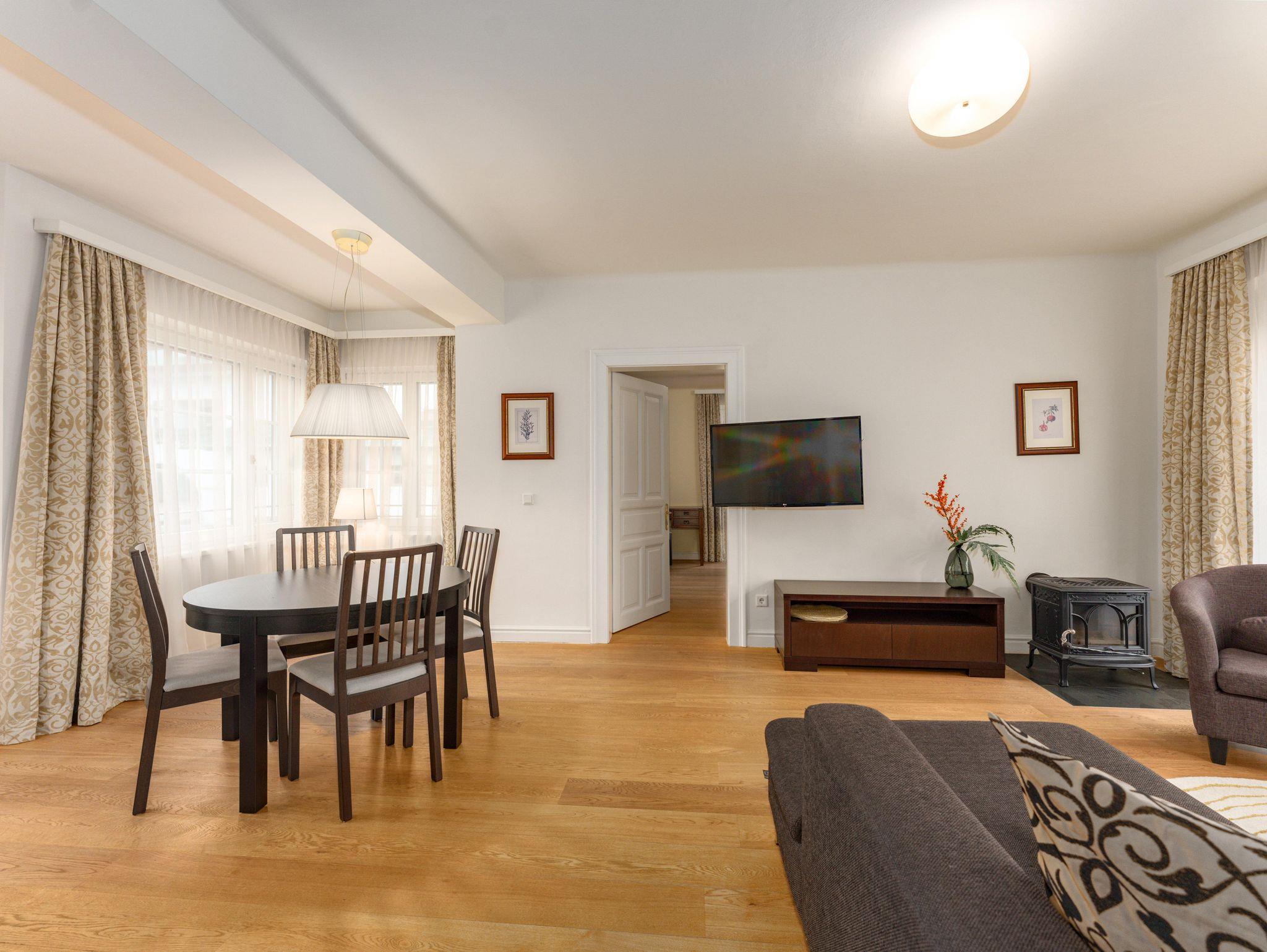 Appartement Cinderella - Ruhige, luxuriöse Wohnatmosphäre in der Altstadt von Schladming Im Rathauspark, nur 200 Meter von der Planet Planai Talstation entfernt und mitten im Stadtzentrum von Schladming, liegt das im 19. Jahrhundert erbaute Haus „Aschenbrödl“ mit dem Appartement Cinderella. Jahrhunderte hindurch war dieses Haus hauptsächlich von Hutmachern und Schustern in Besitz, später auch von Ärzten, und nun im Jahr 2016 wurde dieses Haus komplett renoviert. Das Appartement Cinderella bietet den Gästen vor allem Ruhe sowie eine luxuriöse Ausstattung, eine Symbiose aus Tradition, Moderne und Antik spiegeln sich in der gesamten Wohnung. So treffen Designstücke mit Antikmöbel, moderne Haustechnik wie eine Fußbodenheizung mit klassischen Bodenbelägen wie Marmor oder geöltem Eichenparket aufeinander. Auf 100 m² Wohnfläche überzeugen ein großzügiges, lichtdurchflutetes Wohnzimmer mit komplett ausgestatteter, hochwertiger Küche (E-Herd, Backofen, Geschirrspüler, Kühlschrank inklusive Gefrierfach, Toaster, Wasserkocher, Mikrowelle) mit Essbereich und angenehmen Lederstühlen, 2 separate Schlafzimmer mit Doppelbetten inklusive komfortablen Taschenfeder Matratzen sowie 2 Bäder mit Dusche und WC. Style und Qualität der Produkte hatten hier höchste Priorität. Trotz der top Lage im pulsierenden Stadtzentrum von Schladming kommt die ruhige Wohnatmosphäre nicht zu Kurz. Wünschen Sie also einen ruhigen, erholsamen Urlaub in einem tollen Appartement direkt im Stadtzentrum von Schladming, dann ist das Appartement Cinderella das perfekte Urlaubsdomizil für Sie und Ihre Familie. Ein Parkplatz steht direkt vor dem Haus zur Verfügung. Im Untergeschoss des Hauses finden Sie einen abgesperrten Skikeller inklusive Skischuhtrockner. Lage: zentral in Schladming, 2 Gehminuten zur Planai Maximale Personenanzahl: 4 Appartementanzahl: 1 Highlights: -Haustiere gegen Anfrage Willkommen! -Nespresso Kaffeemaschine (4 Kapseln sind als Begrüßungsgeschenk vorhanden) -Waschmaschine -Kostenfreies Wlan sowie HD Flatscreen mit Kabel-TV (300 Programme) -Matratzen der Firma Hypnos (Lieferant des Buckingham Palasts)