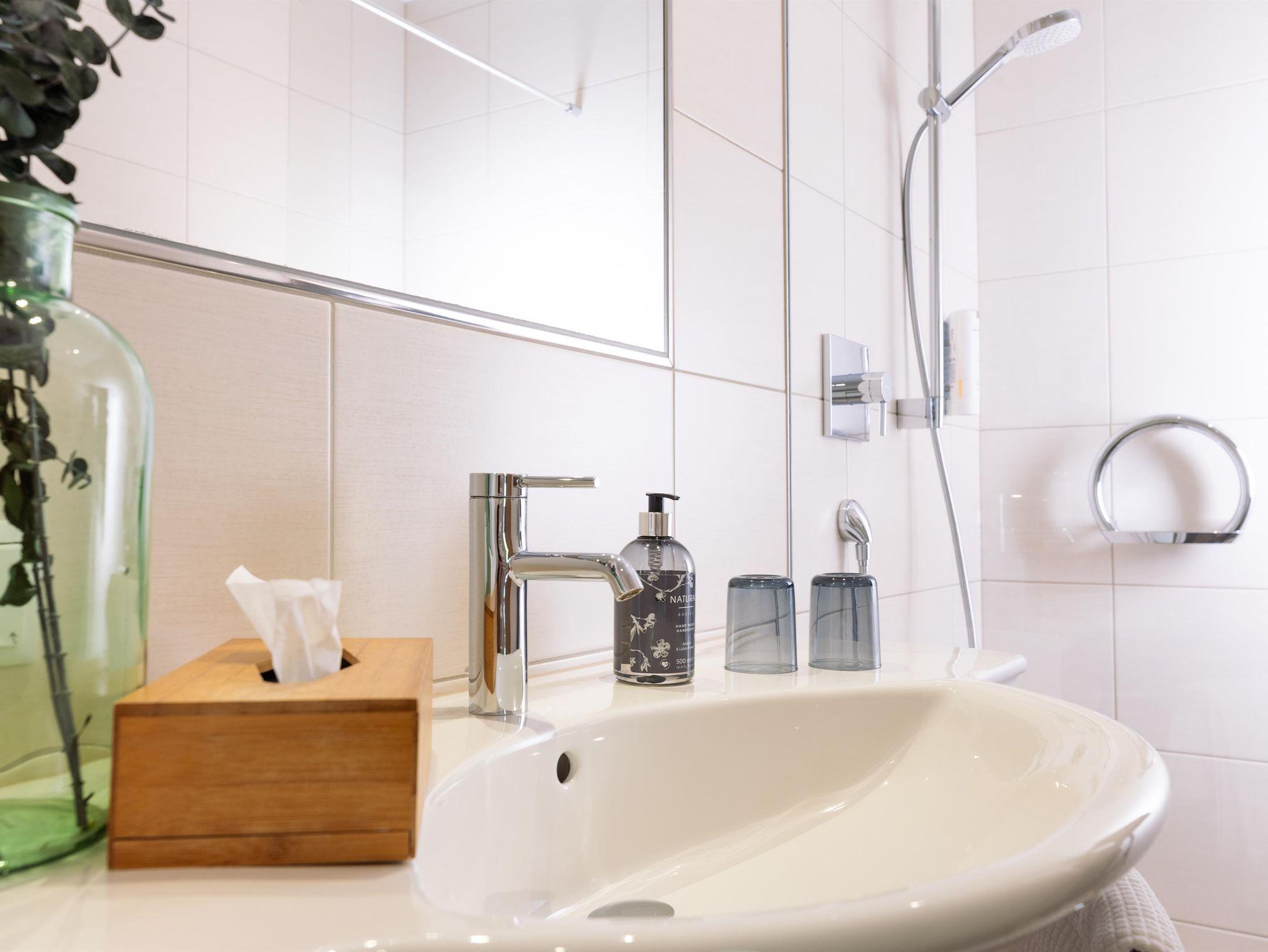 Die Bäder wurden mit Fliesen in Marmor aus der Region gestaltet und das Sofa aus dem typischen Schladminger Loden verleiht dem Zimmer eine gemütliche Atmosphäre.