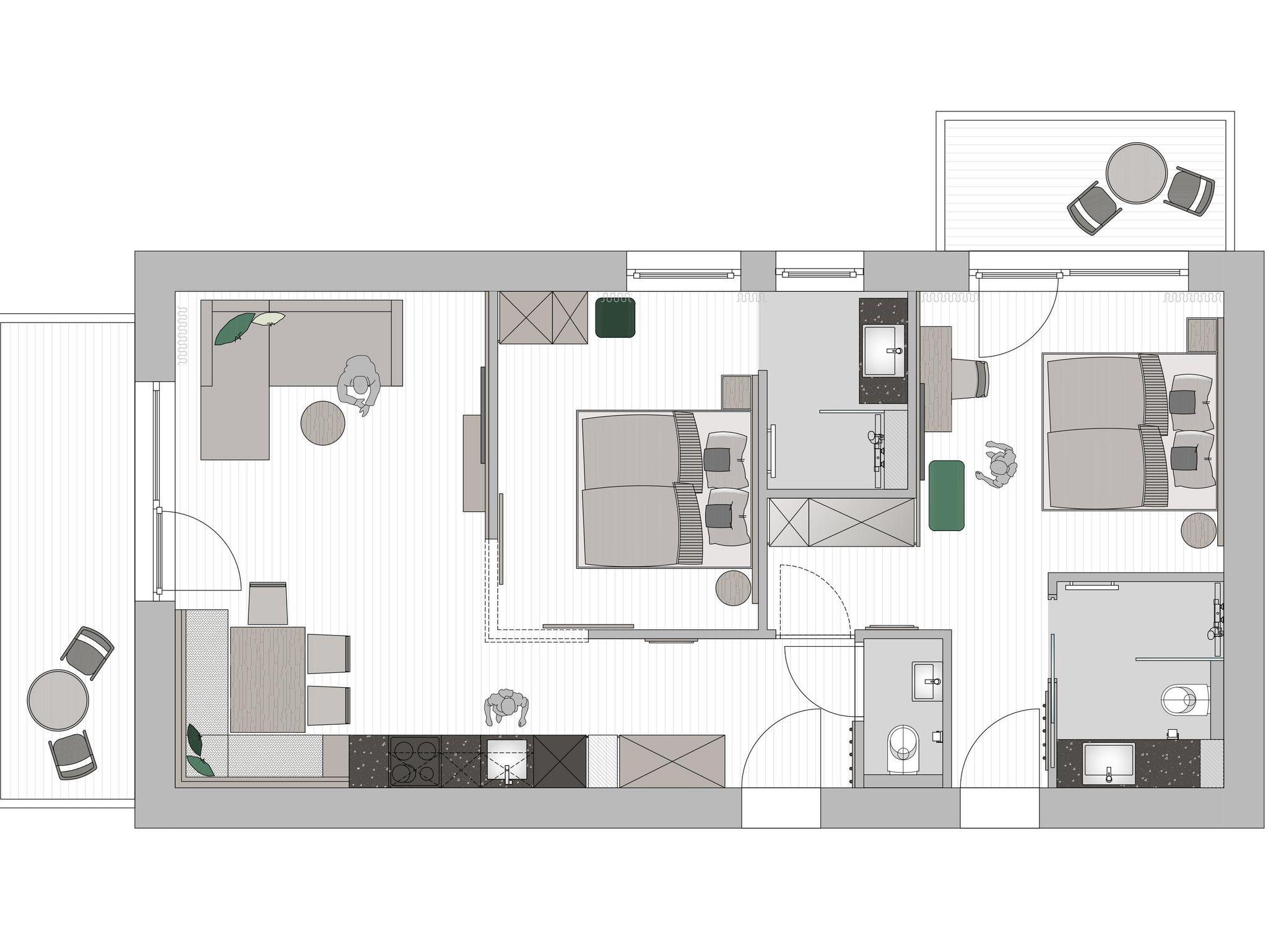 Perfekter Mix aus Holz, großzügigen Glasflächen und modernem Design. Unsere Apartments bieten auf 65m² Raum für bis zu 6 Personen – ideal für Familien oder eine gemeinsame Auszeit mit Freunden.
