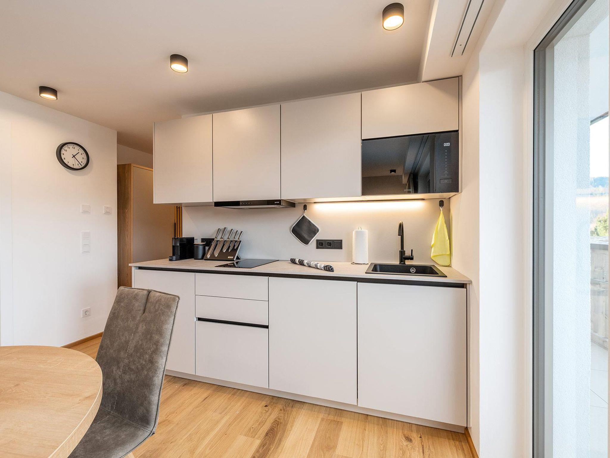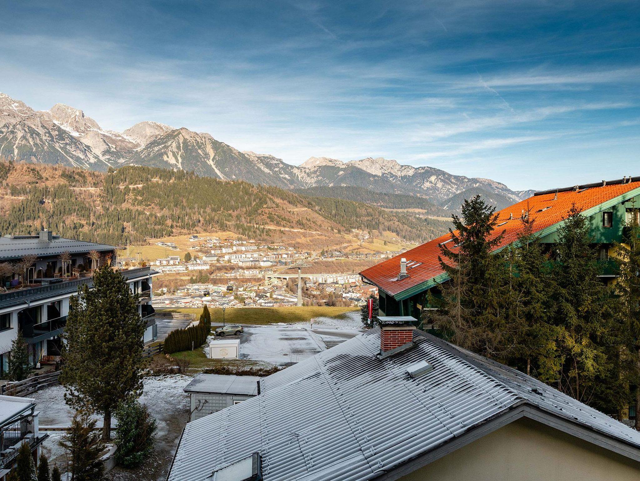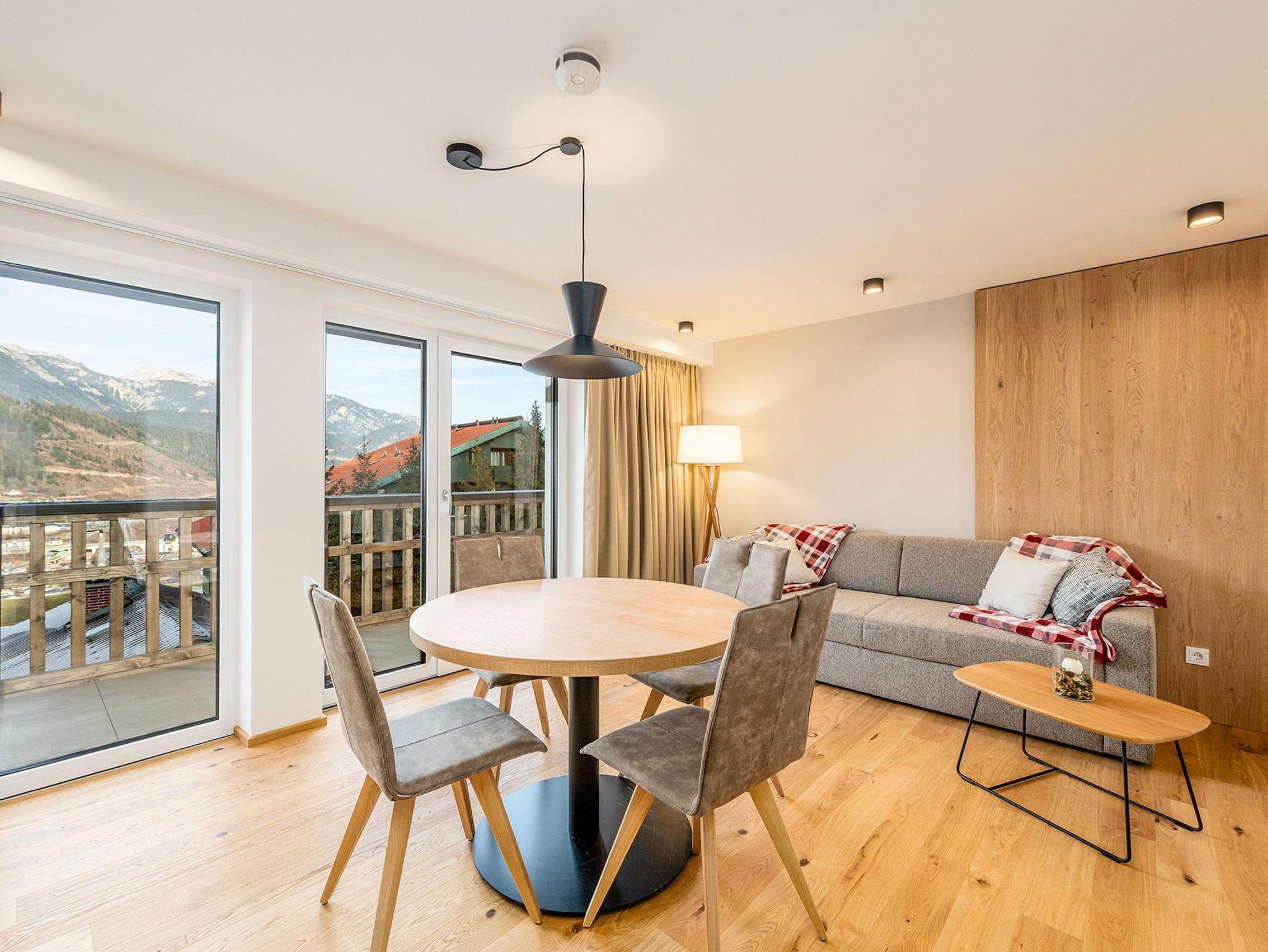 Alle Apartments überzeugen durch geschmackvolle, hochwertige Einrichtung, klare Raumkonzepte und eine angenehme Wohnatmosphäre. Großzügige Fensterflächen eröffnen eindrucksvolle Ausblicke auf die Schladminger Bergwelt – mit Panorama auf das Dachsteinmassiv, die Scheichenspitz und das Guttenberghaus. Je nach Einheit genießen Sie diese Aussicht von einem Balkon oder einer Terrasse – teils hoch über den Dächern der Stadt.