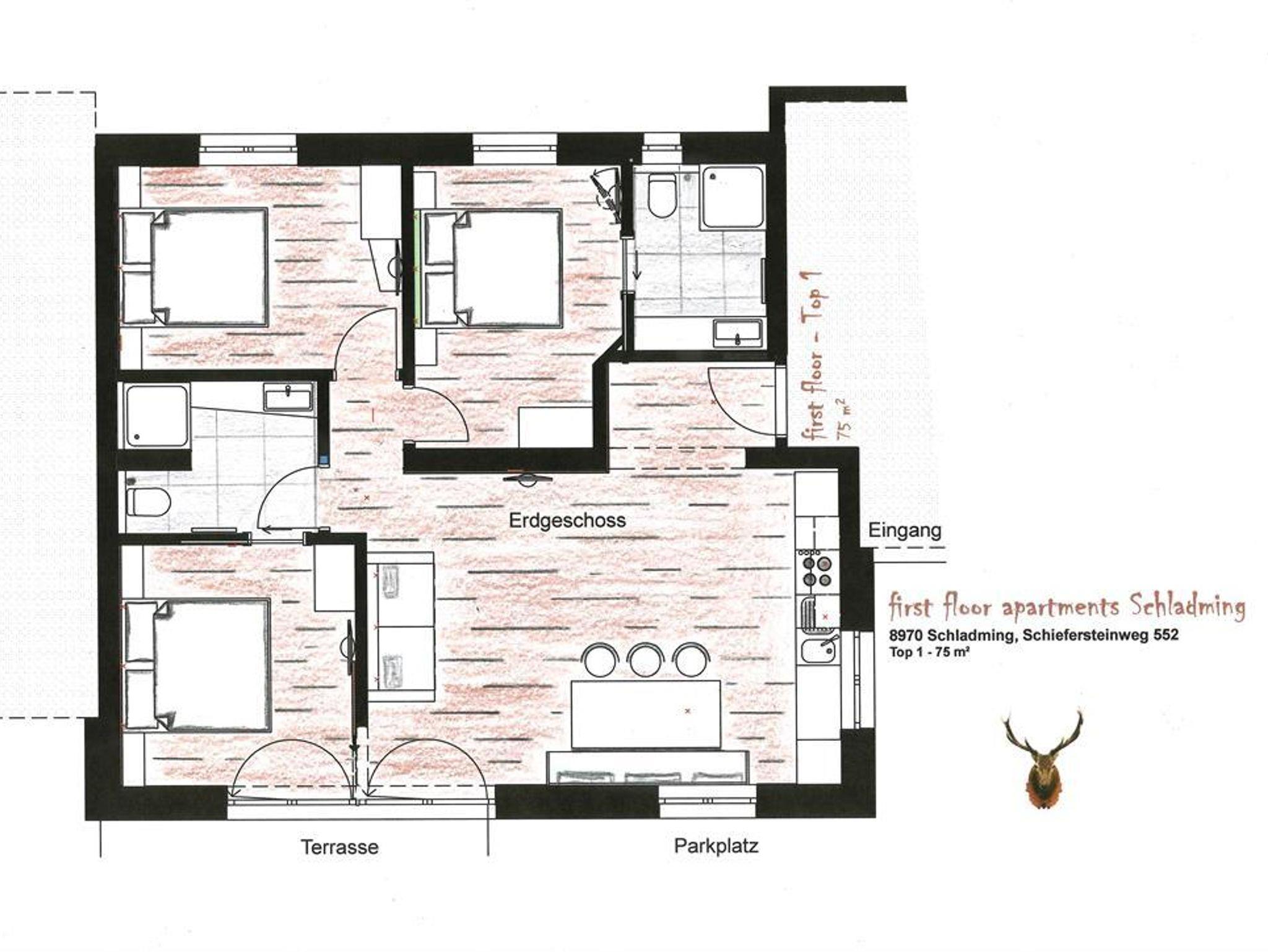 450 Meter zum Planet Planai Stadion, dem Haupteinstieg der 4-Berge Skischaukel, nur 500 Meter in das pulsierende Stadtzentrum von Schladming mit seinen zahlreichen Restaurants, Bars und Shops sowie nahe unzähliger Freizeitaktivitäten, eröffnet das Wohn- & Appartementhaus „Free Feel“ seine Pforten für unsere Gäste. Durch die Toplage, die traumhafte Aussicht auf unsere Berge und überdies dem modernem Interieur gepaart mit Komfort und Gemütlichkeit, garantieren die Appartements im Haus „Free Feel“ einen Wohlfühlurlaub im Sommer wie im Winter. Heimische und hochwertige Materialien vermitteln eine typisch heimelige Gemütlichkeit mit modernem-alpinen Touch. Geboten werden 2 separate Appartements, die insgesamt Platz für 12 Personen bieten. Top 1 bietet auf einer Wohnfläche von 75m² Platz für 6-8 Personen und Top 2 auf 2 Etagen 36m² Platz für 2-4 Personen. In beiden Appartements erwarten Sie Annehmlichkeiten wie großzügige Wohnräume, separate Schlafzimmer, freies Wlan sowie Kabel-TV. Das Top 1 bietet außerdem einen Balkon und kleinen Garten. Wünschen Sie also einen Wohlfühlurlaub in bester Lage, noch dazu autofrei, dann sind die Appartements Free Feel das richtige Urlaubsdomizil für Sie und Ihre Familie / Freunde.