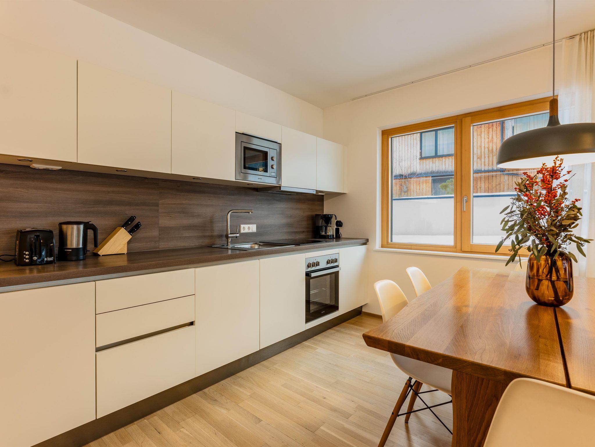 3 miteinander verbunden Häuser 38 servicierte Appartements, von 40m² Studios, Appartements mit einem, zwei oder drei Schlafzimmern bis hin zu 130m² Penthäusern, herrlichen Ausblick und Top Ausstattung inklusive! Die hochwertige Grundausstattung der Appartements mit heimischen Materialen wie Holz, Stein und Glas vermitteln ein modernes Wohlfühlambiente mit viel Licht und Aussicht, - eine Symbiose aus purem Lebensgefühl und Kraftplatz an der Sonne. Komplett ausgestattete Designküchen, großzügige Wohnräume zum Teil mit offenem Kamin, moderne & stylische Möbel, kostenfreies WLAN, Kabel TV in allen Schlaf- und Wohnräumen sowie moderne und lichtdurchflutete Badezimmer, lassen für den Gast, der seine private Freiheit schätzt, keine Wünsche offen .