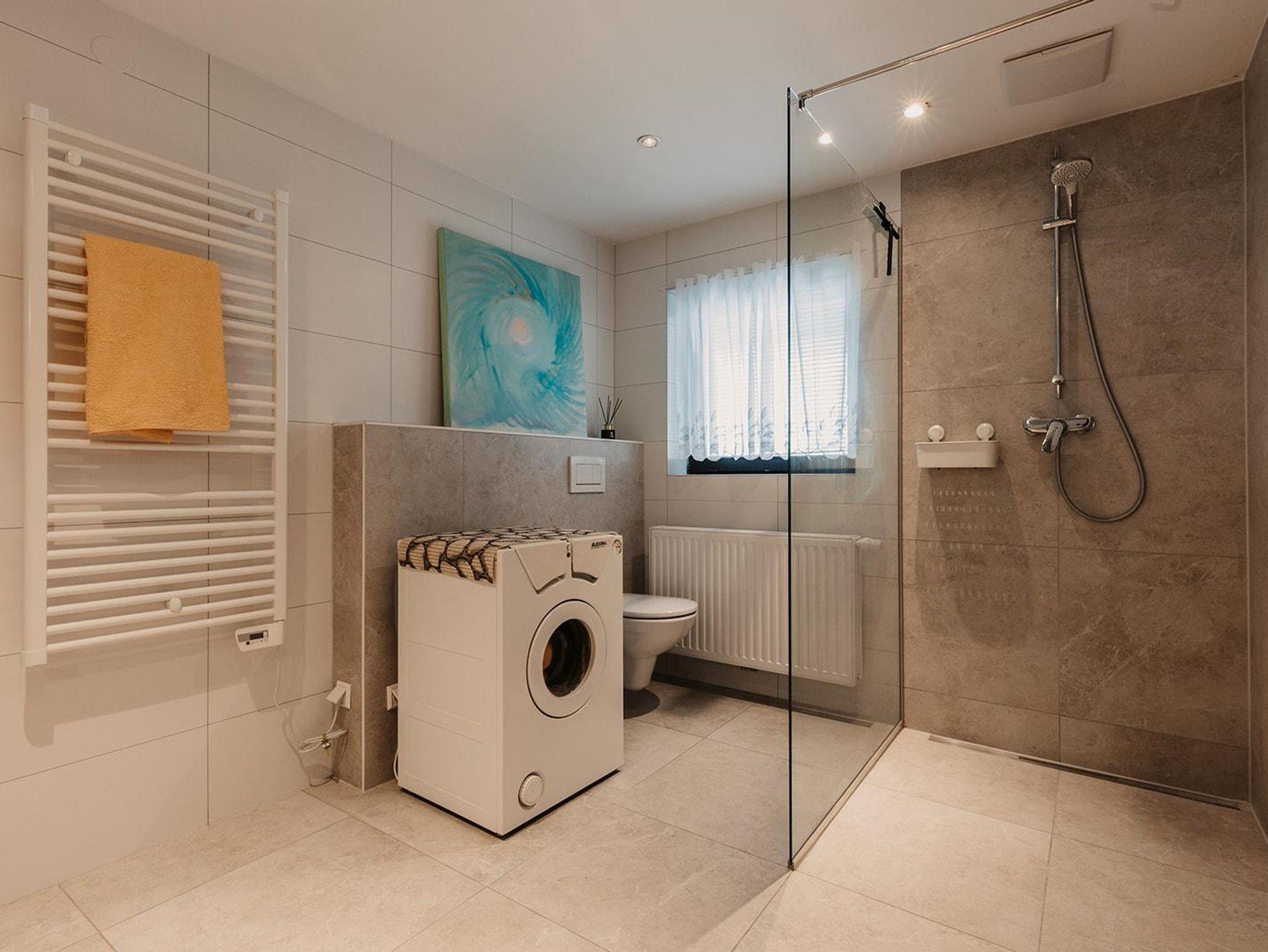 Im Badezimmer mit Dusche ist auch eine Toilette, Waschmaschine und Doppel-Waschbecken. Hand- und Badetücher sind vorhanden.