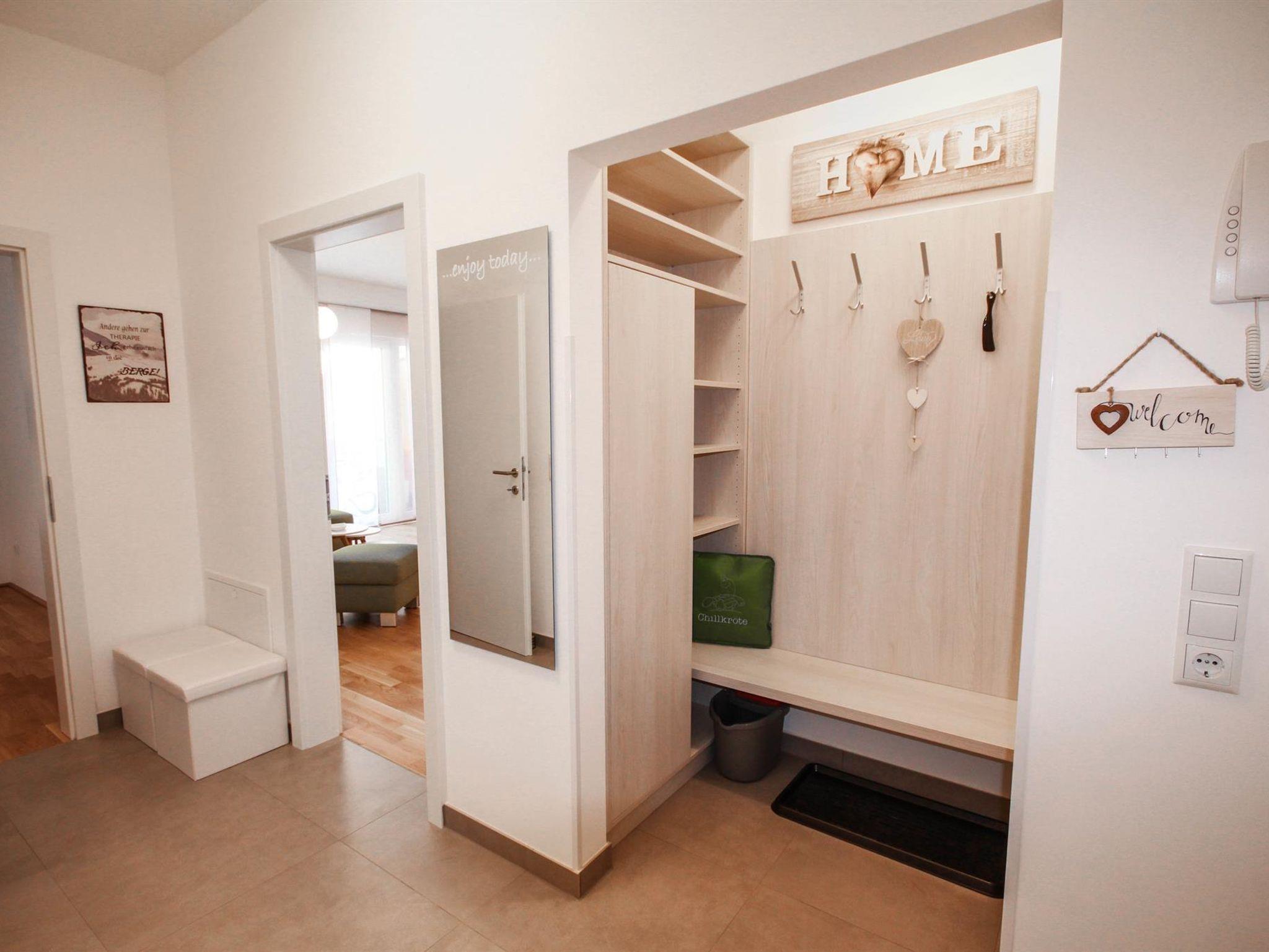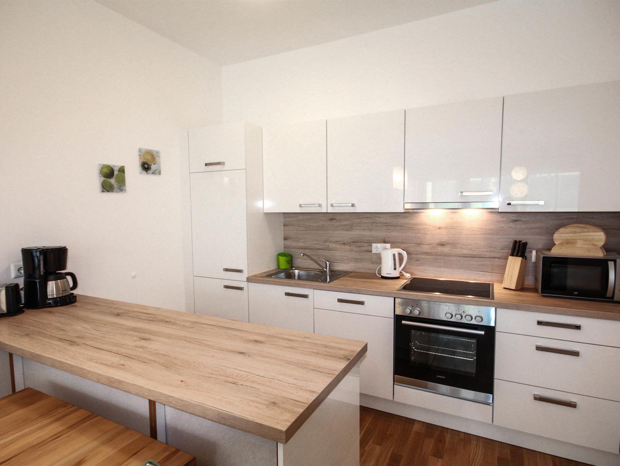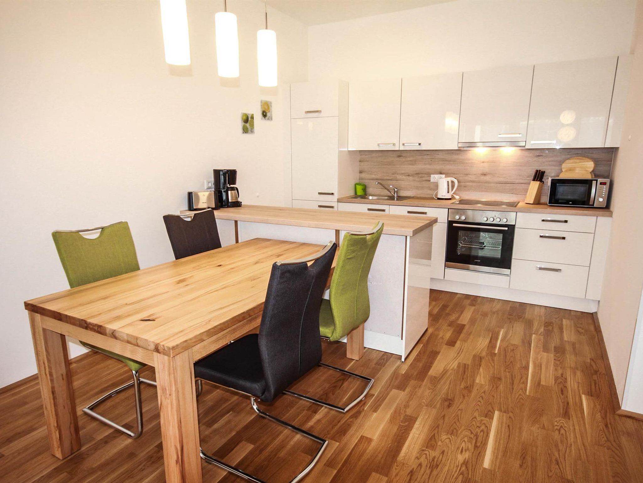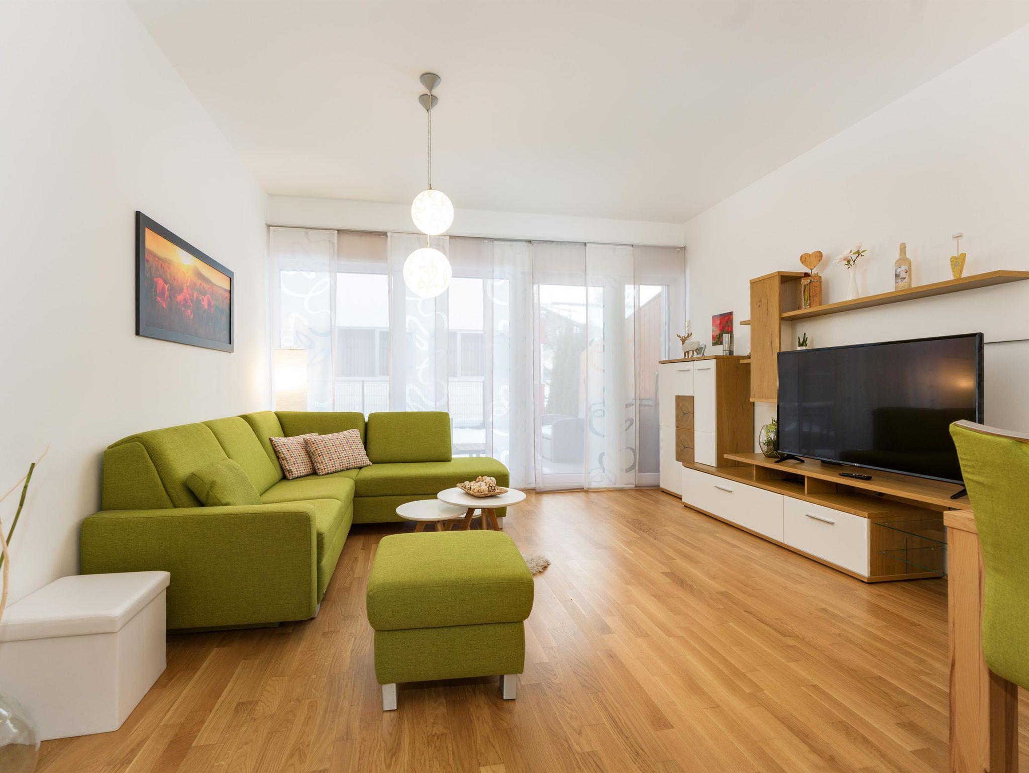 Top 2: 60 m² App. im Erdgeschoss für 2-4 Personen, voll ausgestattete Wohnküche mit Esstisch, Schlafsofa für 2 Personen und TV, 40 m² Terrasse mit Lounge- und Gartenmöbel, ein separates Schlafzimmer mit Doppelbett und TV, ein Badezimmer mit Dusche, eine separate Toilette, 1x Tiefgaragenparkplatz.